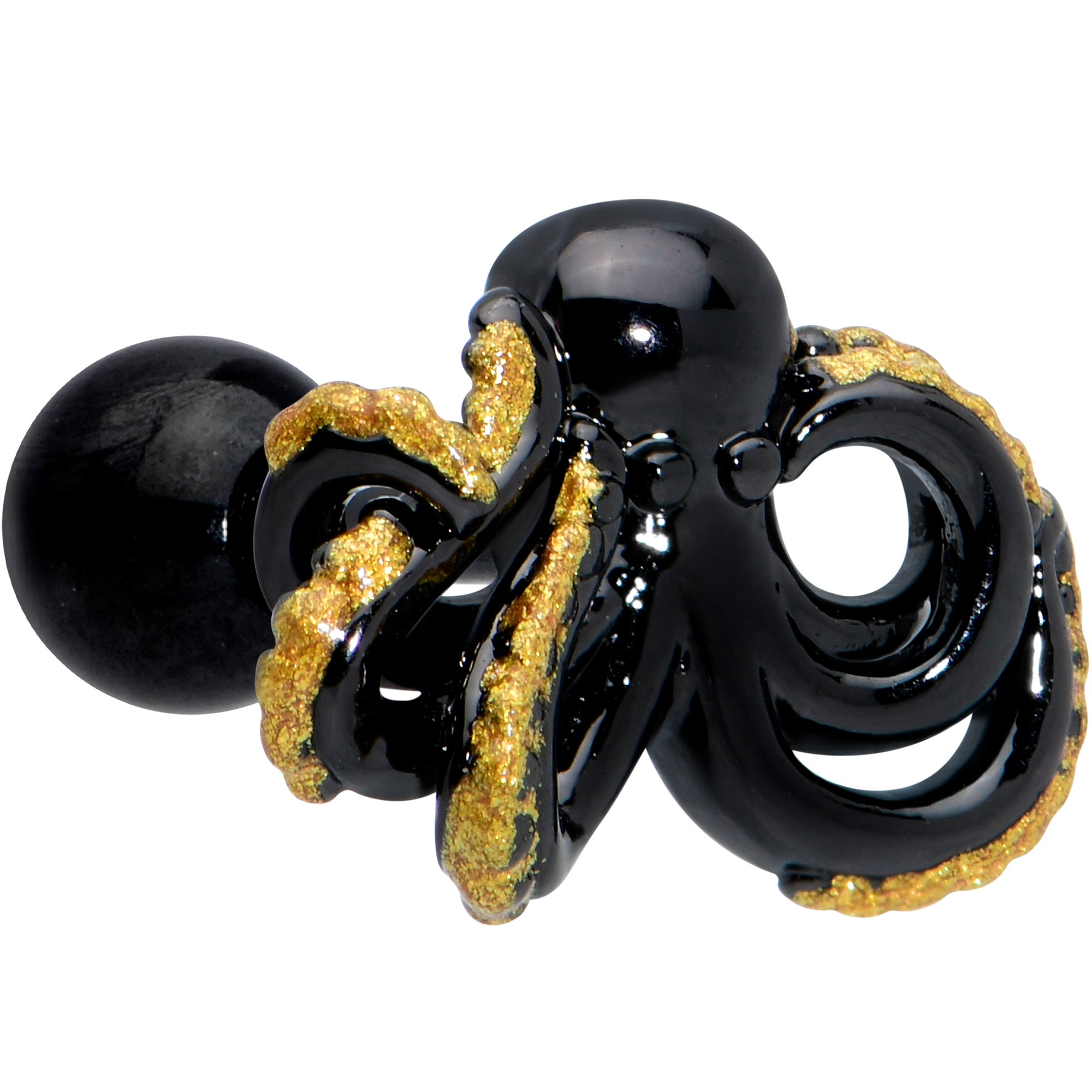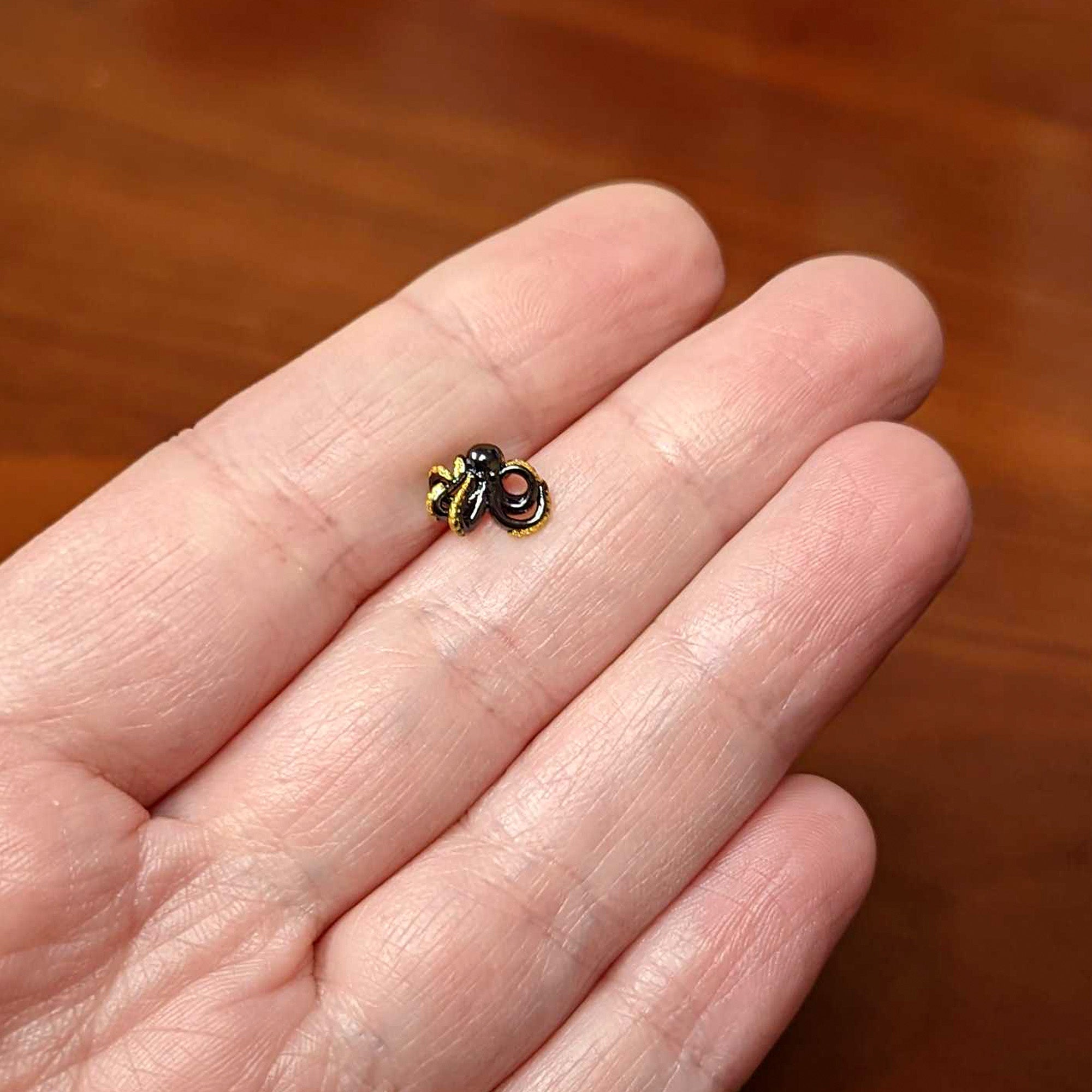Release the kraken with this 16 gauge tragus stud! It's made with a 6mm black PVD over 316L surgical grade stainless steel straight barbell with a 4mm ball end. It features an octopus charm with simple features. It's embellished with added color on the tentacles to really bring out the textured details. You can even rock it in multiple piercings including tragus, helix, and some conch piercings. You'll want to give this cephalopod a giant hug with this awesome octopus cartilage stud!