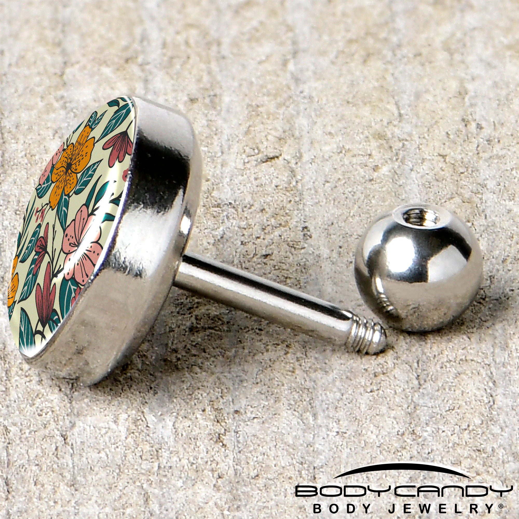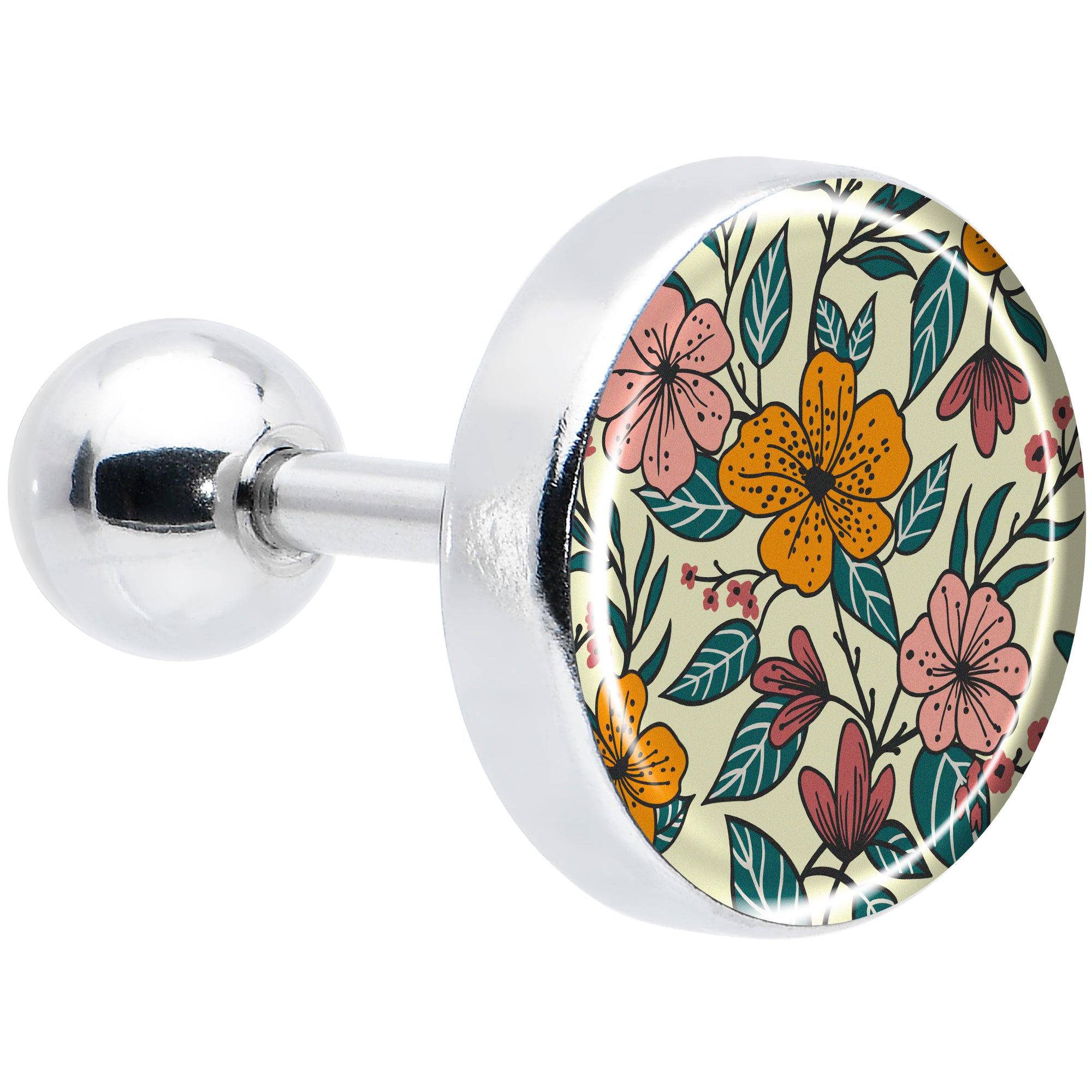 This 16 gauge artist hand drawn flower cartilage jewelry is part of our new line of Blossom Creations body piercing jewelry for the season. This 6mm tragus stud is made with a 316L surgical grade stainless steel straight barbell with a 4mm ball end. It features a logo inlay charm with an array of earth-toned wildflowers. You can even rock it in multiple piercings including tragus, helix, and some conch piercings. Get a little wild and let style bloom with this fabulous floral cartilage piercing jewelry.