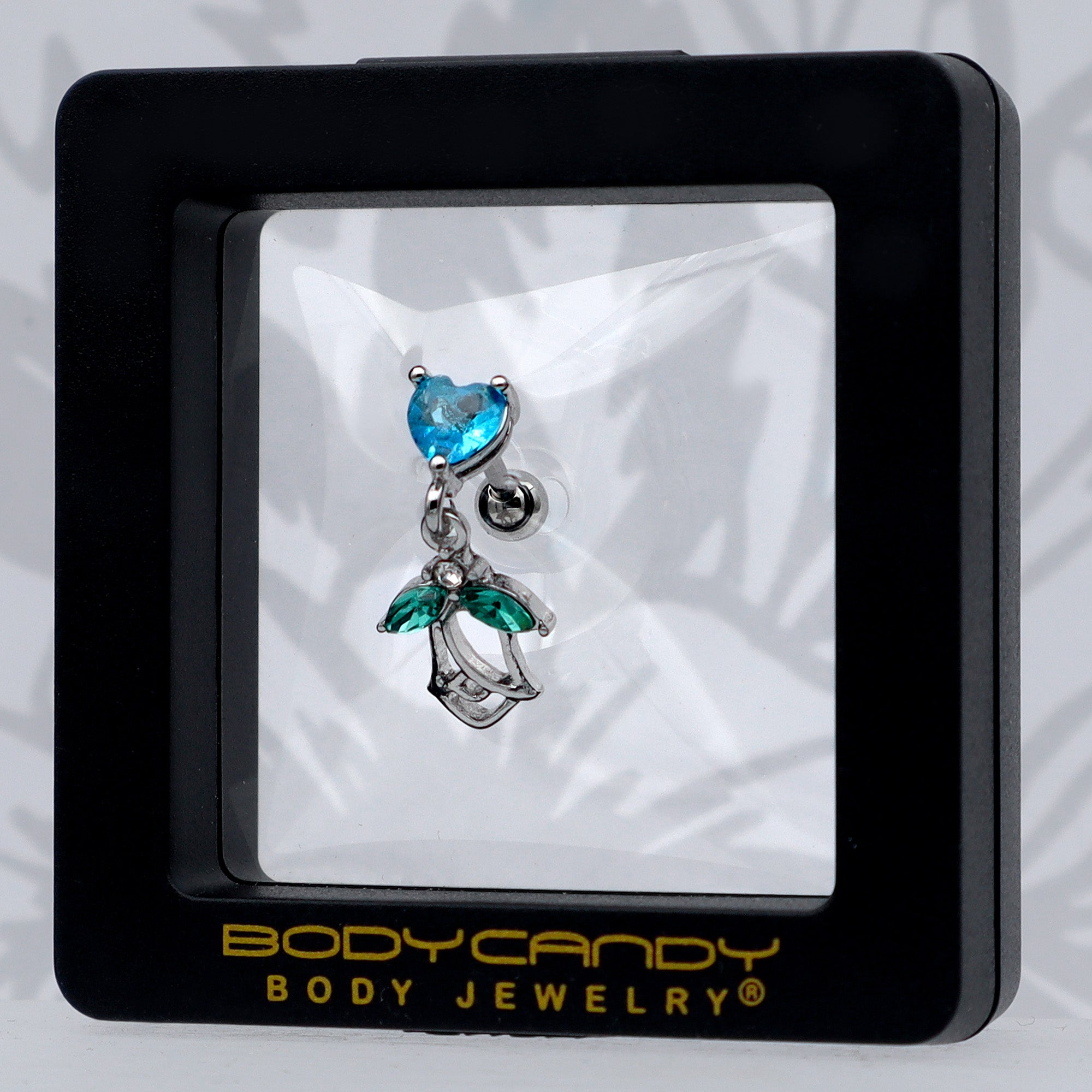 16G 1/4 Blue CZ Gem Heart And Rose Dangle Cartilage Earring