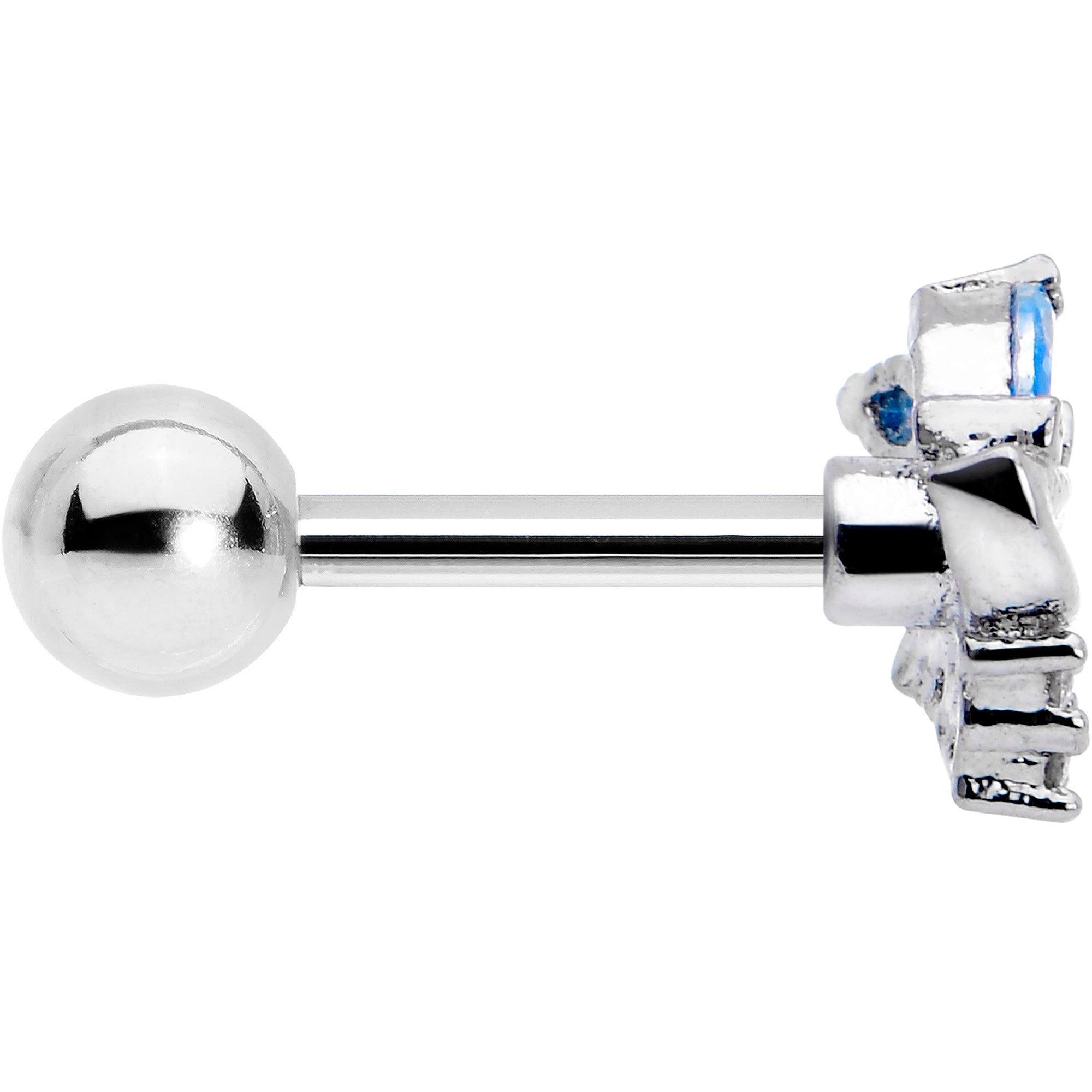You're sure to be a fan of this 16 gauge tragus stud. It's made with a 6mm durable 316L surgical grade stainless steel straight barbell with a 4mm ball end. It features a pair of blue cubic zirconia gem fanned out and set above a swirl embellishment. At the base are clear cubic zirconia gems for an added touch of style. You can even rock it in multiple piercings including tragus, helix, and some conch piercings. This cartilage piercing jewelry has so much glamour it'll make your head swirl.
