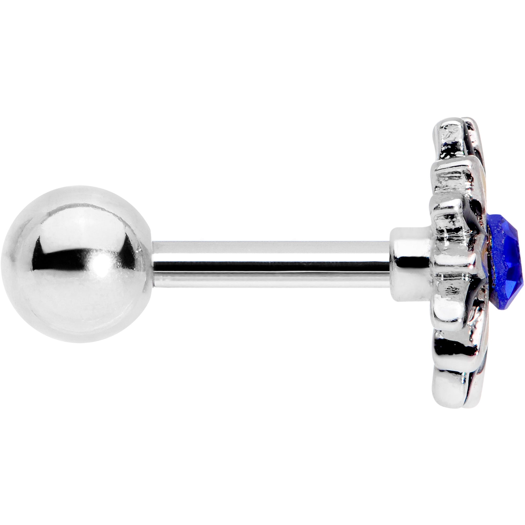 The sun is out...and it's bedecked in blue on this 16 gauge cartilage jewelry! It's made with a 6mm durable 316L surgical grade stainless steel straight barbell with a 4mm ball end. The other end features a yellow sunflower charm with blue detailing between the petals. The center is set with matching blue faux druzy for a look that catches the eye without overwhelming it. And you can wear this flower in multiple piercings including tragus, helix, and some conch piercings. Make every day a sunny day with this striking sunflower cartilage piercing jewelry!