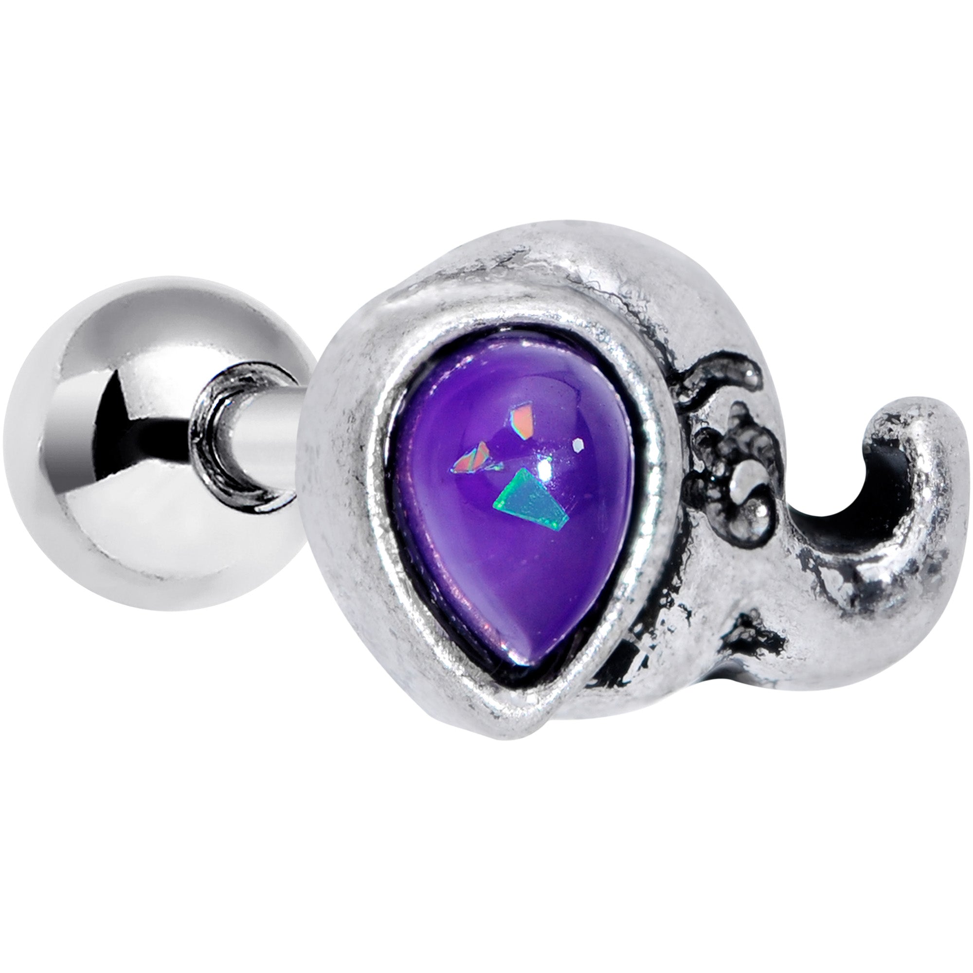 The elephant on this 16 gauge cartilage stud has some serious style! It's made with a 6mm durable 316L surgical grade stainless steel straight barbell with a 4mm ball end. It features an elephant's head charm, with simple detailing for an elegant look. To add a pop of color, its ear is composed of a drop shaped blue faux opal for a very on-trend appearance. And you wear this beauty in multiple piercings including helix, tragus, and some conch piercings. Add a touch of wonderful wildlife to your look with this elegant elephant tragus stud!