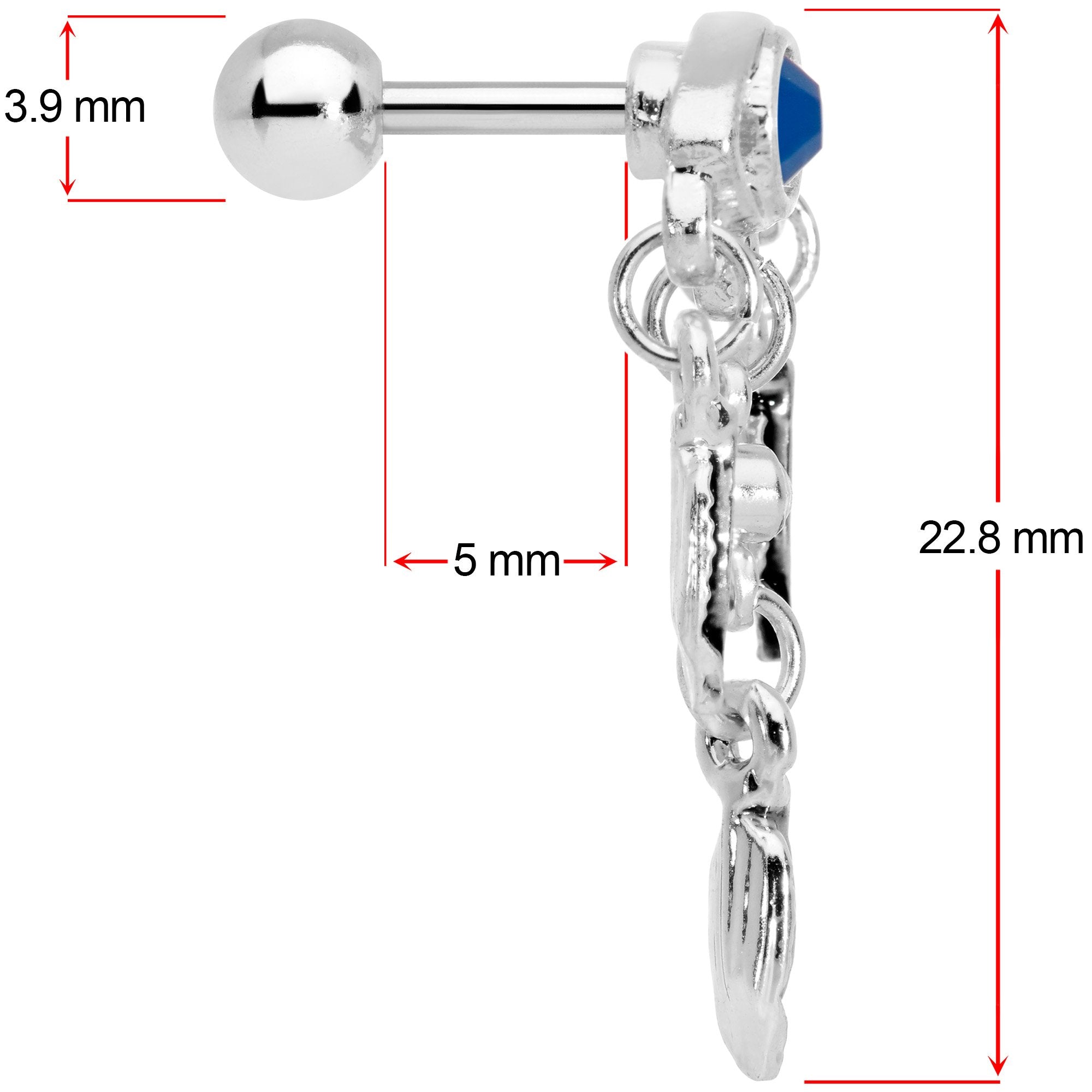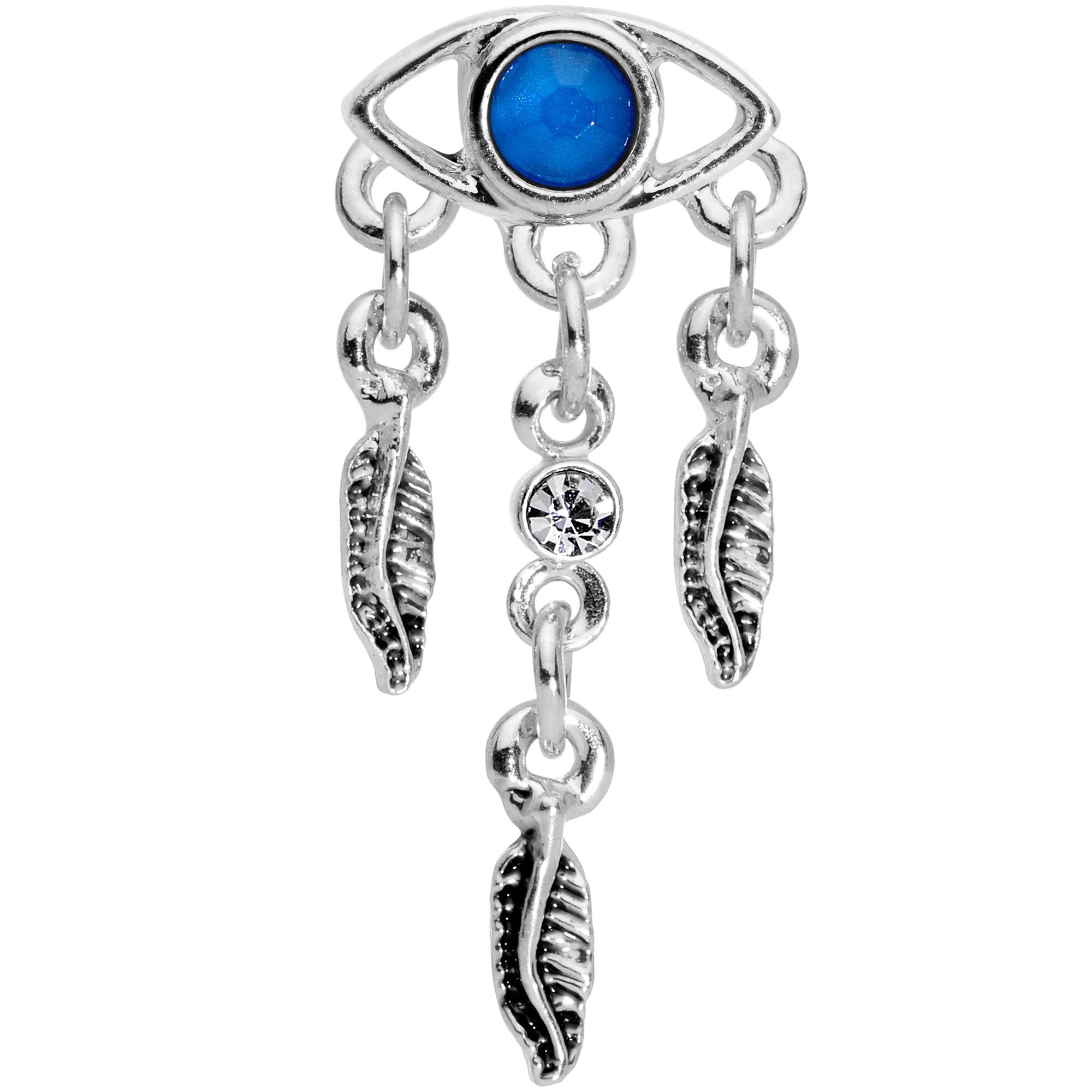 If your goal is to catch the eye of everyone you pass by then you will love this fun 16 gauge cartilage earring. Made with a 6mm durable 316L surgical grade stainless steel straight barbell, this cartilage earring features an eye set with a blue gem and three feather shaped dangles. It fits in multiple piercings, including helix, tragus, and daith. Just remember to mind your manners when you wear it - all eyes are on you!