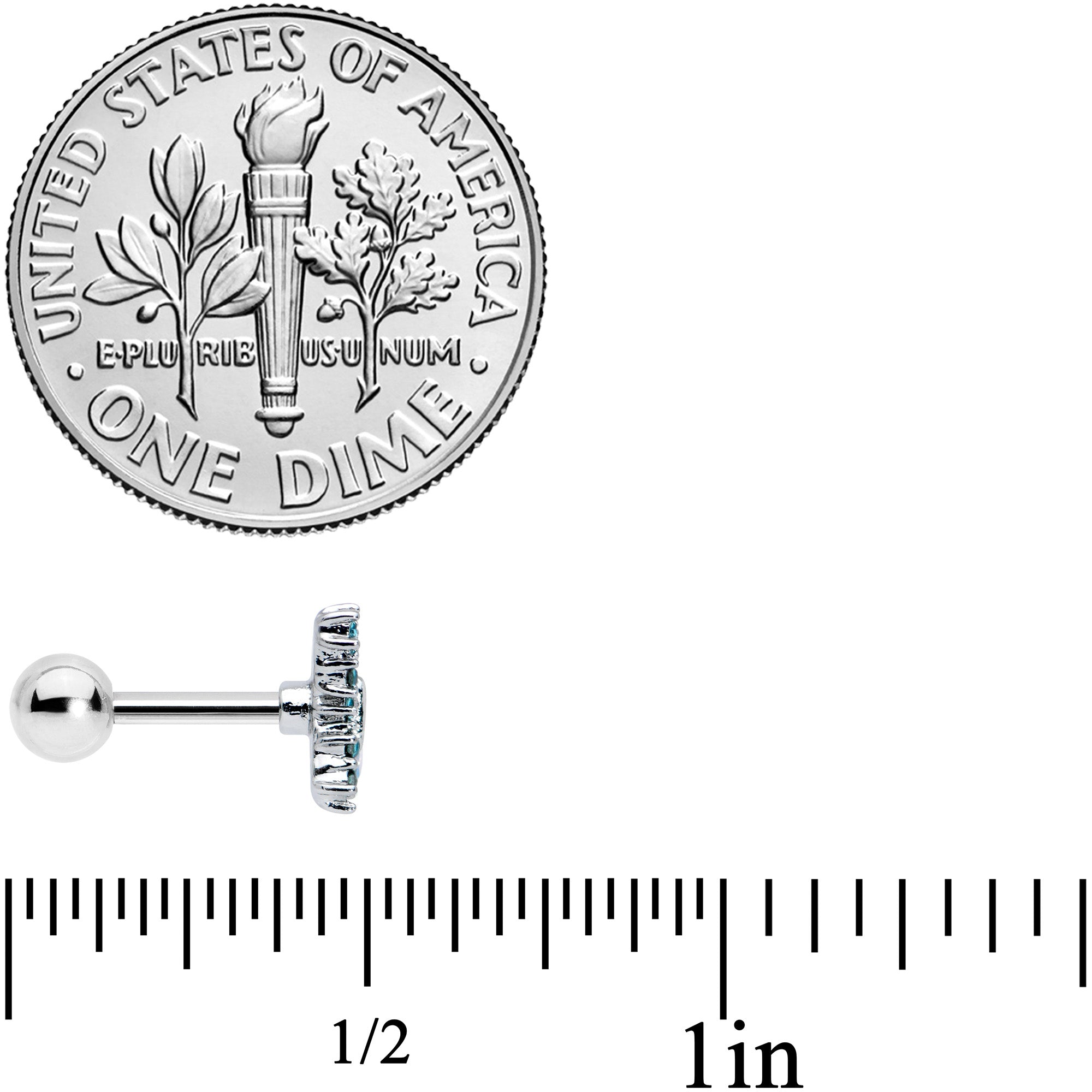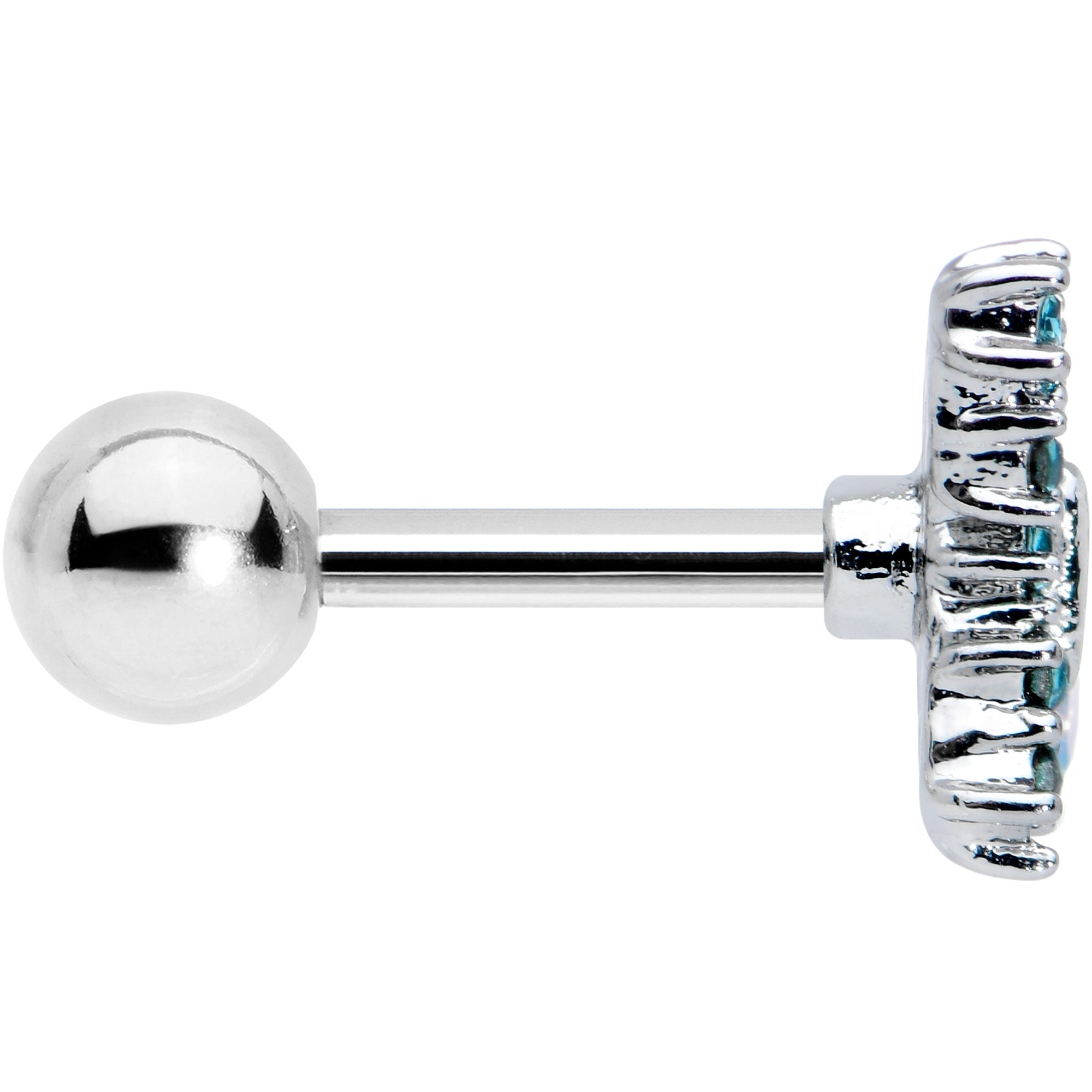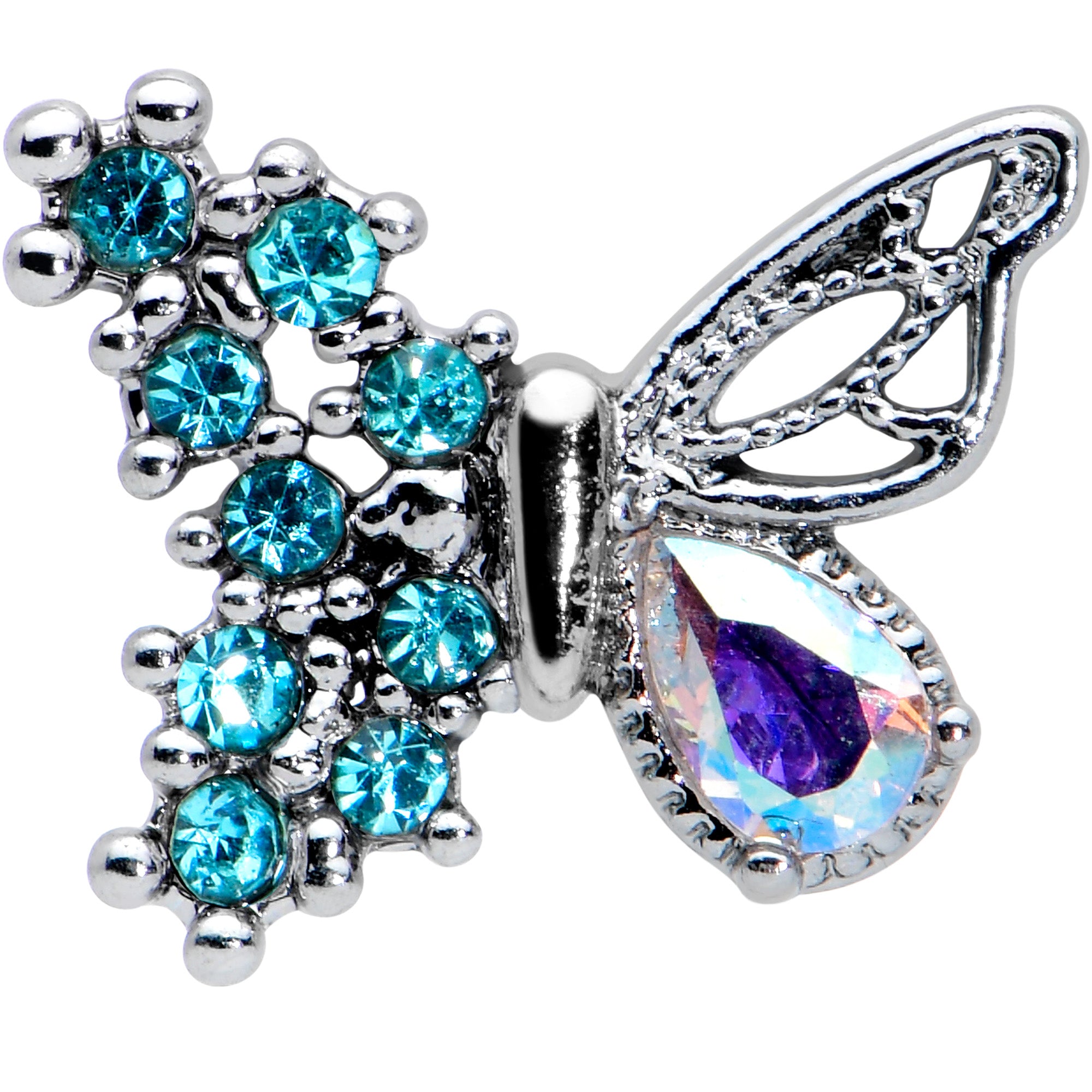 The butterfly on this 16 gauge tragus stud is ready to rock! It's made with a 6mm durable 316L surgical grade stainless steel straight barbell with a 4mm ball end. It features a butterfly charm with one wing paved in small blue gems. The other wing features an aurora gem bottom, with a realistically detailed top. You can even boast this beauty in multiple piercings including tragus, helix, and some conch piercings. Gear up for glamour with this beautiful butterfly cartilage jewelry!