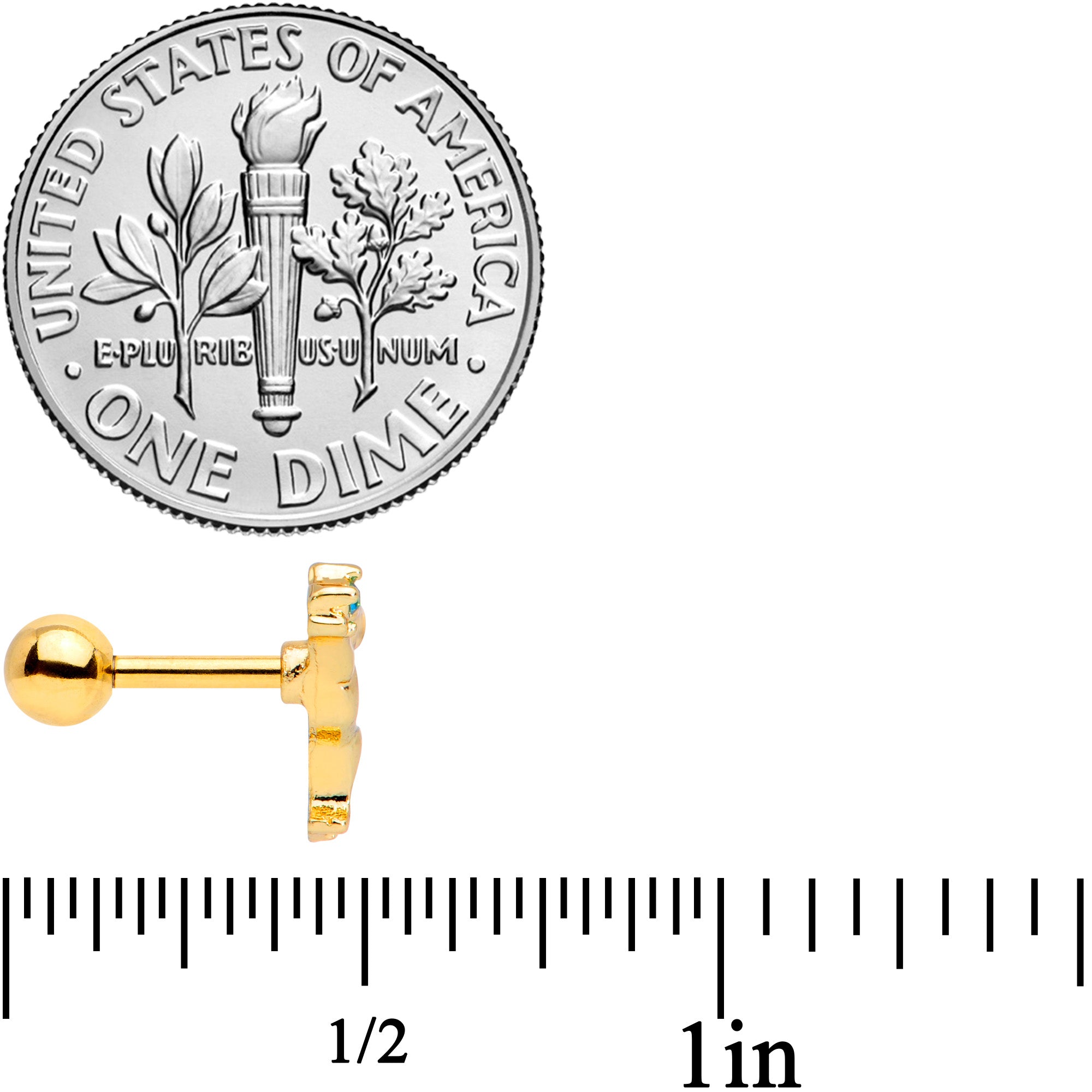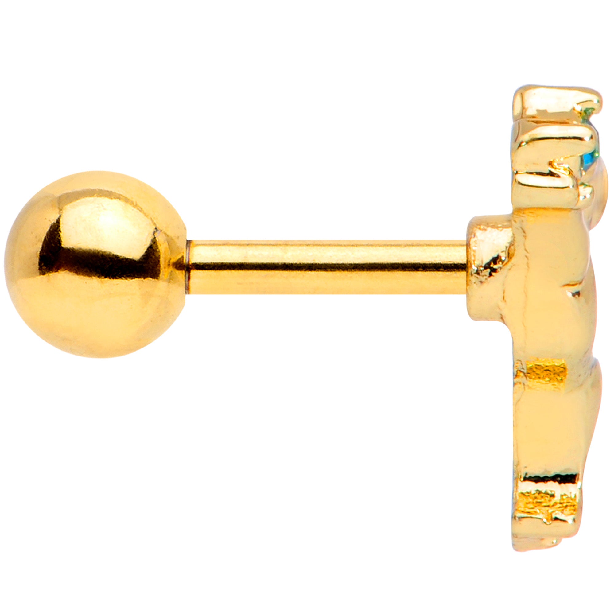It doesn't take much of a leap to realize how gorgeous this 16 gauge cartilage stud will look in the piercings of any cat lover! It's made with a 6mm gold tone anodized over 316L surgical grade stainless steel straight barbell with a 4mm ball end. This tragus earring features a cat charm, leaping to try and catch a tiny blue gem as if the gem were a ball of yarn. And it works well in multiple piercings including tragus, helix, and some conch piercings. Take the leap and get this kitty into your cartilage piercings!