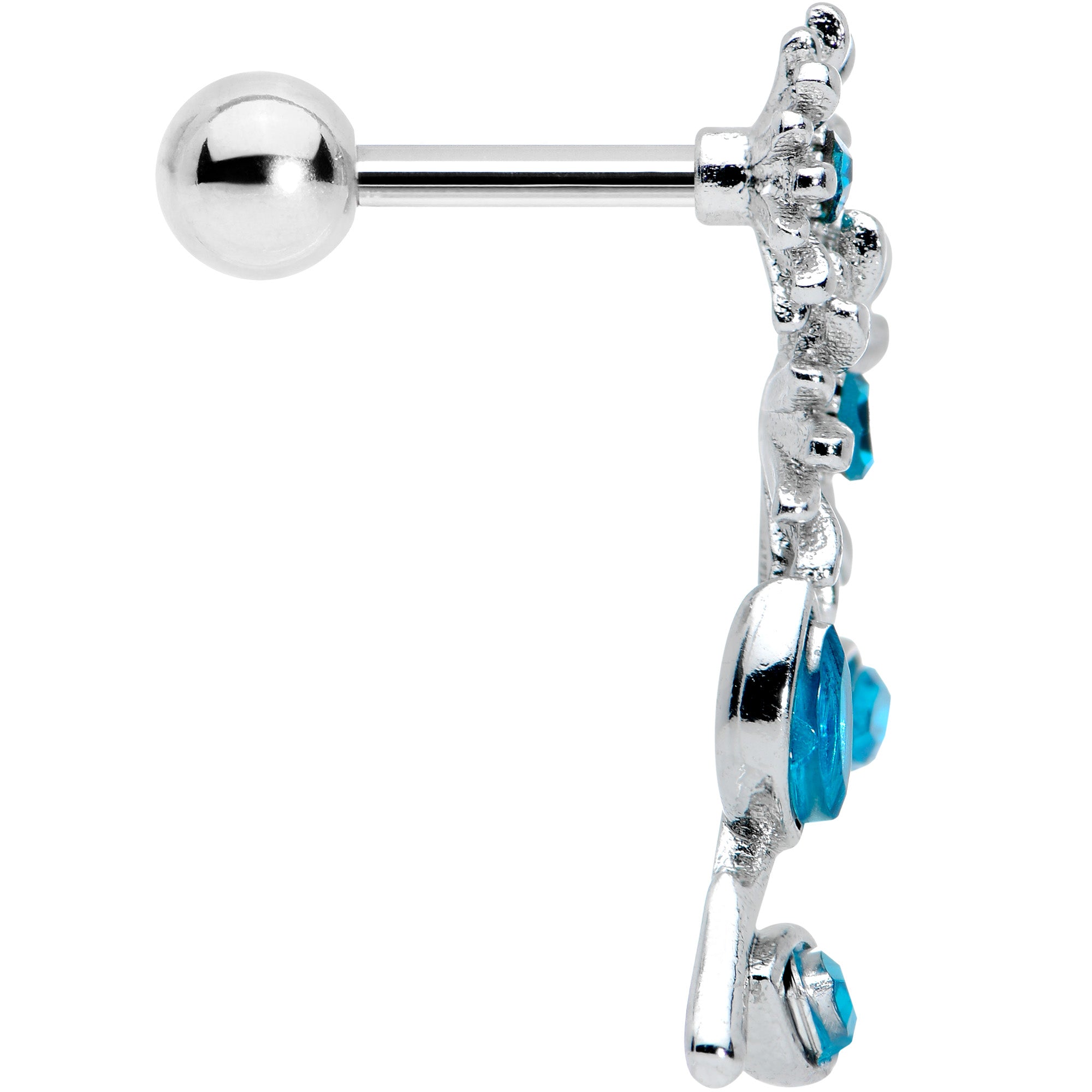 The flowers on this 16 gauge cartilage stud will chase away the blues! It's made with a 6mm durable 316L surgical grade stainless steel straight barbell with a 4mm ball end. It features a sunflower charm of two of the flowers with blue gems set at their centers. It also features a stem with three leaves, each one composed of a single matching blue gem for a cohesive appearance. You can wear it in multiple piercings including tragus, helix, and some conch piercings. Let the sun shine in your piercings when you're wearing this striking sunflower tragus stud!