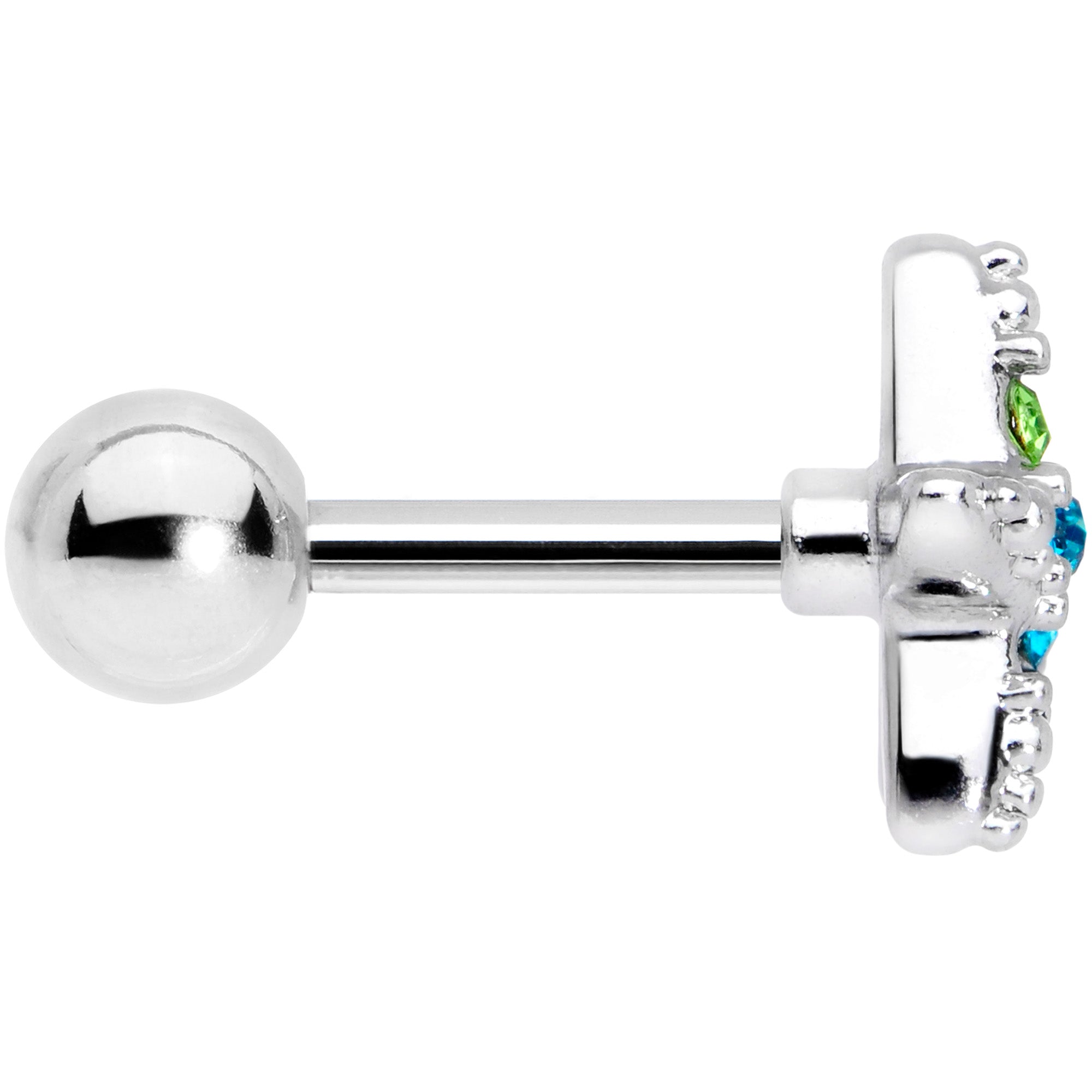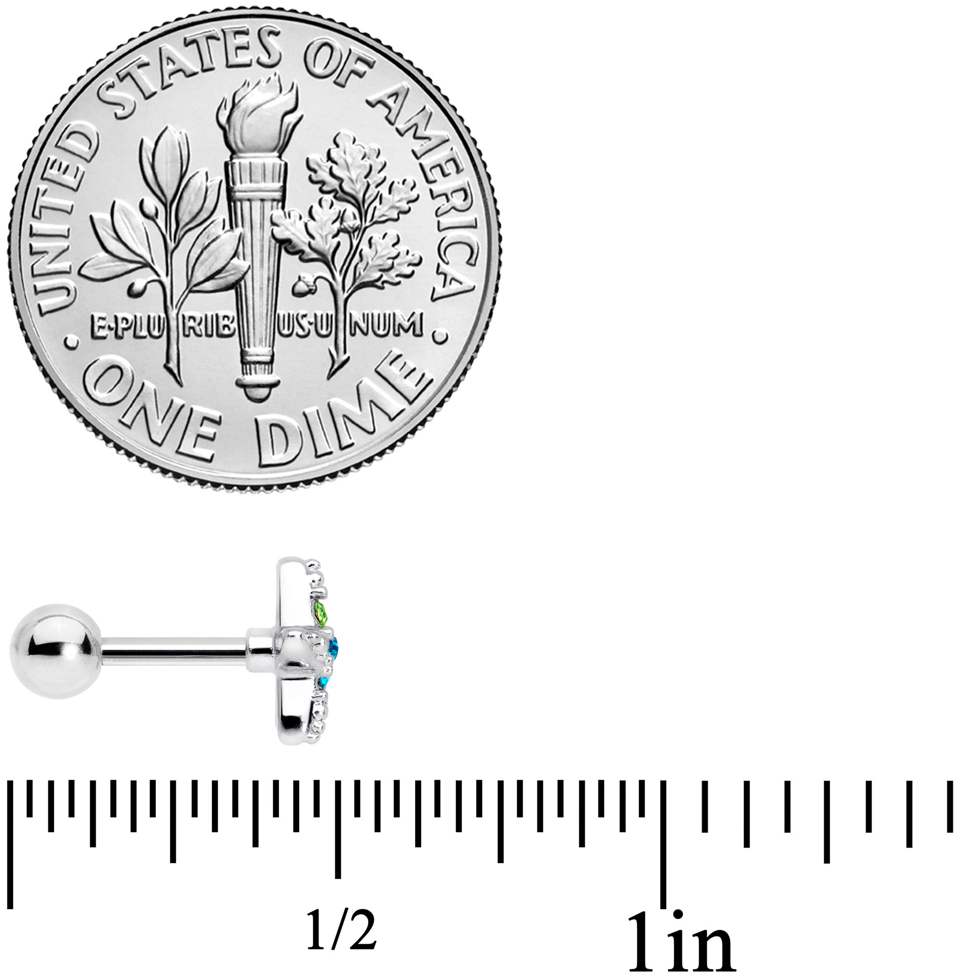 The ocean's gone opulent on this 16 gauge cartilage jewelry! It's made with a 6mm durable 316L surgical grade stainless straight barbell with a 4mm ball end. It features a starfish charm paved with gems in blue, bright green, and clear. It's as hot as any summer's day at the beach and twice as sexy and you can wear it in multiple piercings including helix, tragus, and some conch piercings. Let this seductive starfish add its stylish colors to your cartilage piercings!