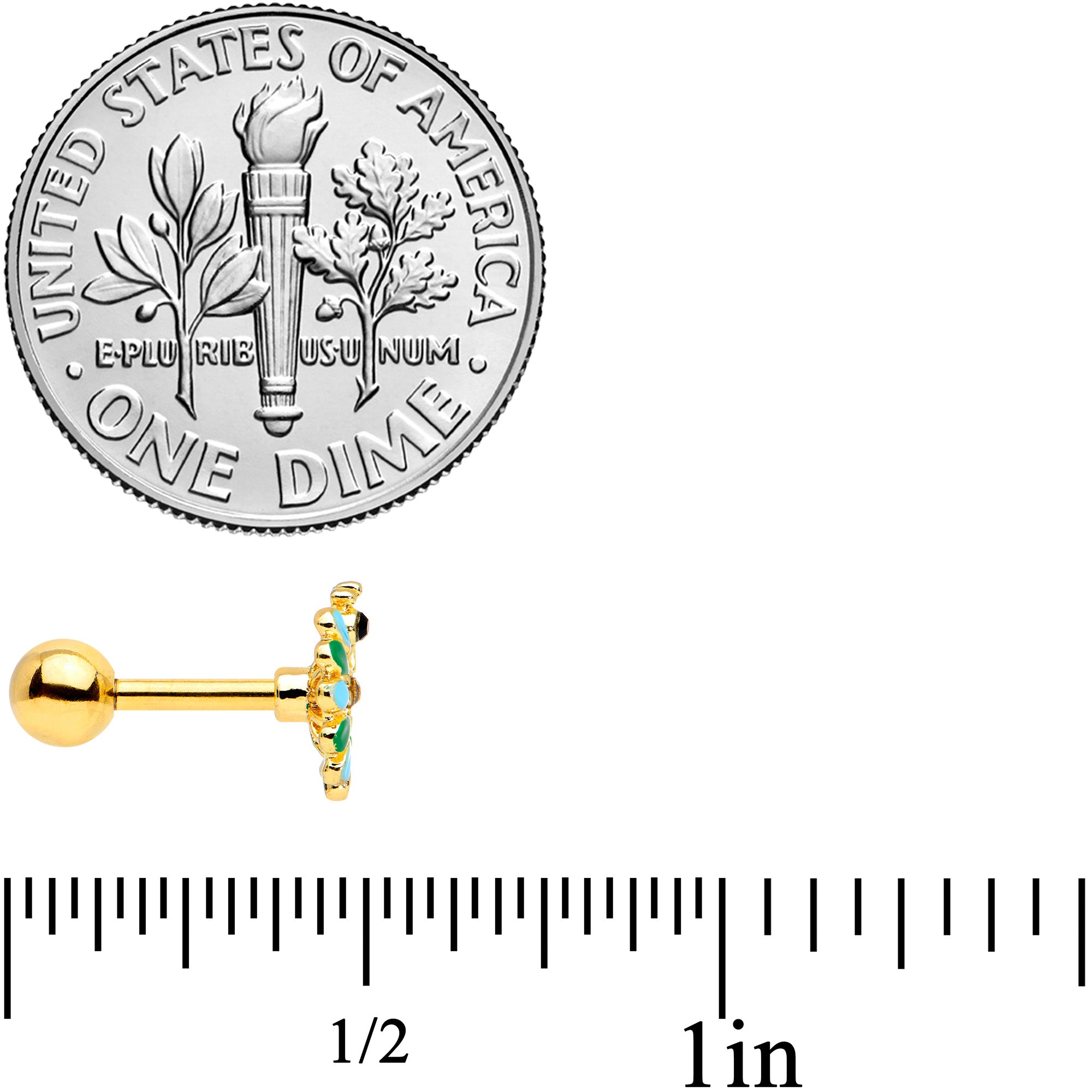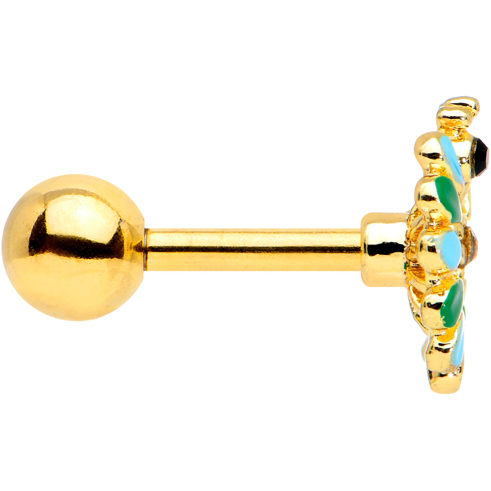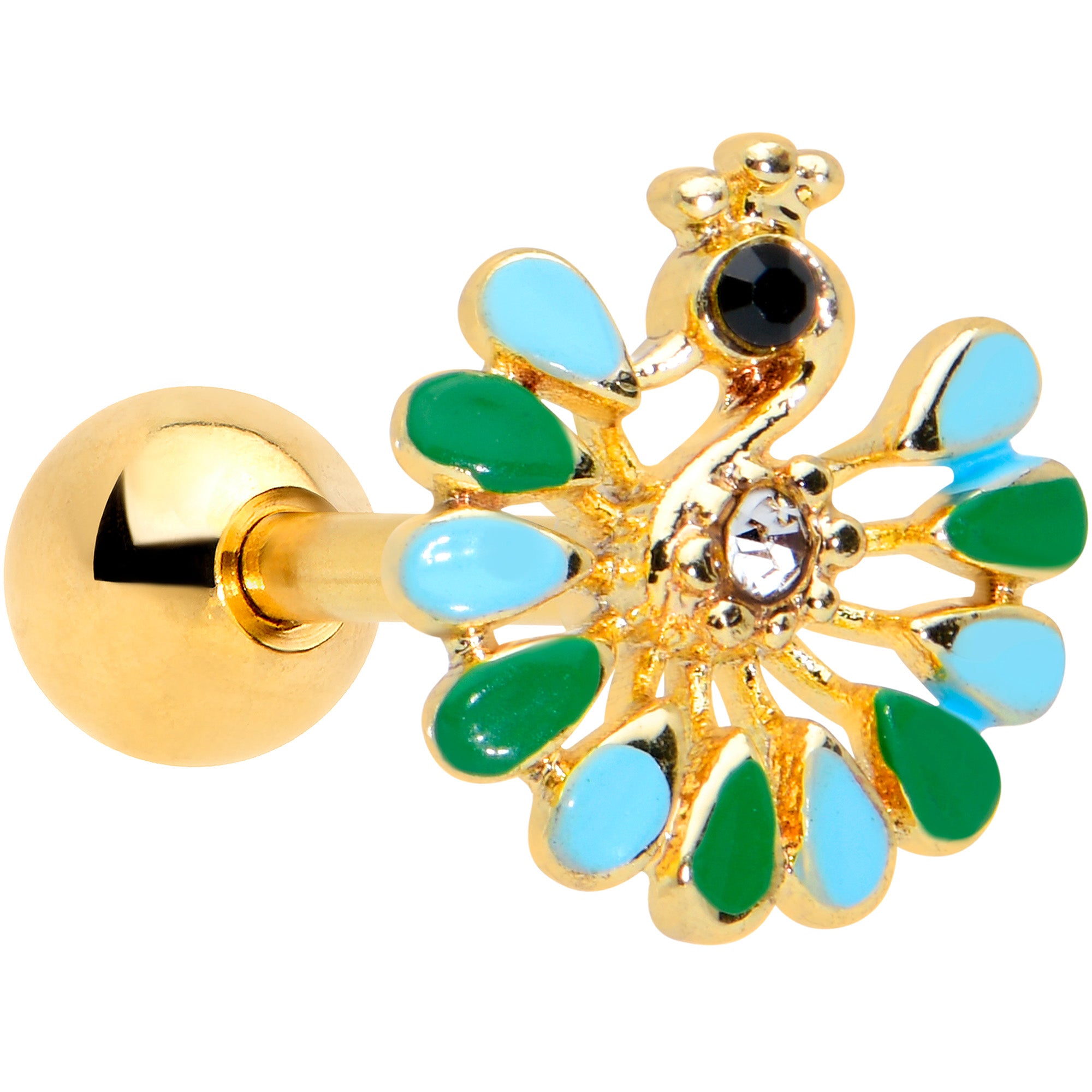 Feel as pretty as a peacock with this 16 gauge tragus stud! It's made with a 6mm gold tone PVD over 316L surgical grade stainless steel straight barbell with a 4mm ball end. It features a peacock charm with a black gem eye. The peacock is further embellished with a clear gem set into its body and feathers tipped in light blue and green inlay. You can even rock this bird in multiple piercings including tragus, helix, and some conch piercings! You'll totally want to shake your tail feathers when you're rocking this precious, pretty peacock cartilage piercing ring!