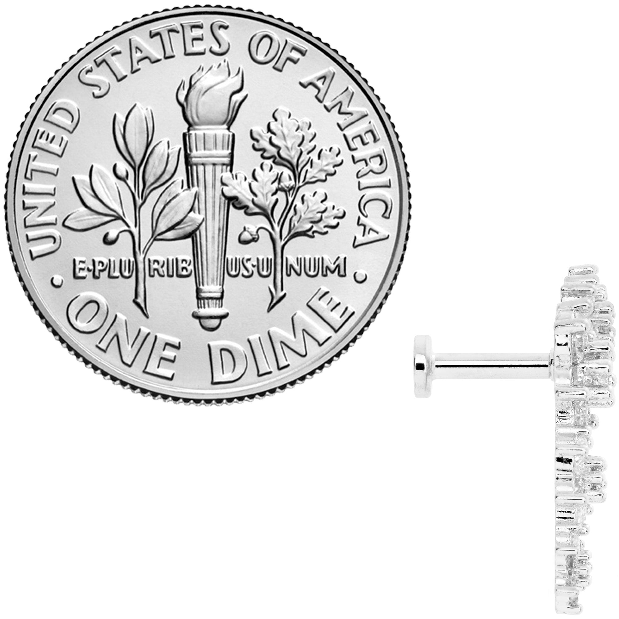 Mother Nature must be wishing she could create flowers as glamorous as the ones found on this 16 gauge cartilage jewelry! It's internally threaded and made with a 6mm durable 316L surgical grade stainless steel straight barbell with a flat disc back. The front of this monroe jewelry features a five flower charm composed entirely of clear cubic zirconia gems. This tragus stud can be worn in multiple piercings including the lip, labret, and cartilage piercings like the tragus, helix, conch, and more! Pop these posies in your piercings - they're sure to grow on you!