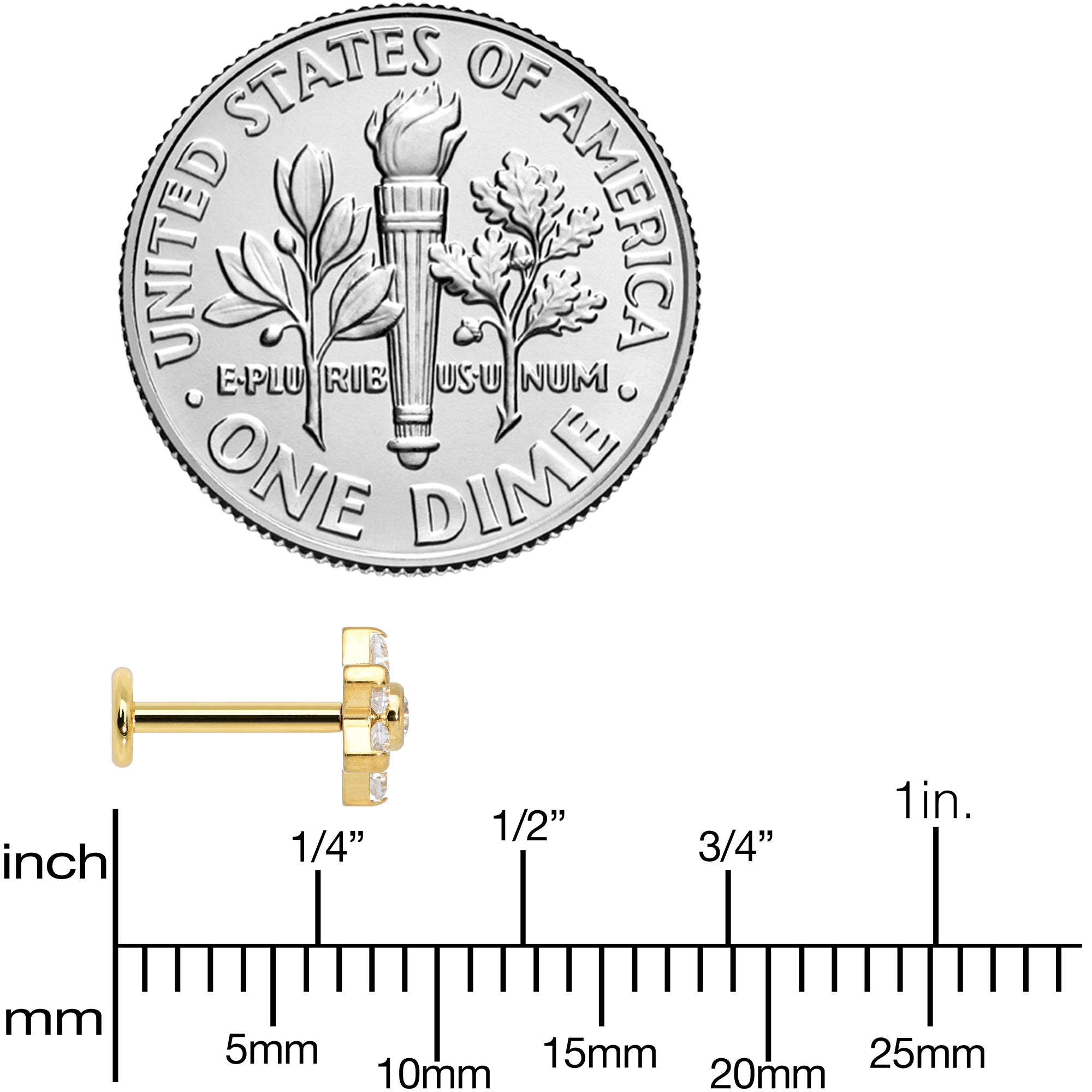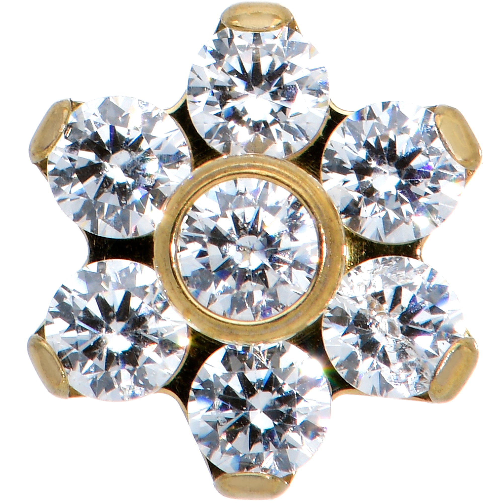 Your cartilage piercings will blossom with this 16 gauge lip ring in them! It's made with a 6mm gold tone PVD over solid grade 23 implant grade titanium straight barbell with a flat disc end. The top end features a flower charm composed entirely of clear cubic zirconia gems. It's internally threaded to make insertion and removal super comfortable and you can rock it in multiple piercings including tragus, helix, and some conch piercings. This pretty flower will make your look bloom with this fabulous, floral cartilage jewelry!