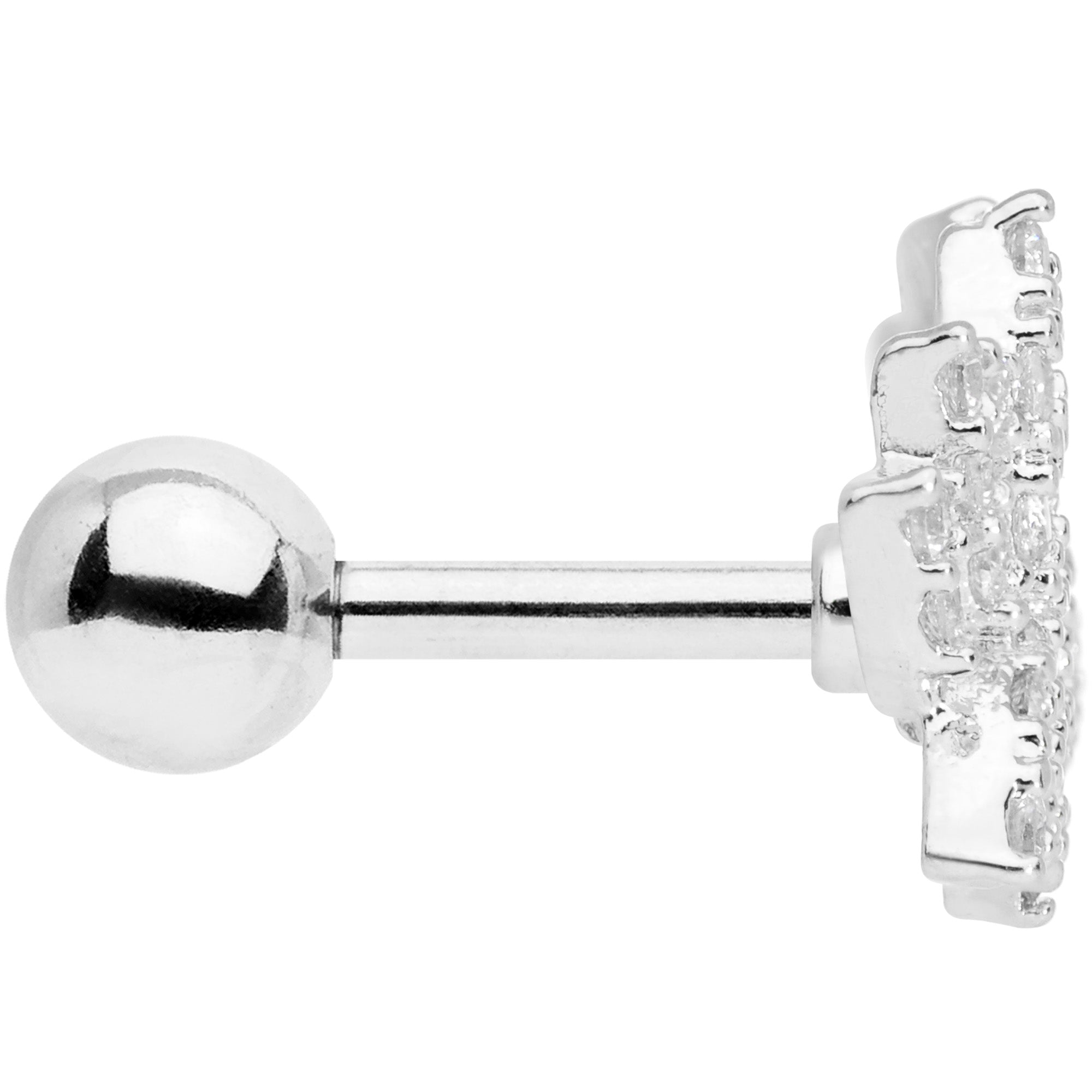 Inner peace is important but so is outer peace - like the kind you get from this 16 gauge tragus stud! It's made with a 6mm durable 316L surgical grade stainless steel straight barbell with a 4mm ball end and features a lotus flower charm paved with clear cubic zirconia gems. It's a great way to show off your spiritual side, as well as the peace you'll get from knowing how sophisticated and stylish your cartilage piercing looks! You can show it off in multiple piercings including tragus, helix, and some conch piercings. This lotus is sure to soothe your mind - when you look this good, you're sure to feel good too!