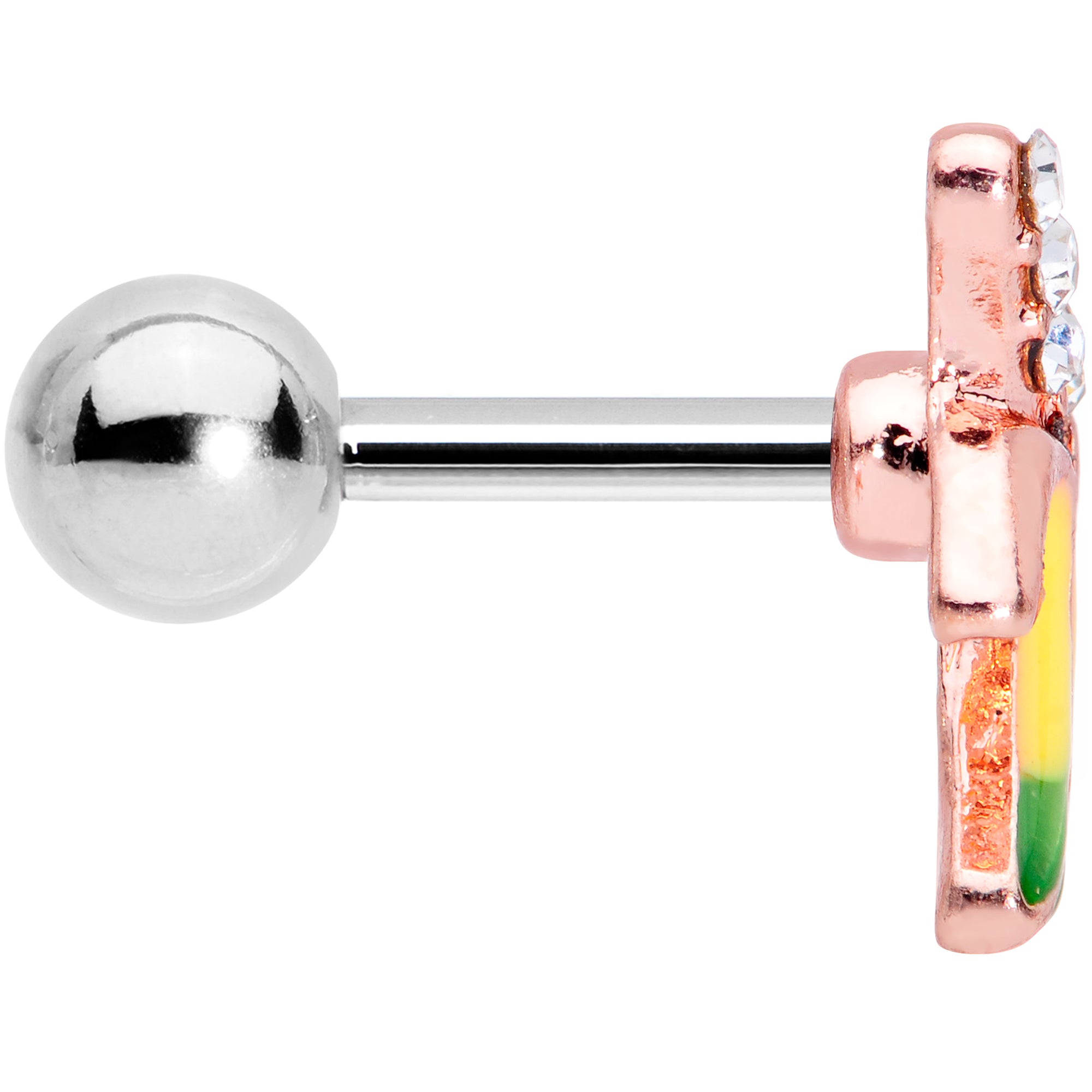 Combine fruit with fashion with this 16 gauge cartilage stud! It's made with a 6mm durable 316L surgical grade stainless steel straight barbell with a 4mm ball end. The front features a banana charm with a realistically yellow peel and a green tip. The top half of the banana is set with small clear cubic zirconia gems for a look that's more posh-looking than it is produce section. And you can sport this scrumptious fruit in multiple piercings including tragus, helix, and some conch piercings. With its whimsical style and fanciful detailing, this tragus stud is one you're sure to go bananas for!