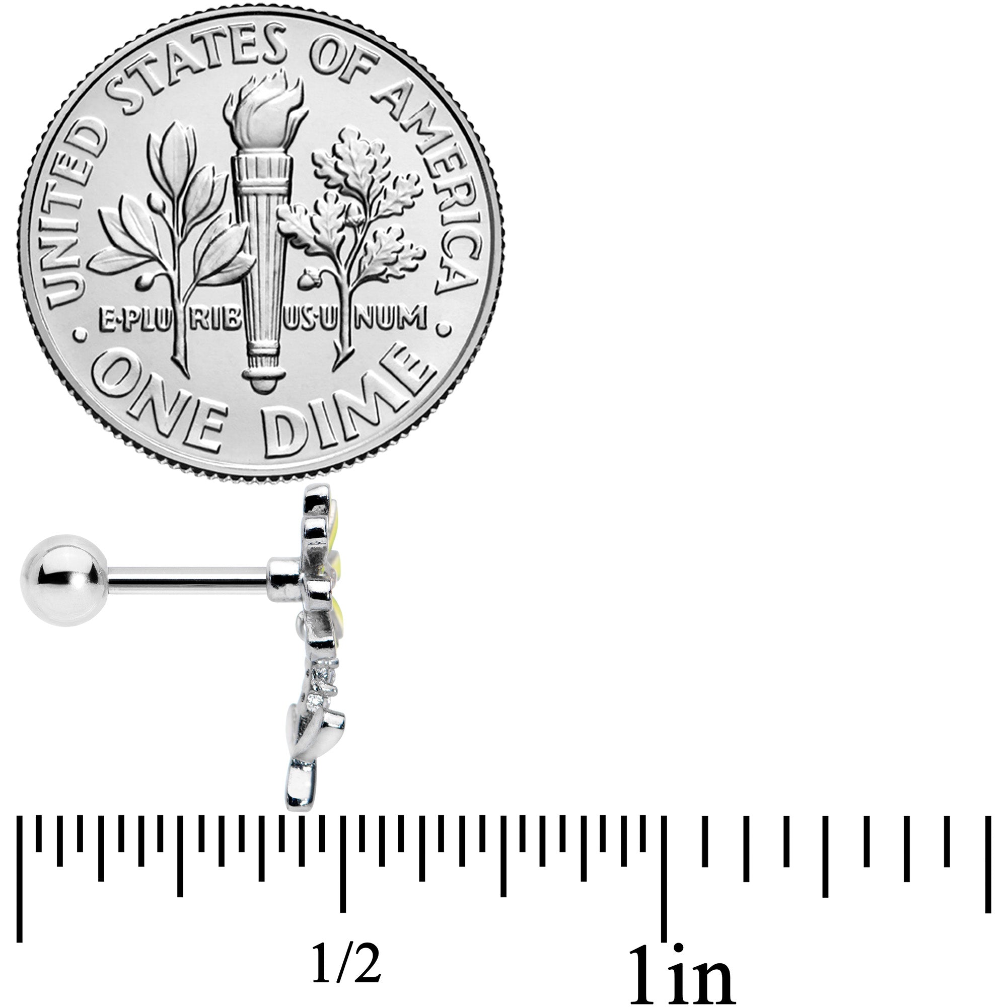 Add a touch of lighthearted whimsy to your look with this 16 gauge tragus stud! It's made with a 6mm durable 316L surgical grade stainless steel straight barbell with a 4mm ball end. It features a cheerful flower charm, with yellow inlaid petals. The stem is a dangling row of clear cubic zirconia gems, with green leaves for added color. You can flaunt this flower in multiple piercings including tragus, helix, and some conch piercings. This dangling daisy cartilage stud is sure to add some good cheer to your look!