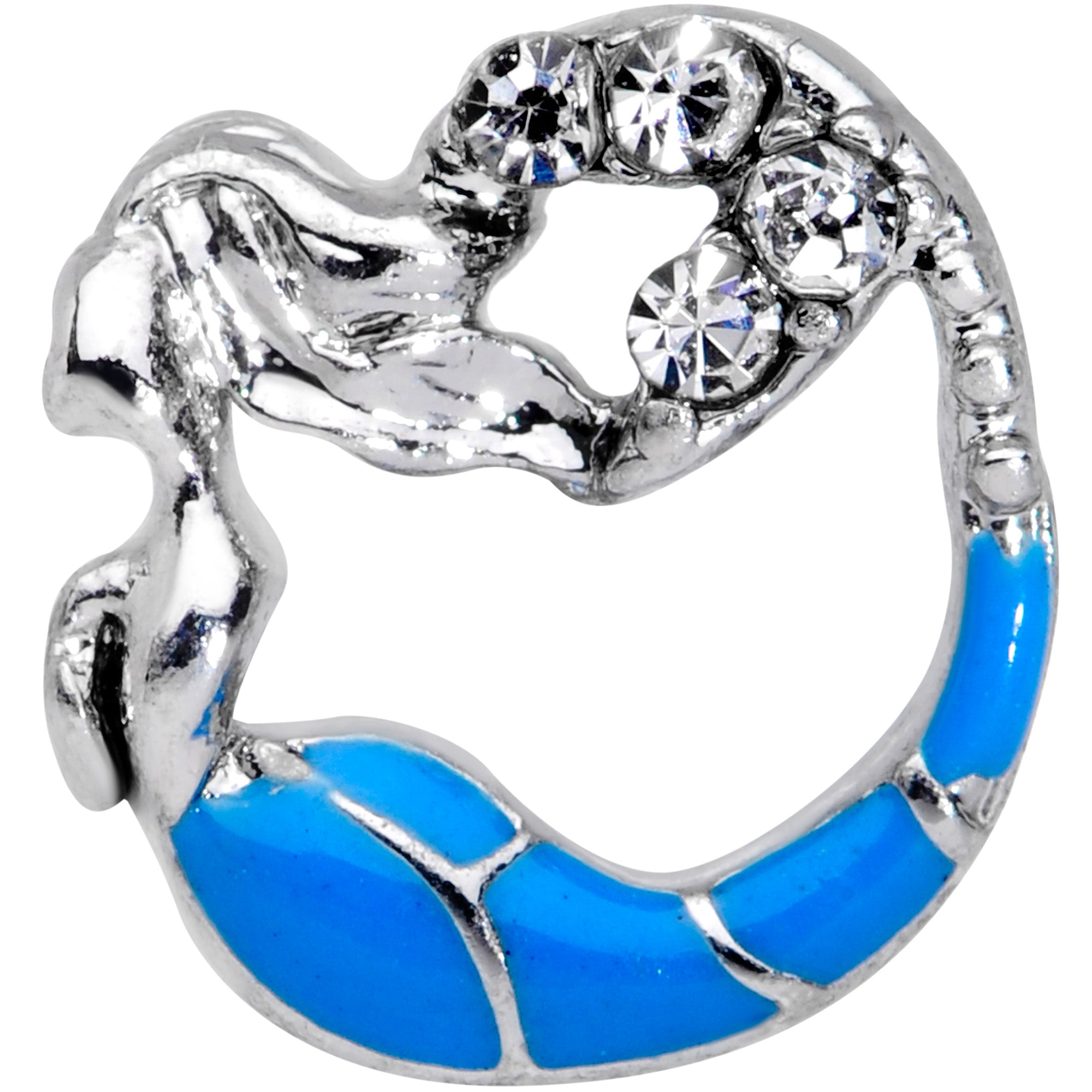 Make a splash with this 16 gauge mermaid tragus earring! It's made with a 6mm durable 316L surgical grade stainless steel straight barbell with a 4mm ball end. It features a mermaid charm with her tail curving up behind her to form a circle. The end of her tail is set with small clear gems and the tail is embellished in aqua for a truly nautical feel. You can even rock this mermaid in multiple piercings including tragus, helix, and some conch piercings. Give your cartilage piercing a touch of sexy style with this marvelous mermaid cartilage earring!