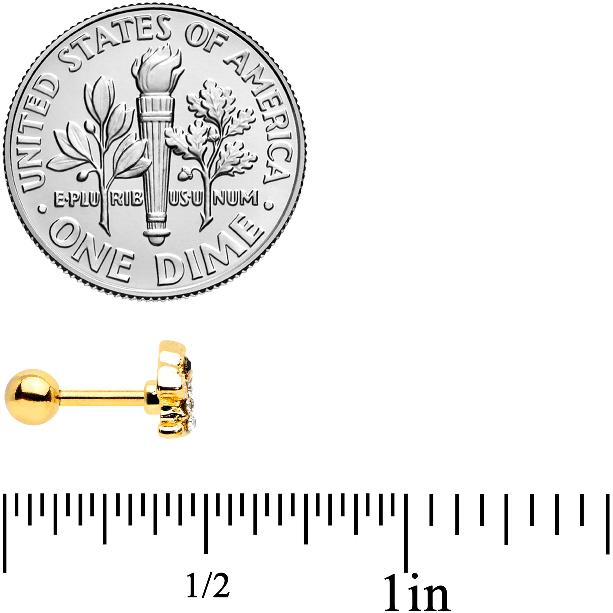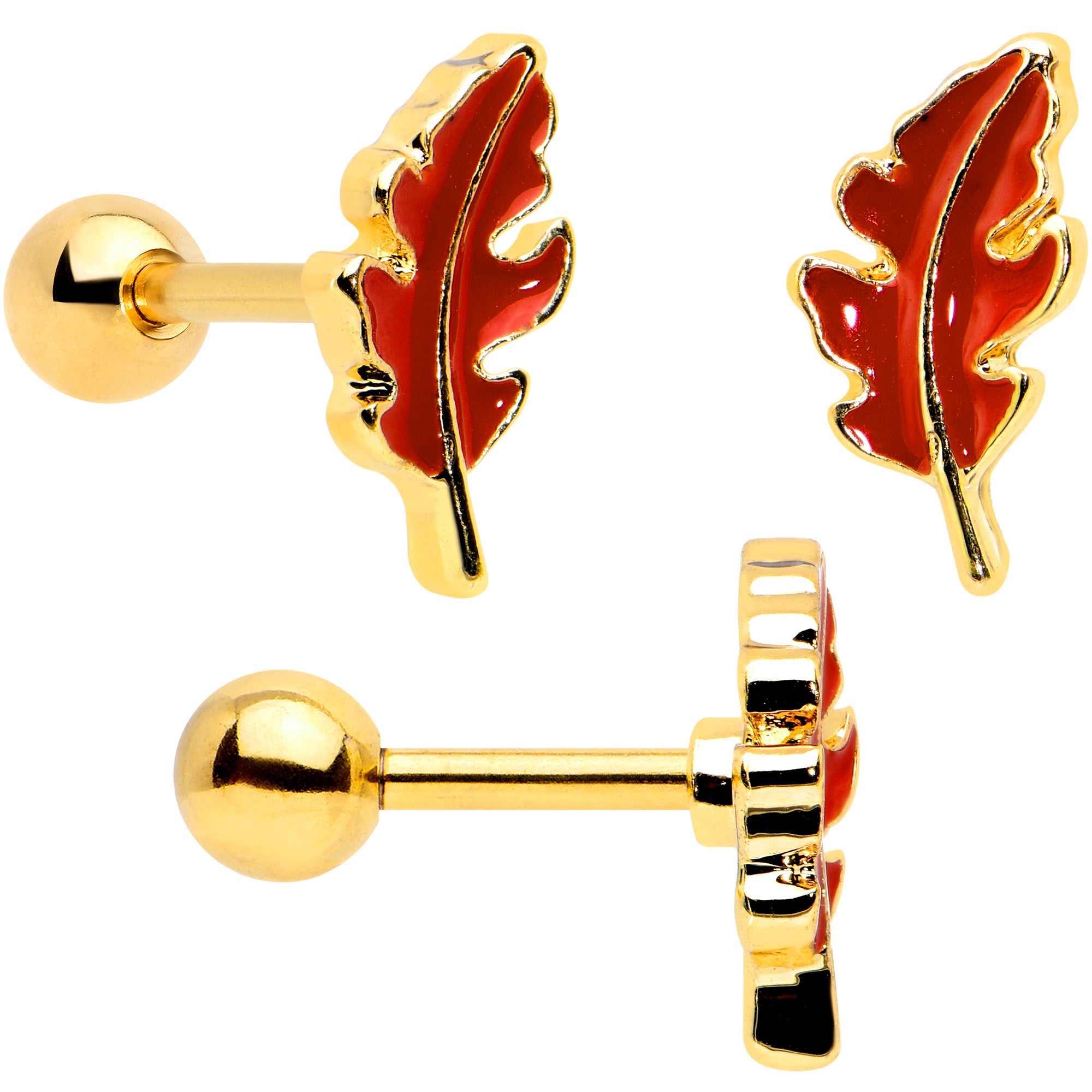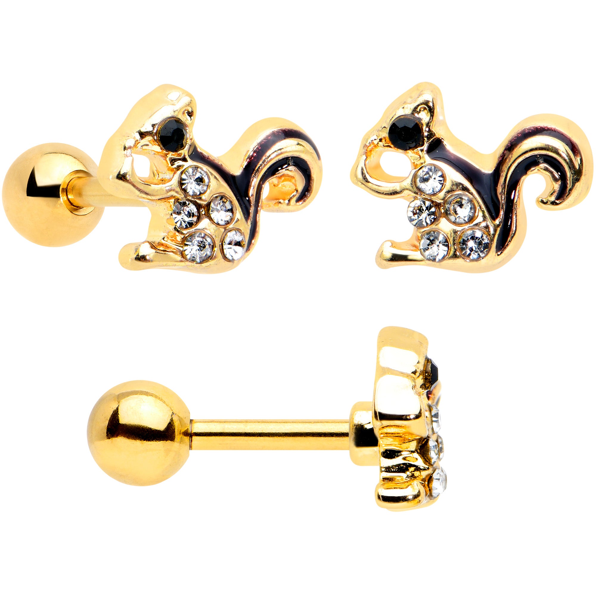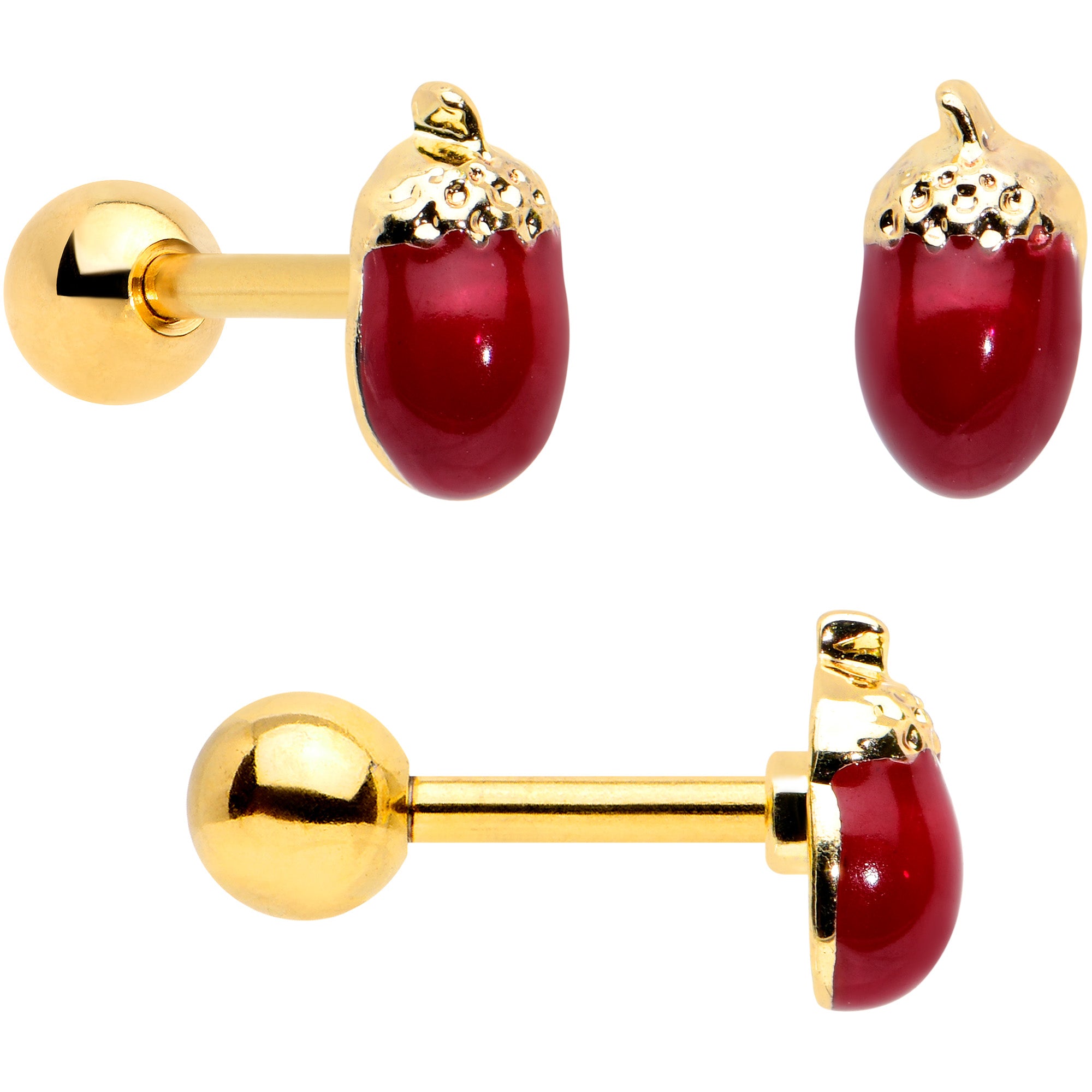 Let the leaves fall where they want - this set of 16 gauge tragus studs will have you looking too good to care! They're made with 6mm gold tone PVD over 316L surgical grade stainless steel straight barbells with 4mm ball ends. One features a leaf charm, with brown detailing. The second features an acorn charm, with a textured cap for a realistic look. The third features a chipmunk charm, with black stripes, a black gem eye, and clear gem embellishment for a fun Autumnal look. You can even wear these in multiple piercings including tragus, helix, and some conch piercings. You're totally going to fall for these cartilage studs! Sold as a set of three.