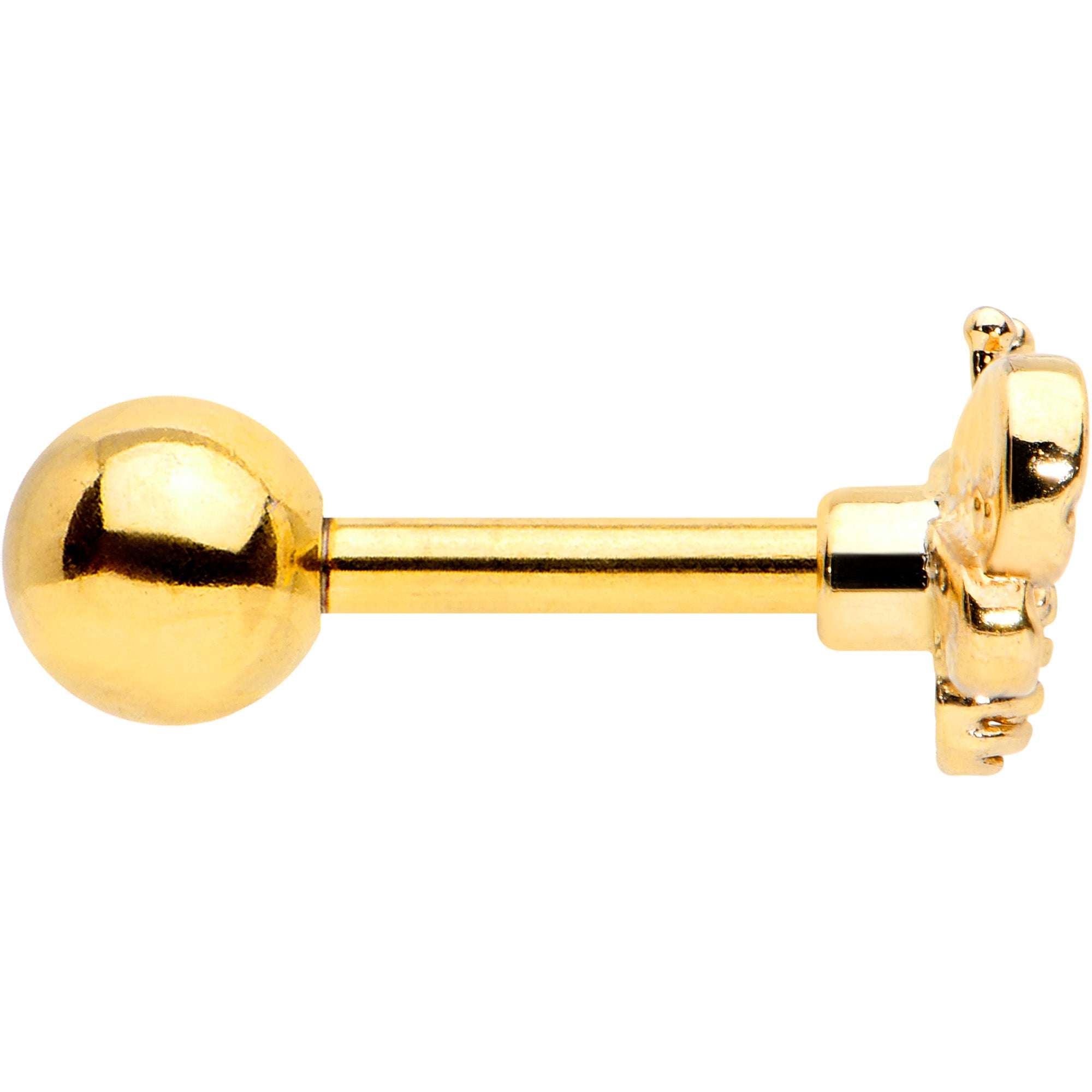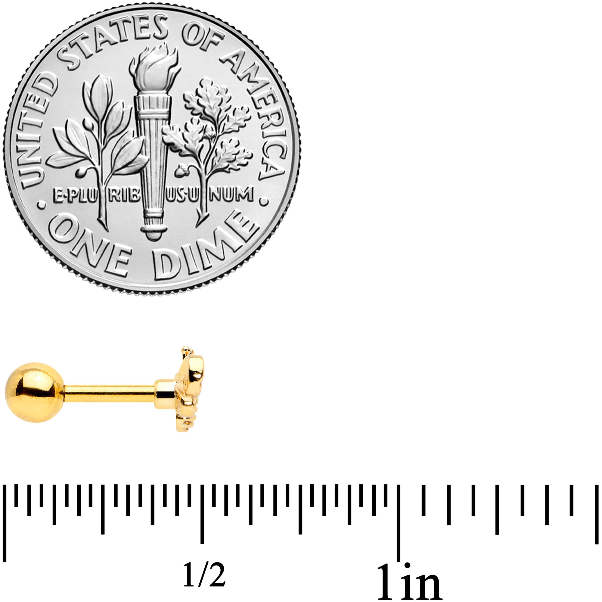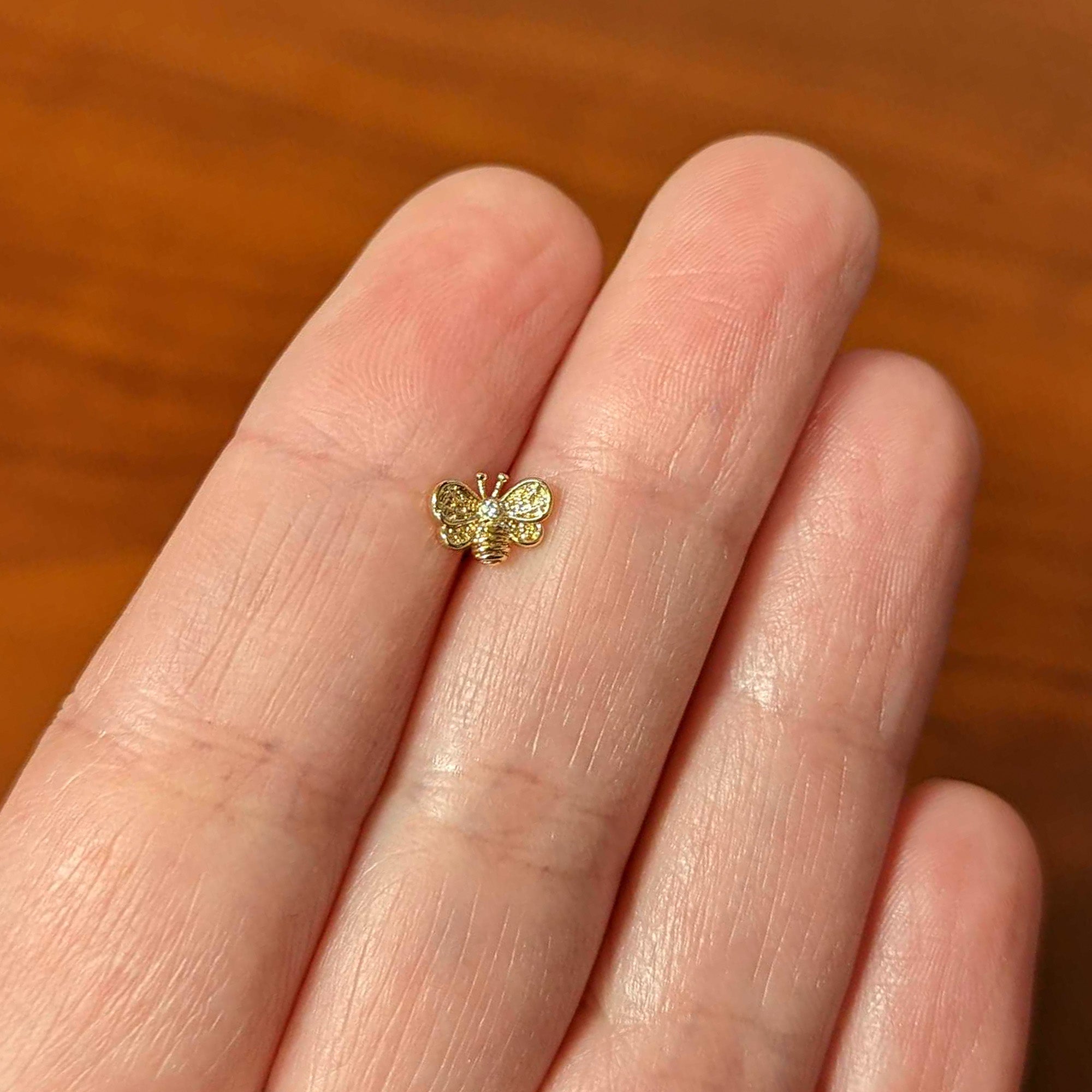 This 16 gauge tragus stud is sure to bee-utify your cartilage piercing! It's made with a 6mm gold tone PVD over 316L surgical grade stainless steel straight barbell with a 4mm ball end. It features a bee charm with understated detailing, embellished with a tiny clear gem set at the head. The bee also features openwork wings for a cohesive and airy appearance. You can even boast this bee in multiple piercings including tragus, helix,and some conch piercings. This understated insect jewelry is sure to bee your favorite cartilage stud!