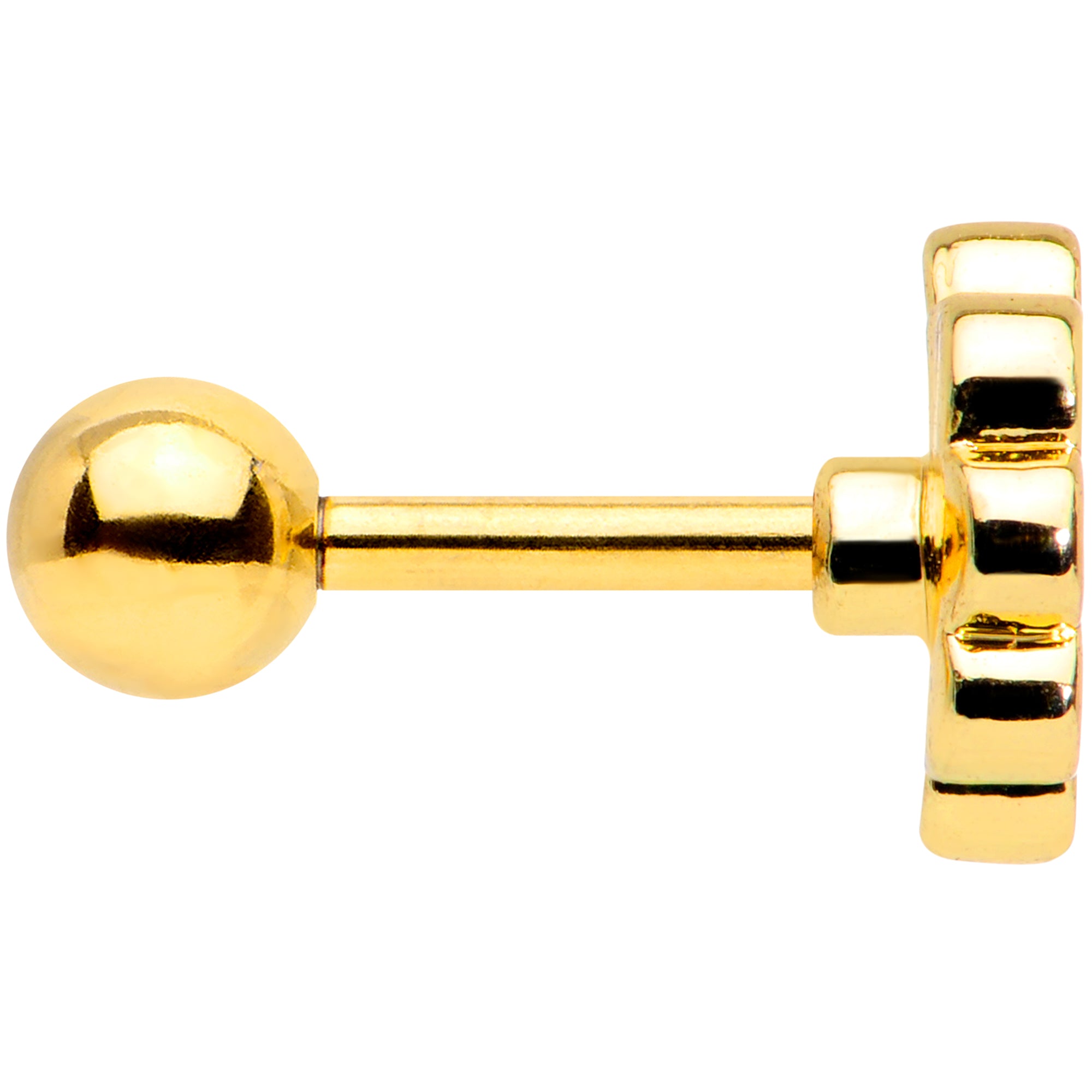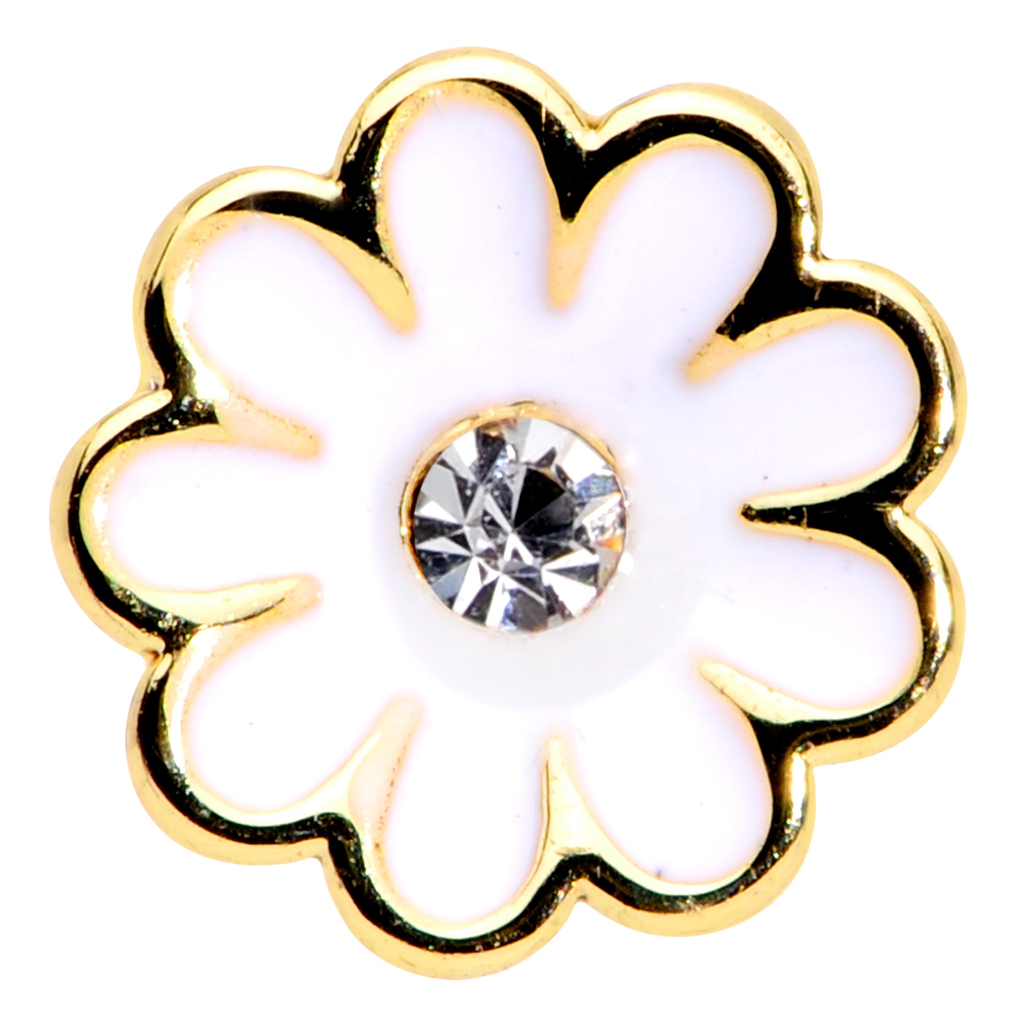 When life has you searching for cartilage jewelry options, do the daisy on this 16 gauge tragus stud! It's made with a 6mm gold tone PVD over 316L surgical grade stainless steel straight barbell with a 4mm ball end. The front features a daisy flower with a classic white inlay. At the daisy's center is a small clear gem for an added touch of style that really catches the eye. You can even flaunt this flower in multiple piercings including helix, tragus, and some conch piercings. If your jewelry options have you in a funk, this fabulous flower is sure to have you looking and feeling fantastic!