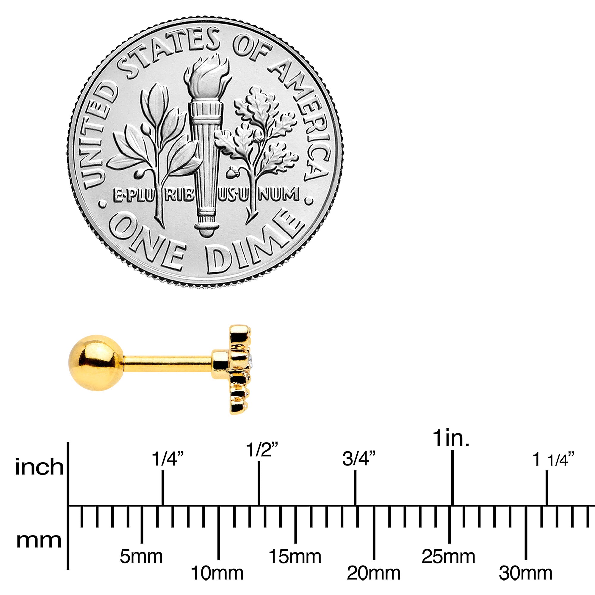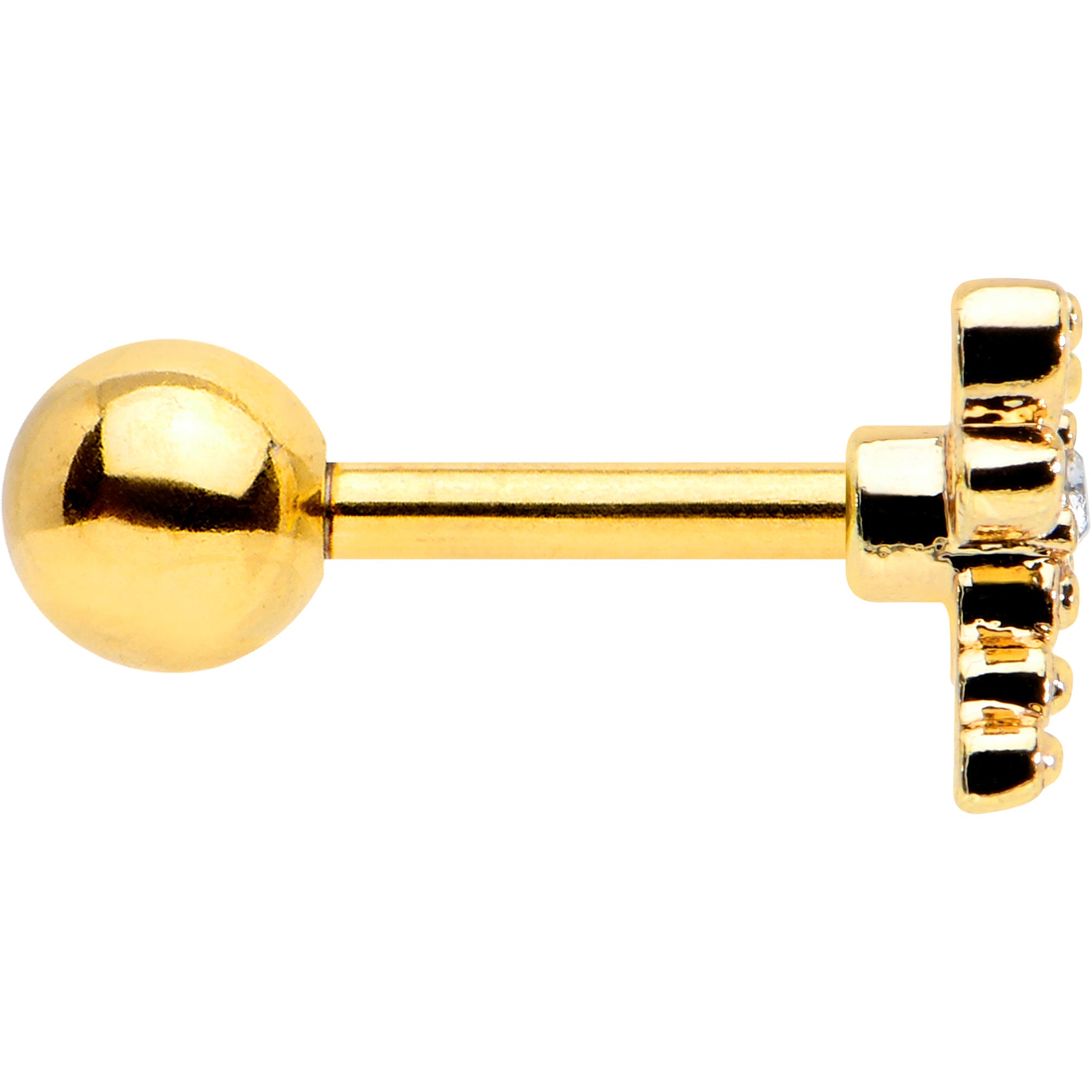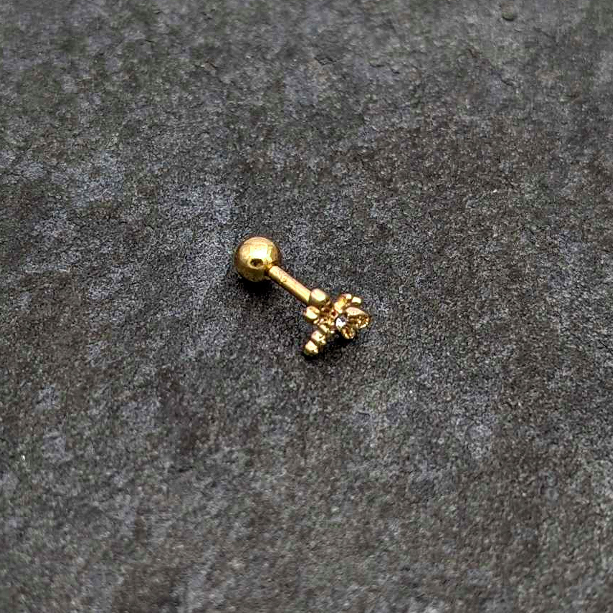 Let your look soar with this 16 gauge tragus stud! It's made with a 6mm gold tone PVD over 316L surgical grade stainless steel straight barbell with a 4mm ball end. It features a dragonfly charm. The dragonfly features openwork wings and body and a tail composed entirely of textured detailing. You can even rock it in multiple piercings including tragus, helix, and some conch piercings. You'll want to fly too when you're rocking this darling, dragonfly cartilage piercing ring!