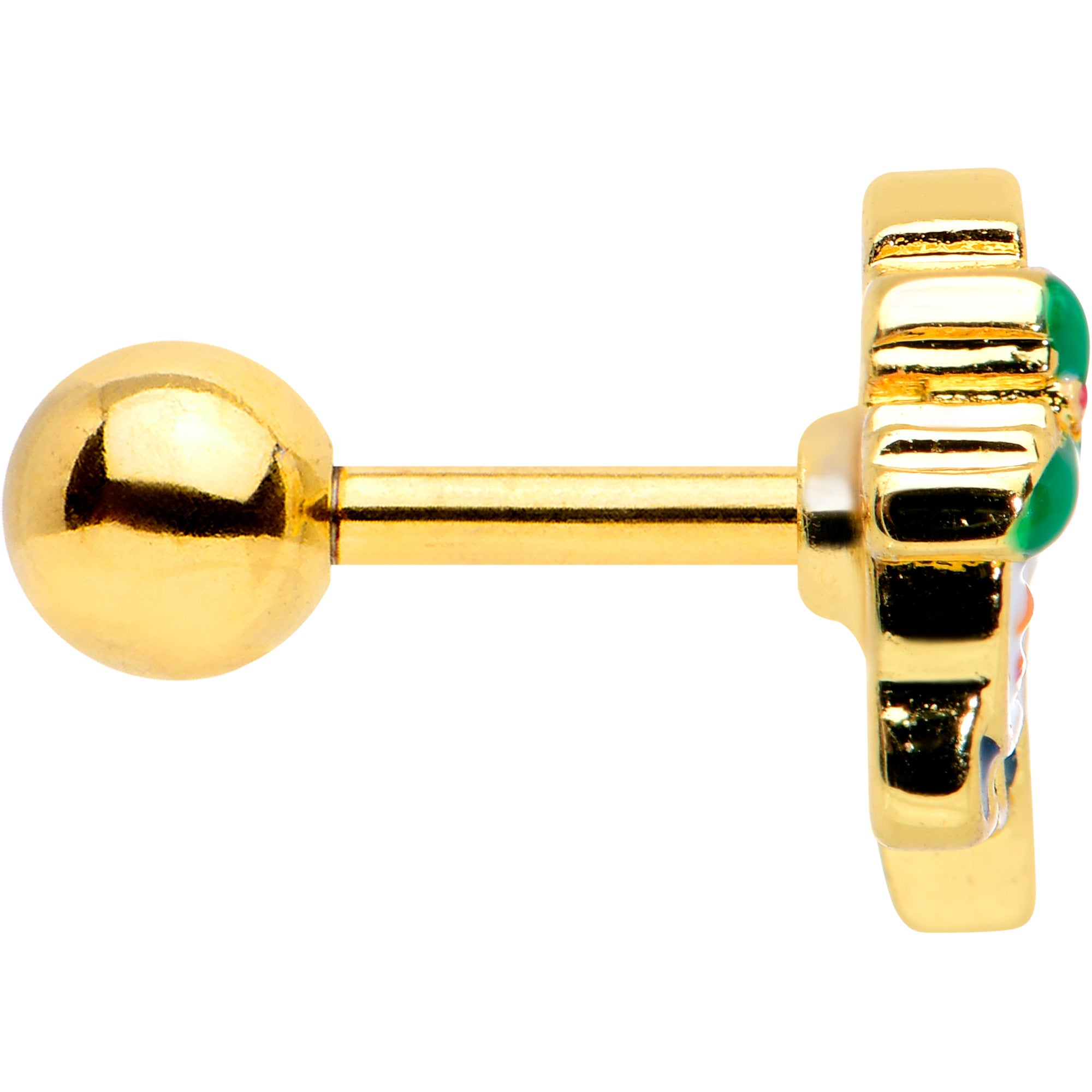 The happy snowman on this 16 gauge tragus stud will have you smiling this Christmas too! It's made with a 6mm gold tone PVD over 316L surgical grade stainless steel straight barbell with a 4mm ball end. It features a snowman charm, wearing a green scarf and a sprig of holly, along with an endearing smile. The snowman is further embellished with a row of clear gems on its hat. You can even rock it in multiple piercings including tragus, helix, and some conch piercings. What's not to smile about when you're rocking this festive snowman cartilage piercing ring!
