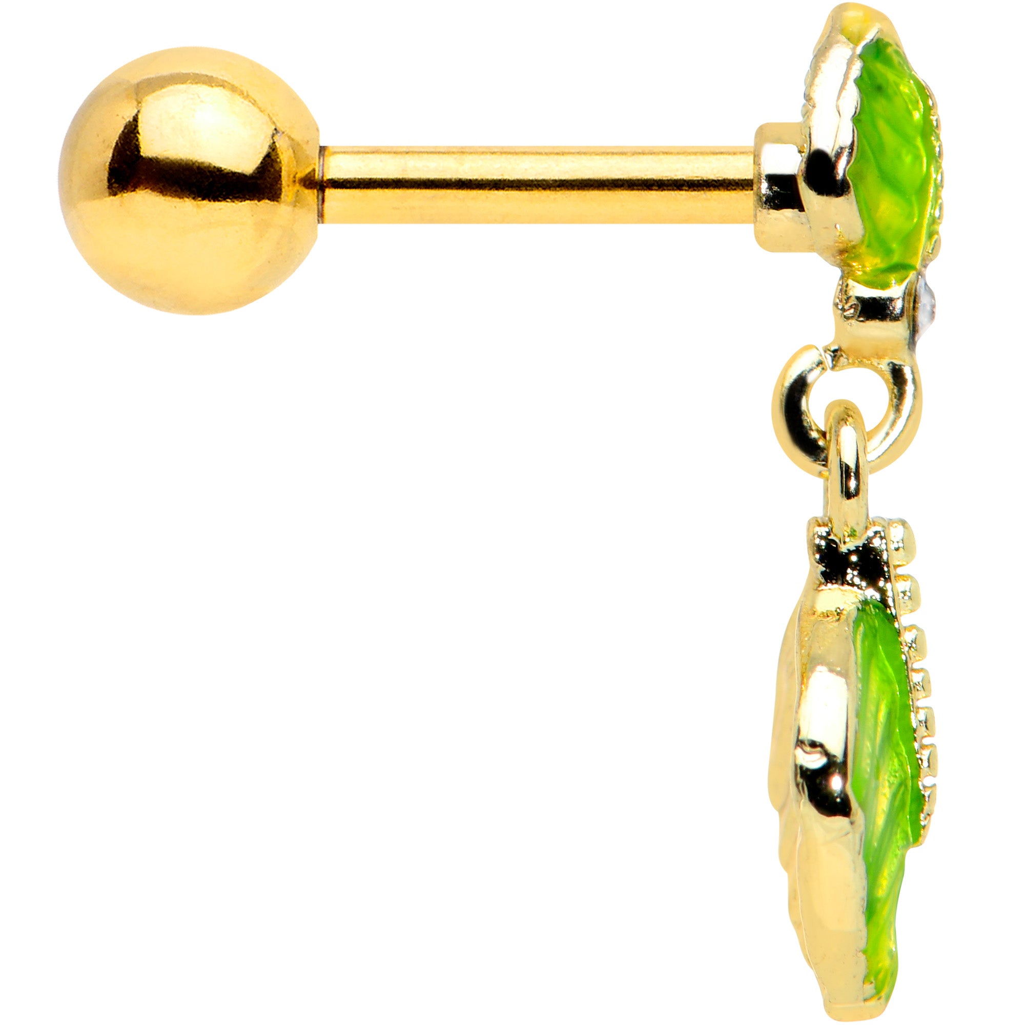 Leave your old look behind with this 16 gauge tragus stud! It's made with a 6mm gold tone PVD over 316L surgical grade stainless steel straight barbell with a 4mm ball end. It features small green leaf charm, with a clear gem at its bottom point. Dangling from it is a larger green leaf, for a luscious and cohesive appearance. You can even rock it in multiple piercings including tragus, helix, and some conch piercings. You'll never want to let this cartilage stud to leaf your piercings!