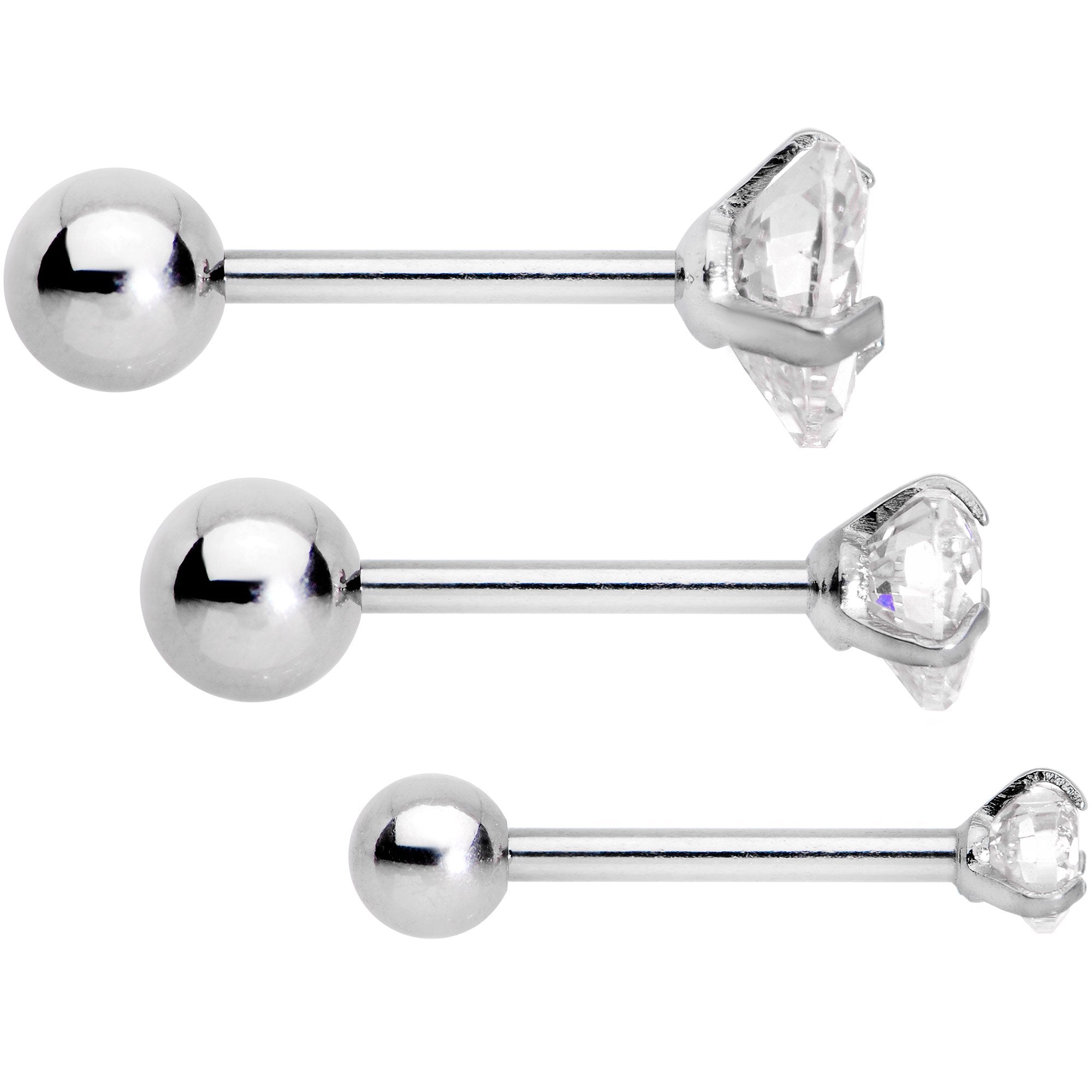 How big is your heart? As big as you want it to be! This set of three stud earrings features a trio of clear gem heart ends in different sizes including 5mm, 4mm, and 3mm. The heart charms are each mounted on a 16 gauge straight barbell made with 5/16" in length 316L surgical grade stainless steel. Sold as a set of three.