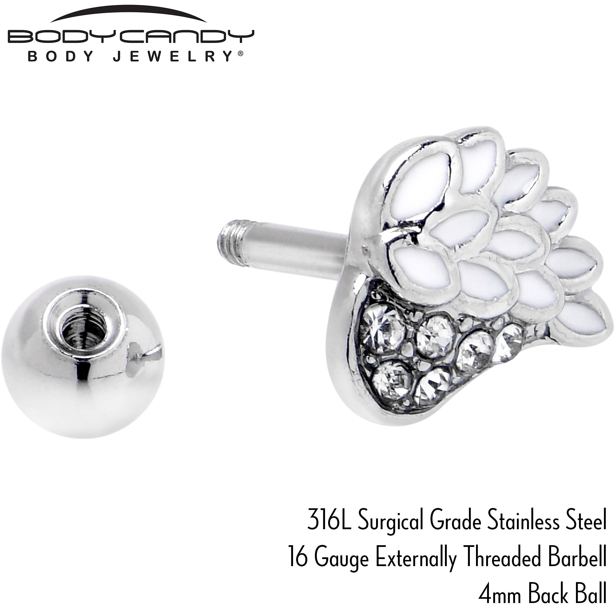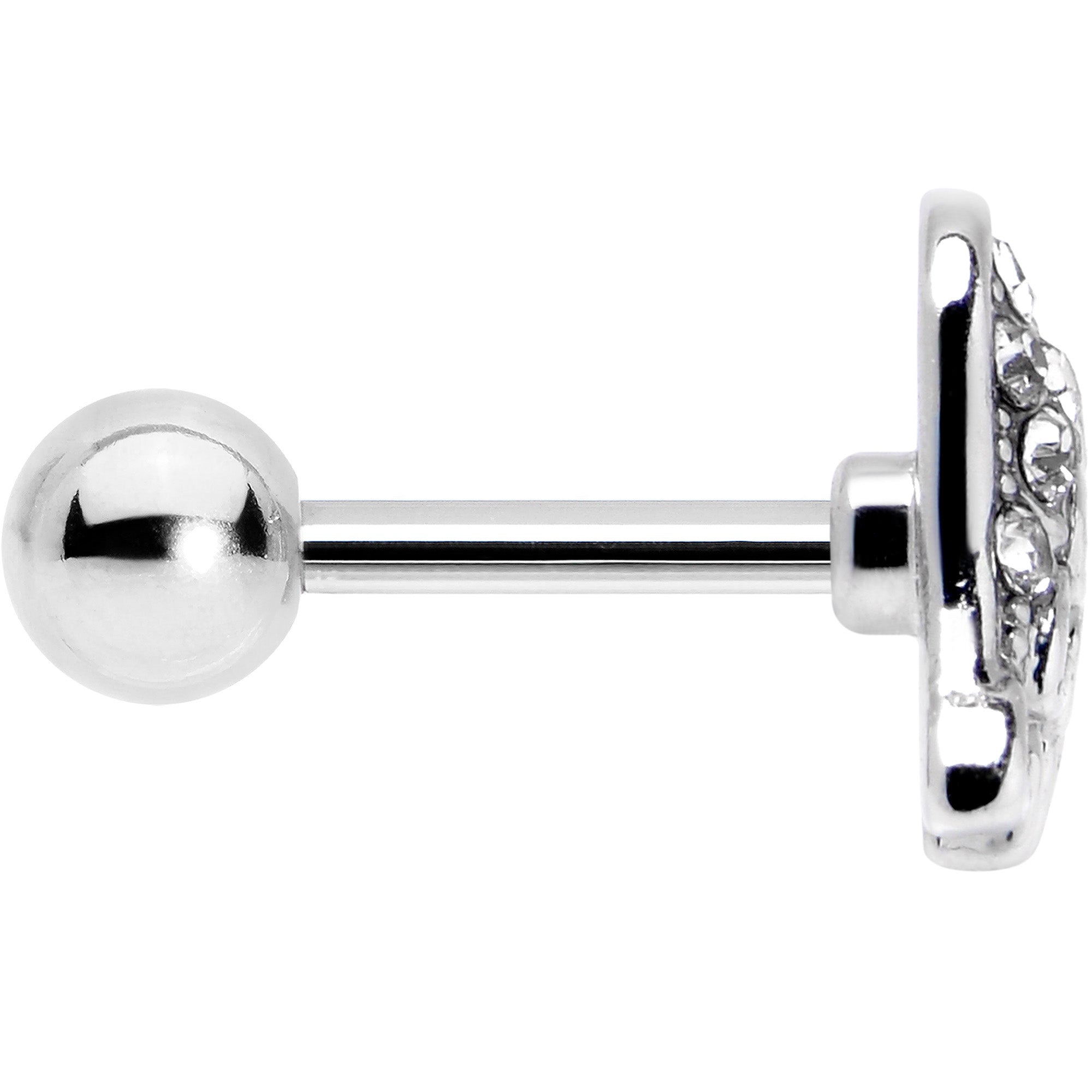 Give yourself a heavenly new look with this 16 gauge tragus stud. It's made with a 6mm durable 316L surgical grade stainless steel straight barbell with a 4mm ball end. It features a heart shaped charm featuring an angel's wings, with one side paved with clear gems. The other side features white inlay and simply styled feather details and you can rock it in multiple piercings including tragus, helix, and some conch piercings. Let your look and your spirit soar with this stylish and spiritual cartilage piercing jewelry.