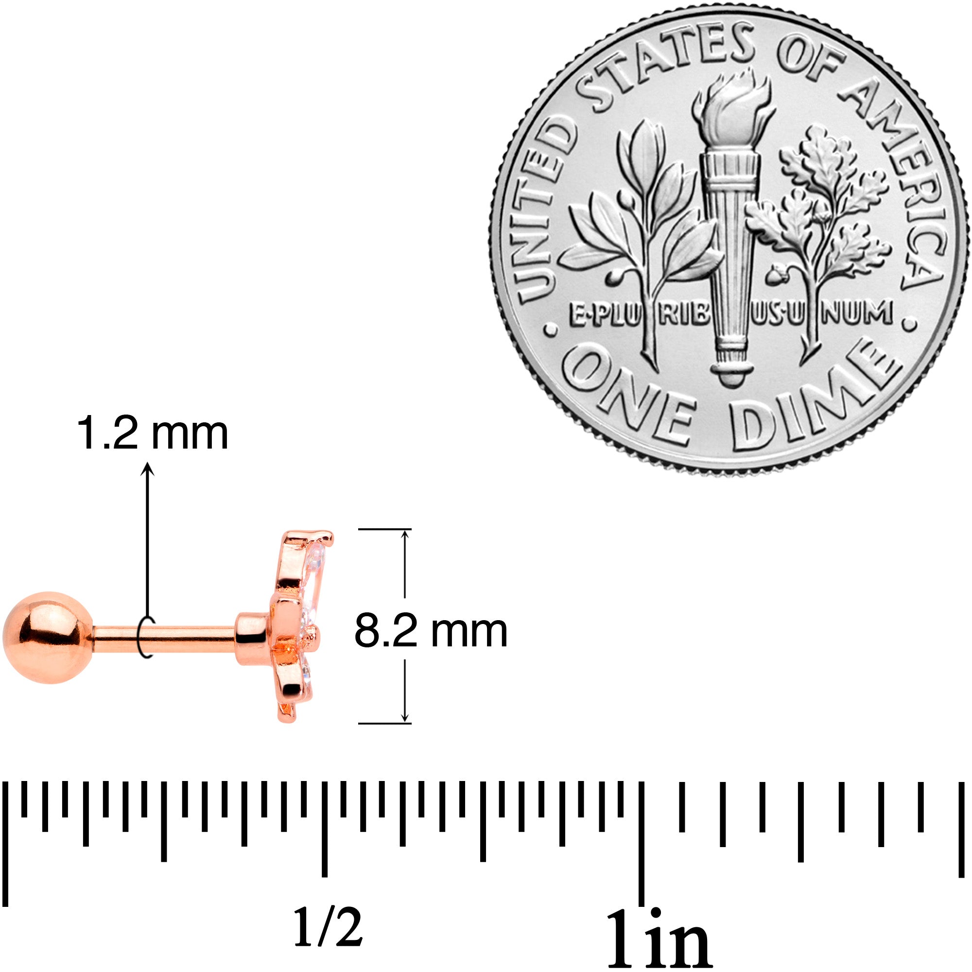 This flower has such a light and breezy look to it, you might almost expect it to float away! This 16 gauge cartilage stud is made with a 6mm rose gold tone plated over 316L surgical grade stainless steel straight barbell with a 4mm ball end. It features a flower charm with four of its five petals paved in small clear gems and the top petal set with a single clear gem. Even better, this beautiful blossom works well in multiple piercings, including tragus, helix, conch, and other cartilage piercings! Let flowers flourish in your piercing with this fanciful tragus stud!