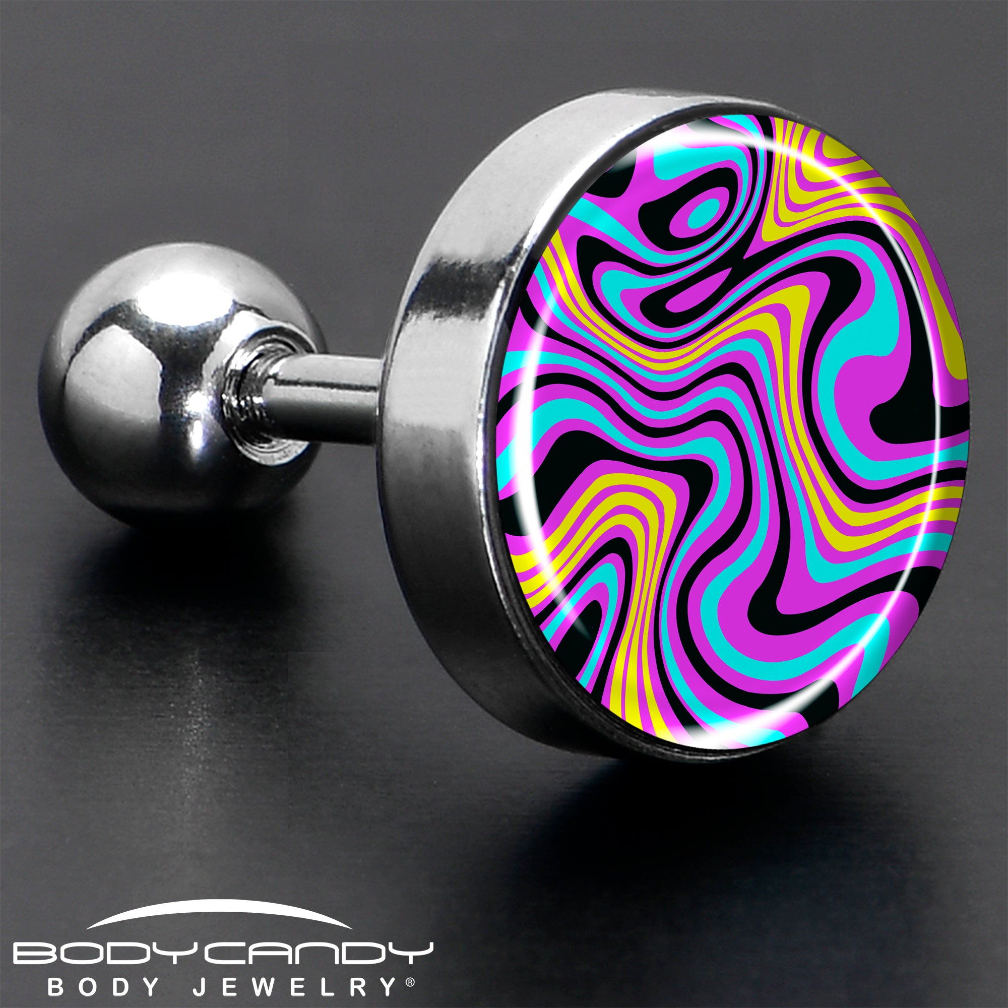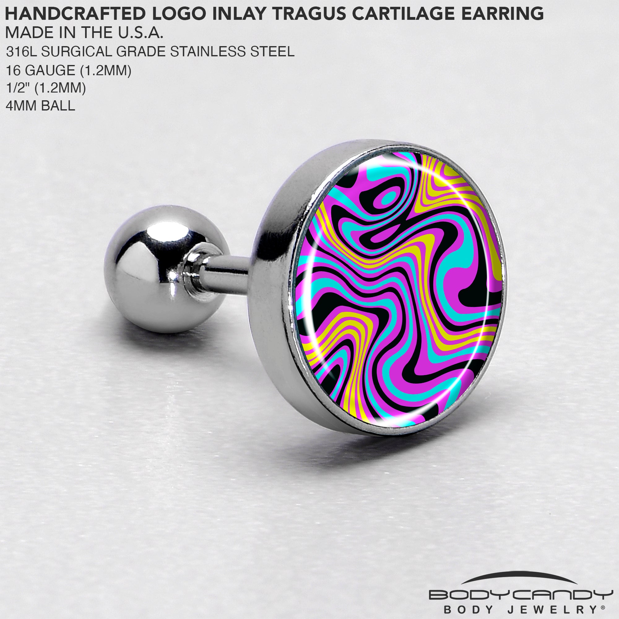 This artist hand-drawn vibrant funky swirl pattern 16 gauge tragus stud is the perfect blend of funky colors and a whimsical swirl pattern designed to bring a unique touch to your body piercing jewelry collection. Made from a 6mm hypoallergenic 316L surgical grade stainless steel straight barbell, this cartilage piercing ring ensures comfort for sensitive skin while maintaining a durable and long-lasting shine. The 4mm ball end allows for easy insertion and removal, making it a practical addition to your jewelry box that you can rock in multiple piercings including tragus, helix, and some conch piercings. Whether you're new to cartilage piercings or adding to your collection, this helix jewelry is sure to stand out.