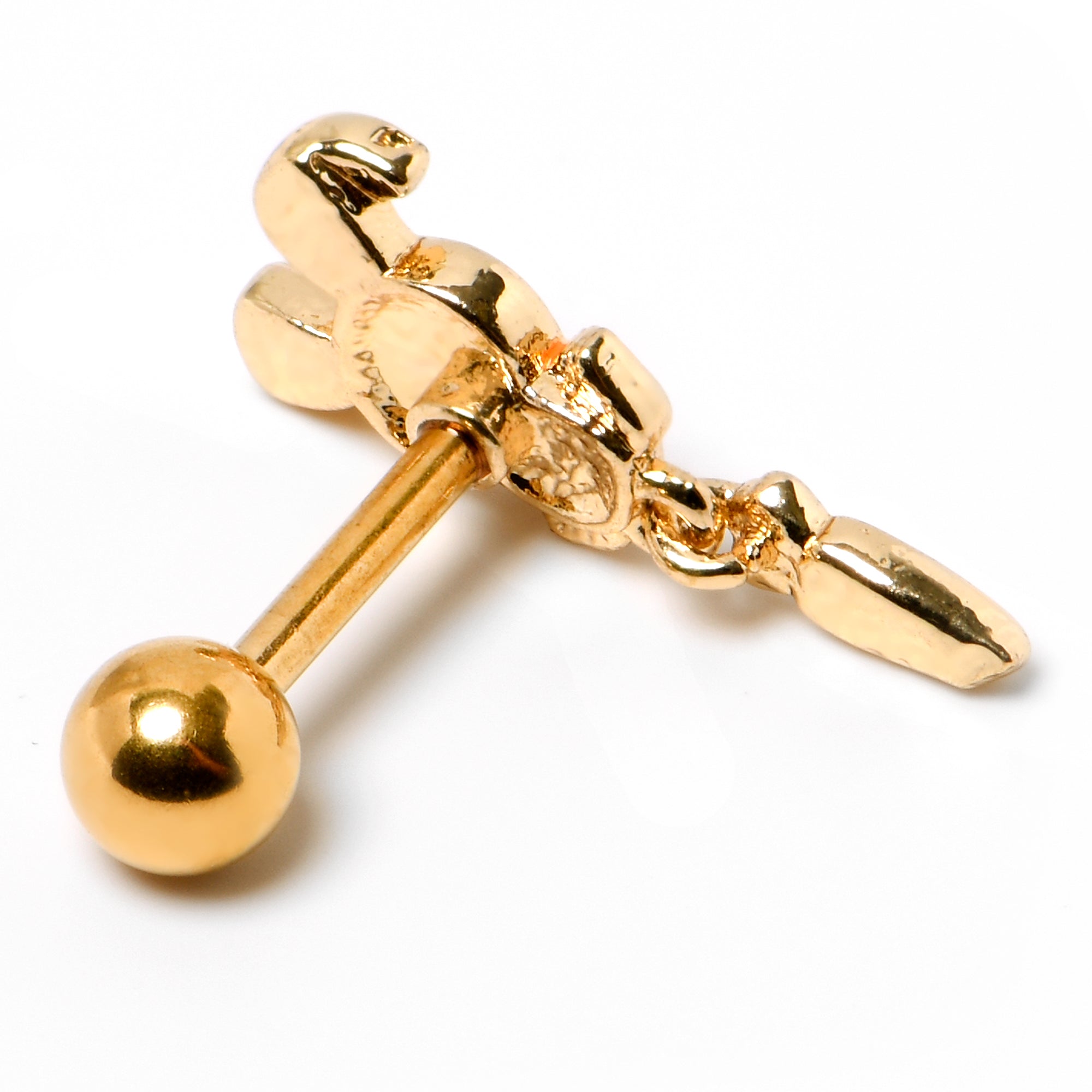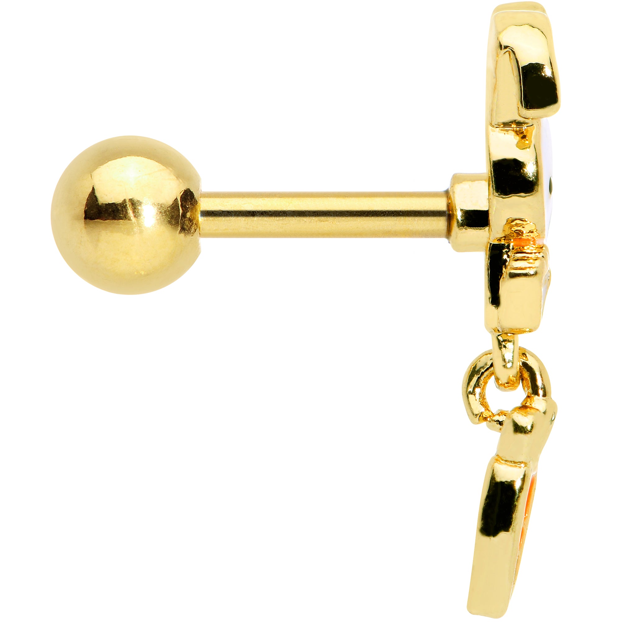 The Easter Bunny on this 16 gauge tragus stud is quite the little cutie. It is made with a 6mm gold tone PVD over 316L surgical grade stainless steel straight barbell with a 4mm ball end. It features an Easter Bunny charm, with the bunny cradling a carrot. It also features a dangling carrot charm for a cohesive and eye catching look. You can even rock it in multiple piercings including tragus, helix, and some conch piercings. The bunny on this cartilage piercing ring is one you will want hanging around all year long.