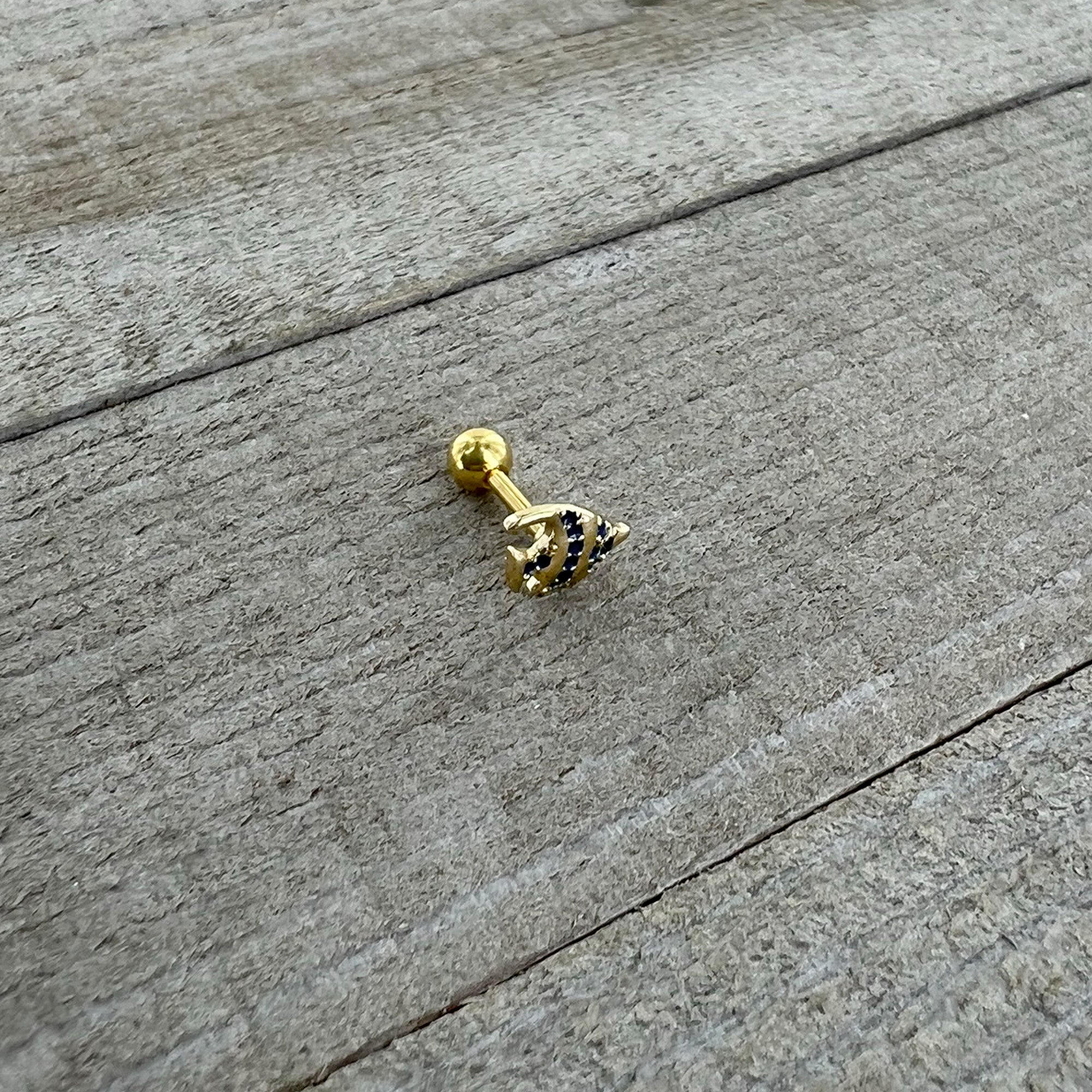 Your cartilage piercings will look downright angelic when you're rocking this 16 gauge cartilage stud! It's made with a 6mm gold tone PVD over 316L surgical grade stainless steel straight barbell with a 4mm ball end. It features an angelfish charm, set with deep blue embellishment for an elegant color contrast. You can even rock this aquatic beauty in multiple piercings including tragus, helix, and some conch piercings! Give your cartilage piercing a nifty, nautical look with this elegant angelfish tragus stud!