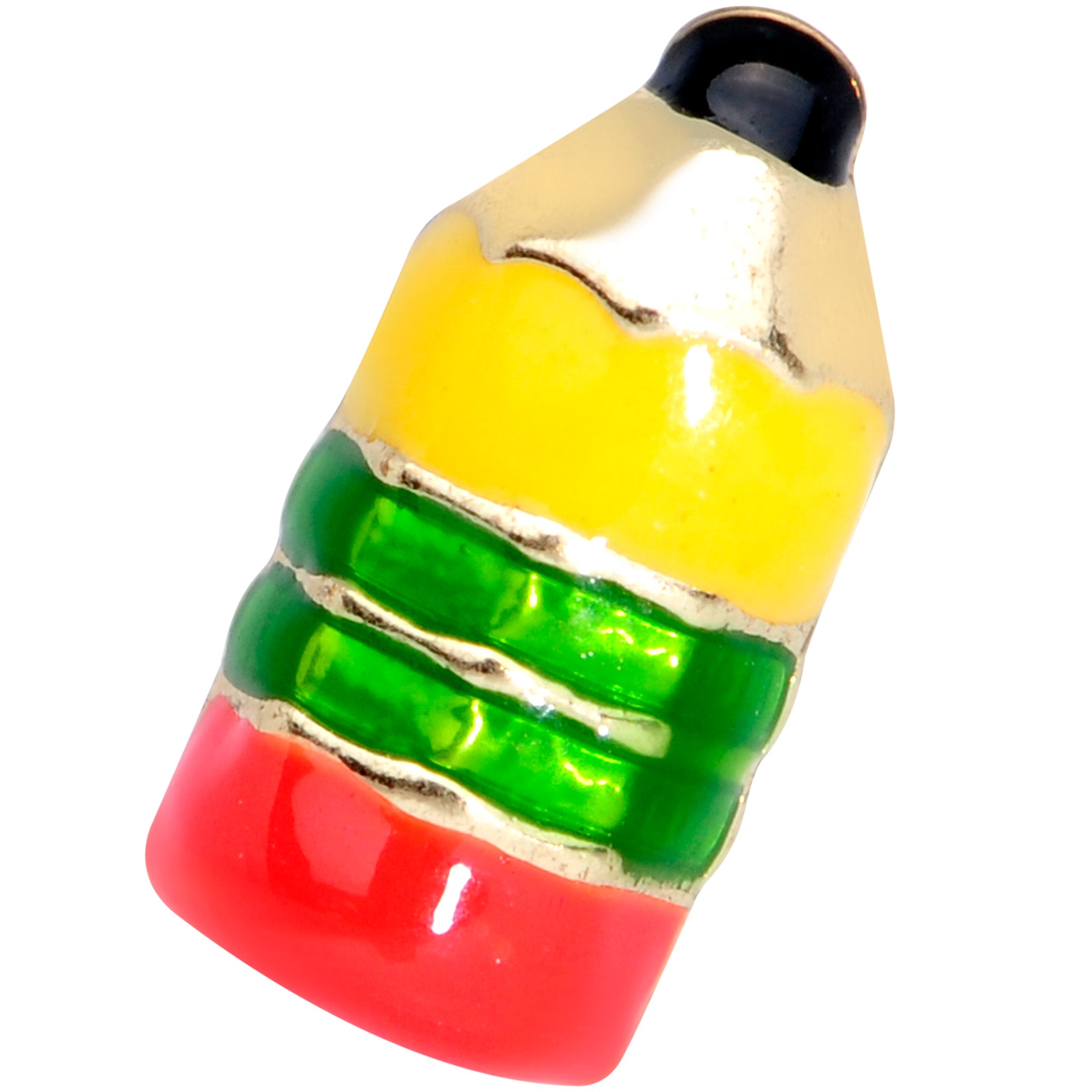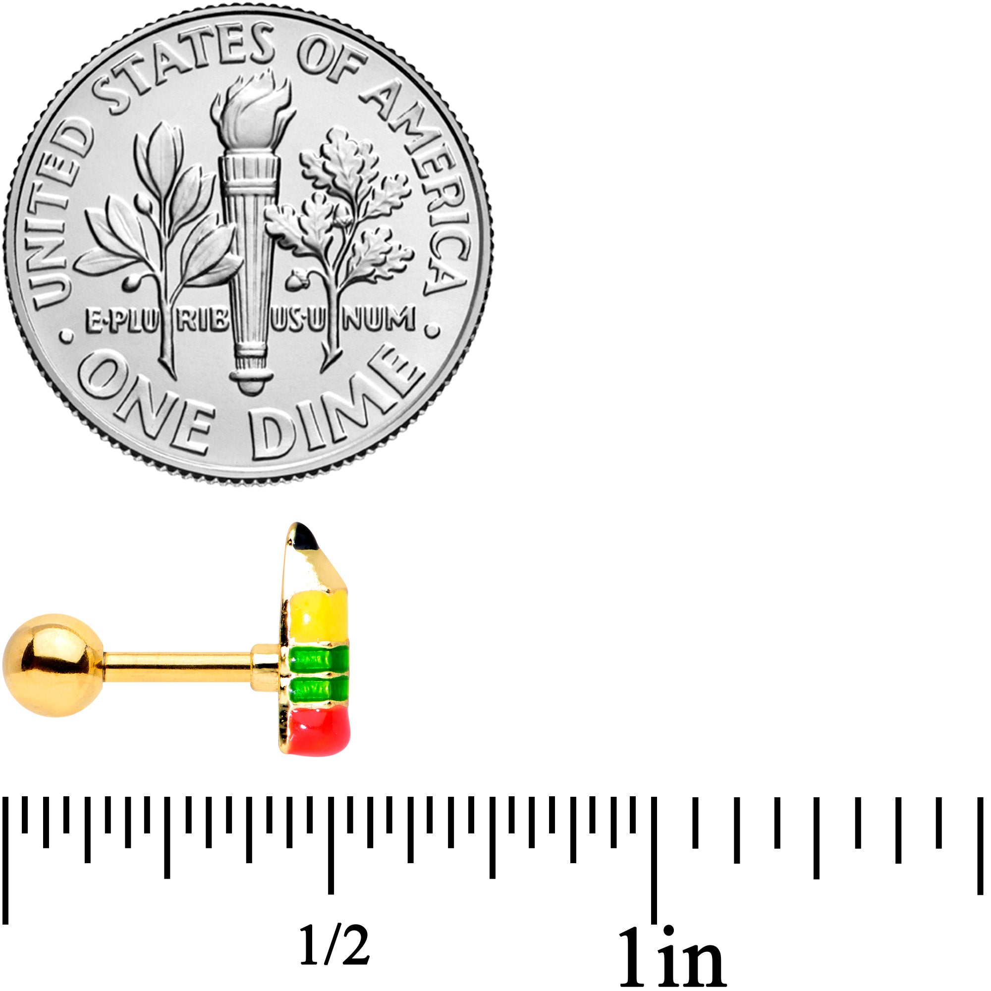 If you are always drawing or writing then this 16 gauge pencil tragus stud is just right for you. Made with a 6mm gold tone PVD over 316L surgical grade stainless steel straight barbell, it has a 4mm ball end. The front of this cartilage jewelry features a pencil charm end with a detailed point and eraser for style you'll want to write home about! And you can make your point in multiple piercings including tragus, helix, and some conch piercings! Now that's something to make a note of!
