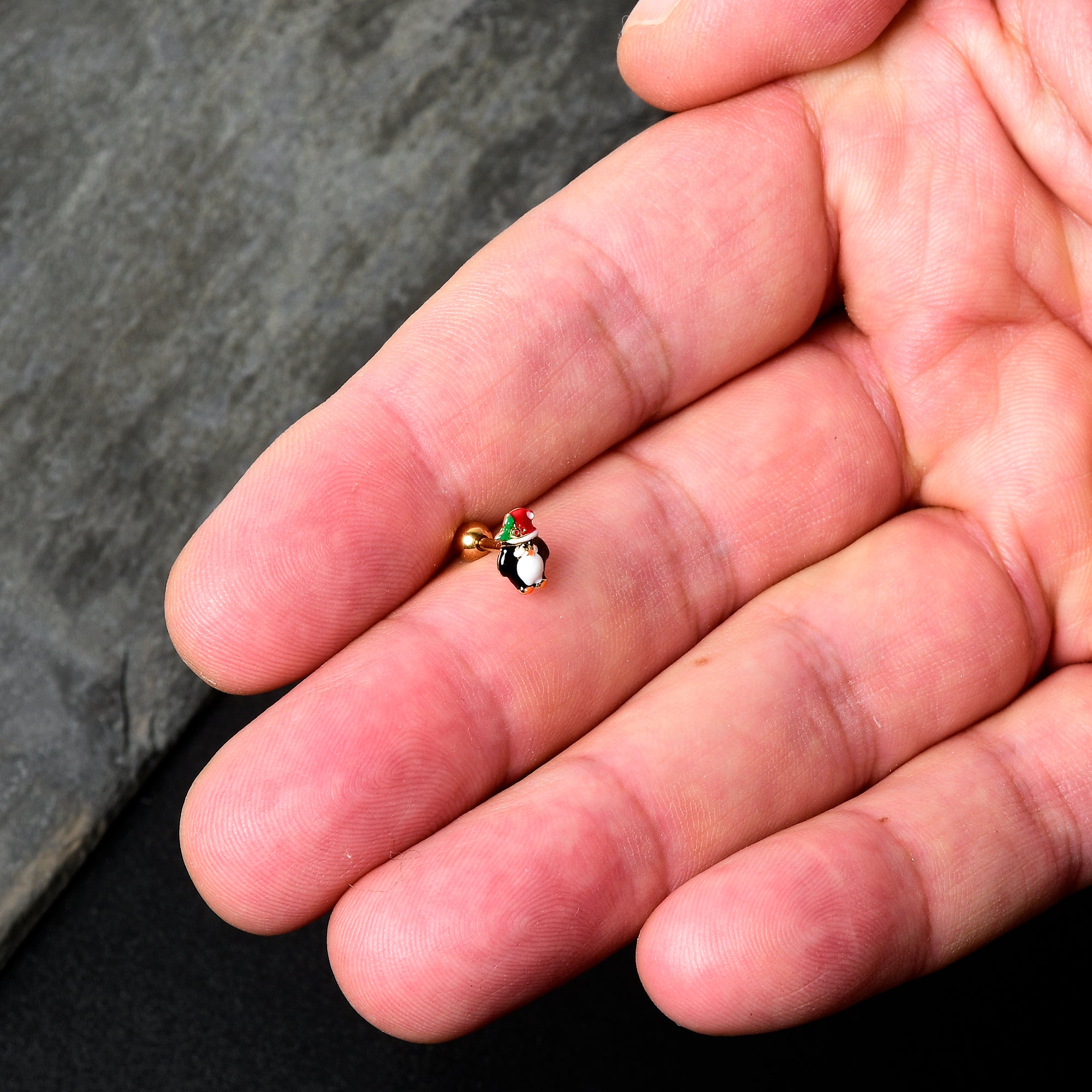You want to dress to impress for the holidays, like the penguin on this 16 gauge tragus stud! It's made with a 6mm gold tone PVD over 316L surgical grade stainless steel straight barbell with a 4mm ball end. It features a penguin charm, with the penguin rocking its traditional black and white. The penguin is also sporting a festive Santa cap, embellished with a sprig of holly. You can even rock it in multiple piercings including tragus, helix, and some conch piercings. You'll be rocking your finest when you're rocking this merry penguin cartilage piercing ring.