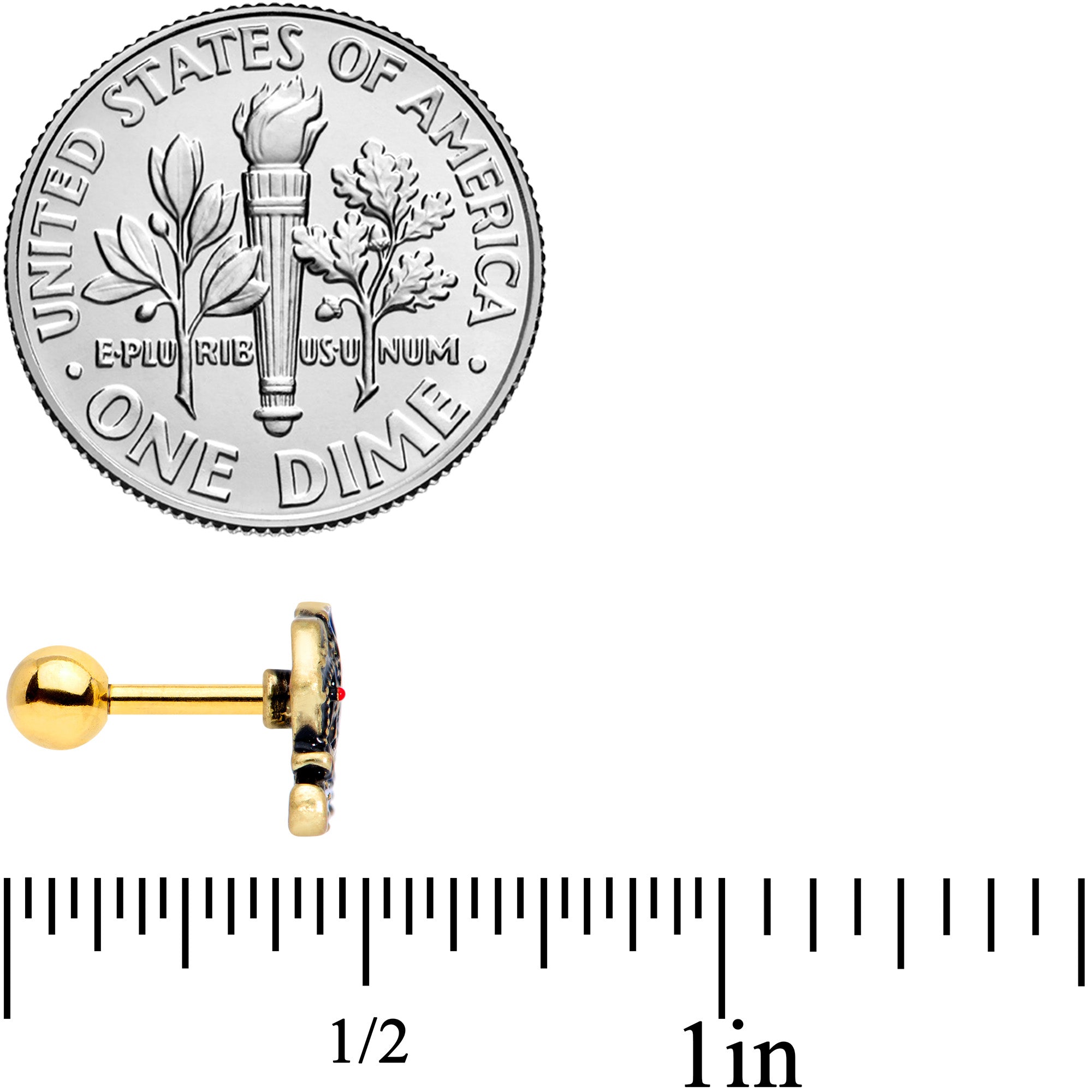 The elephant on this 16 gauge tragus stud is dressed to impress its fanciest finery! It's made with a 6mm gold tone PVD over 316L surgical grade stainless steel straight barbell with a 4mm ball end and features an elephant charm, heavily embellished with a blue and red blanket across its back and white bands around its legs. And this elephant can be worn in multiple piercings including helix, tragus, and some conch piercings. Add a lavishly ornate appearance to your cartilage piercing with this elegantly embellished elephant!