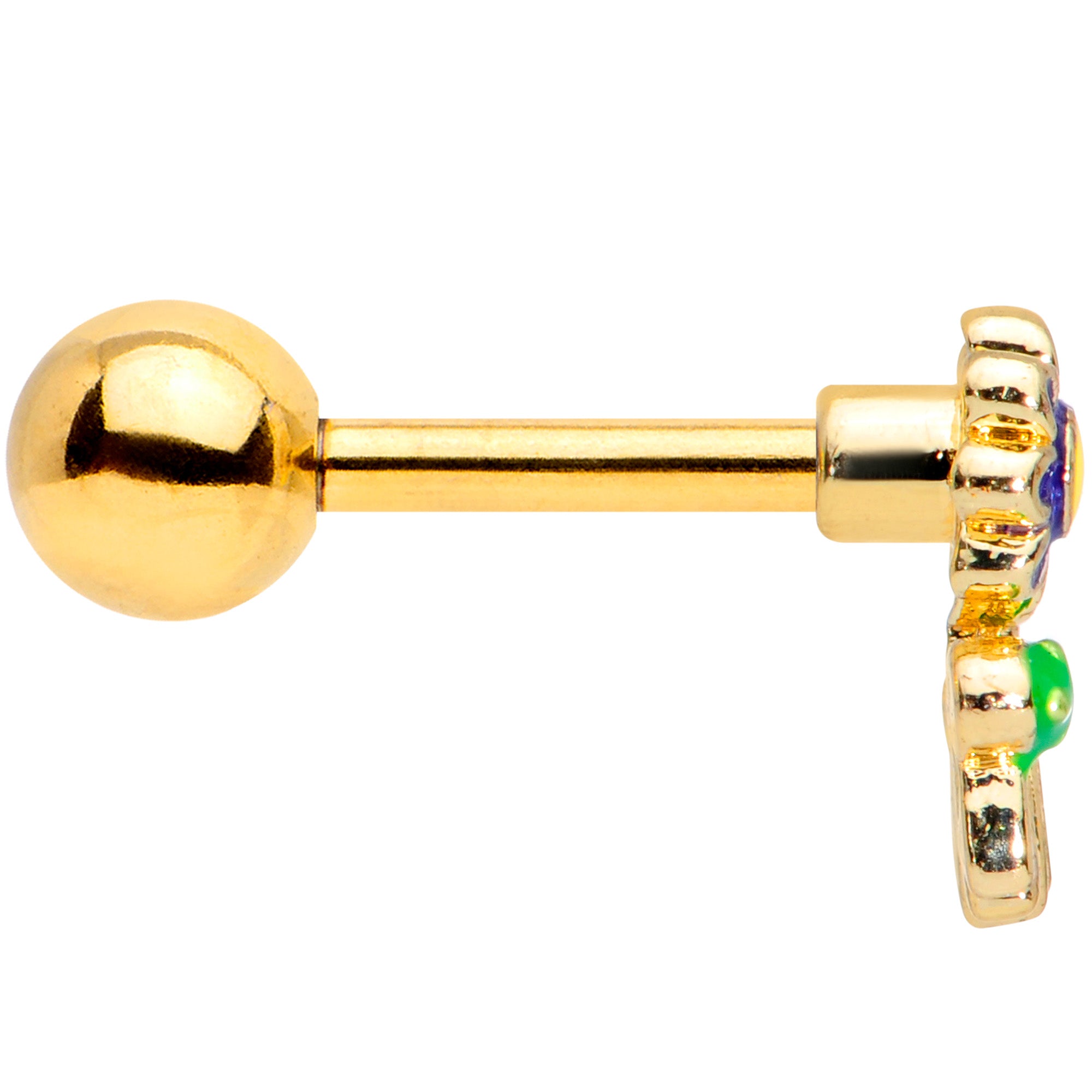 This psychedelic-style 16 gauge cartilage stud will have you feeling like you've stumbled upon a wonderland of colors! It's made with a 6mm gold tone PVD over 316L surgical grade stainless steel straight barbell with a 4mm ball end. This cartilage earring features a dark blue flower charm with a yellow center. To its left is a magic mushroom and to the right of the flower is a little snail, which appears to be climbing the flower's stem. And it works well in multiple cartilage piercings including tragus, helix, and conch piercings. This wonderfully colorful tragus stud will give your cartilage piercing the perfect trippy hippie look!