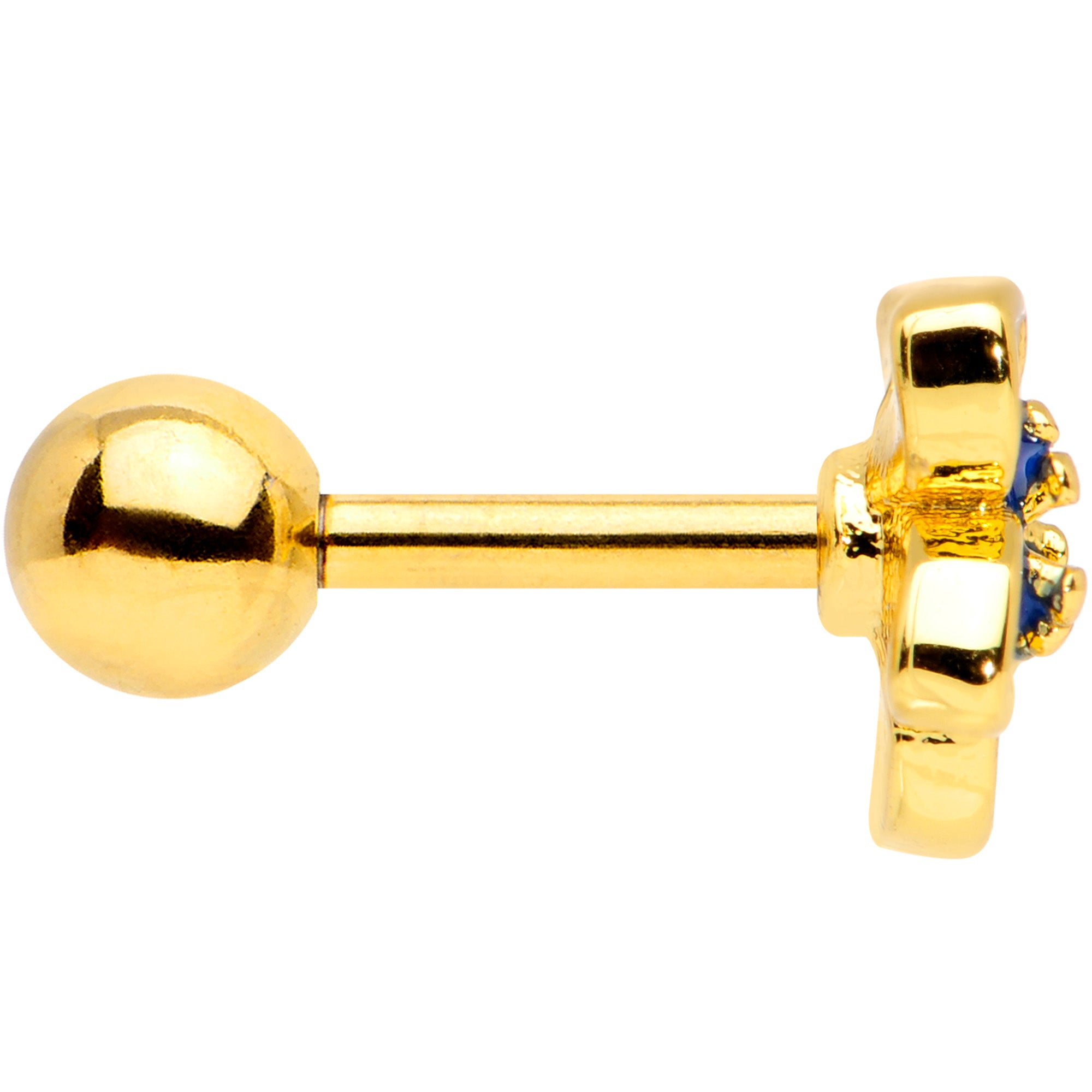 Time to replace the winter blahs with springtime hues and blues with this 16 gauge tragus stud! It's made with a 6mm gold tone PVD over 316L surgical grade stainless steel straight barbell with a 4mm ball end. It features a blue and white flower charm, which is embellished with cohesive detailing. Best of all, you can flaunt this flower in multiple piercings including helix, tragus, and some conch piercings. Let the blues blossom into beauty with this fabulous floral cartilage jewelry!