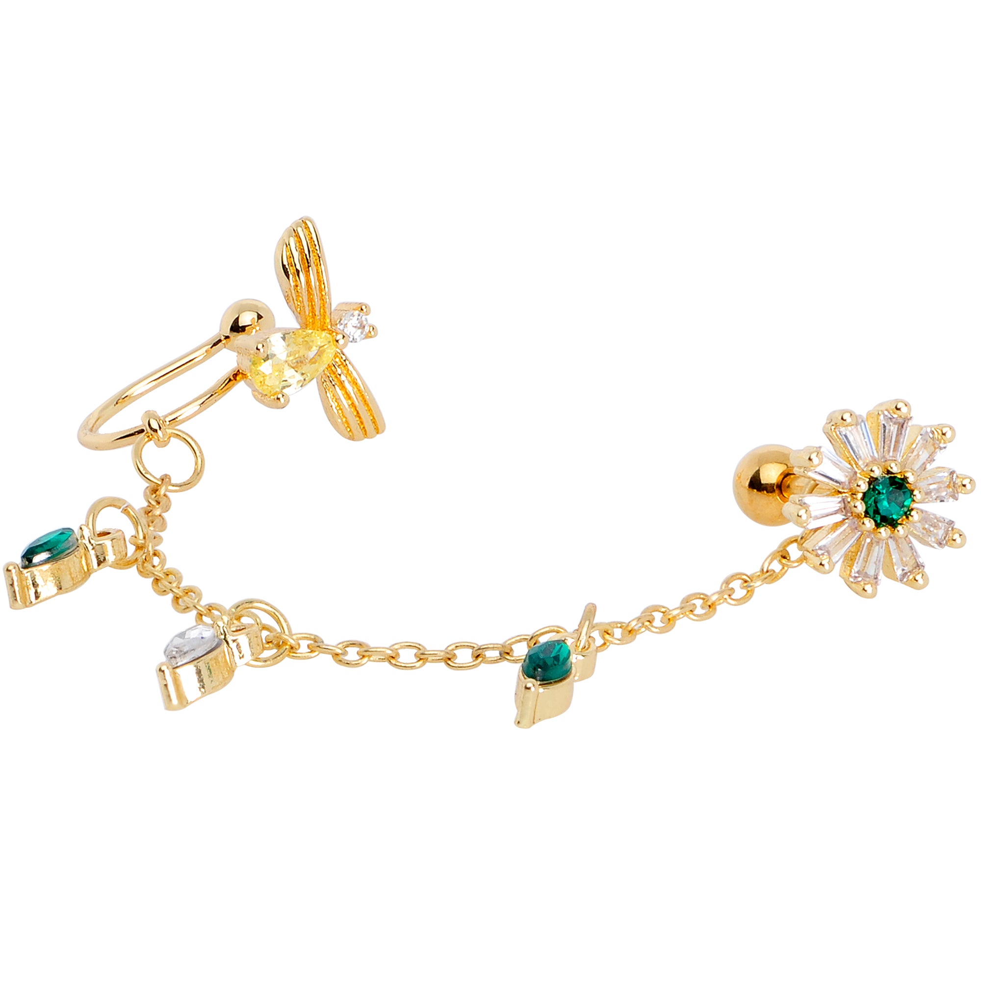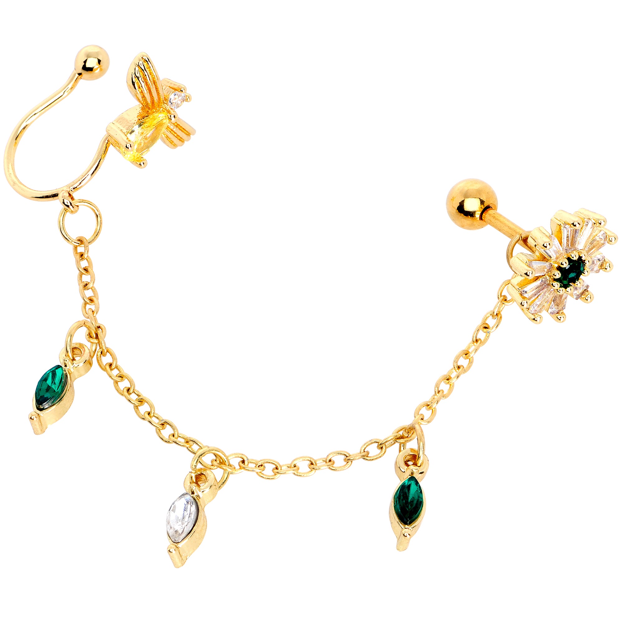 Don't hope there's an angel on your shoulder, make sure there's one in your ear with this 16 gauge dangle cartilage jewelry for your left ear! Made with a 6mm gold tone plated over 316L surgical grade stainless steel straight barbell with a 4mm ball end, the cartilage stud portion features a daisy flower charm with clear gem petals and a green gem center. The nonpierced cuff portion features an angel charm with clear and yellow gems. The cuff can be gently pinched shut and worn on your helix or earlobe and is connected to the cartilage stud by a 2" length of chain. The chain supports three green gem oval dangles and a clear gem dangle. It's like having an entire ear project in one piece of body jewelry!