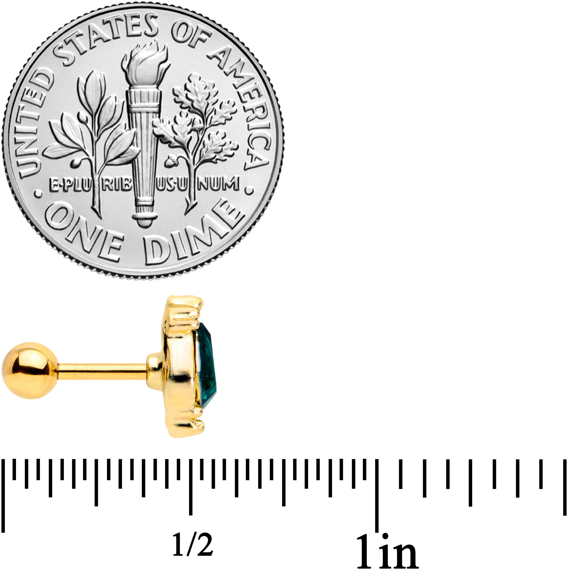 This 16 gauge cartilage stud combines colors and simple shapes for a feel that's luxurious. It's made with a 6mm gold tone PVD over 316L surgical grade stainless steel straight barbell with a 4mm ball end and features a drop-shaped gem charm in a rich deep green. And it works well in multiple piercings such as tragus, helix, and some conch piercings. Whether you're headed for a sumptuous soiree or simply want a look of simple elegance, you'll get both with this stunning tragus stud!