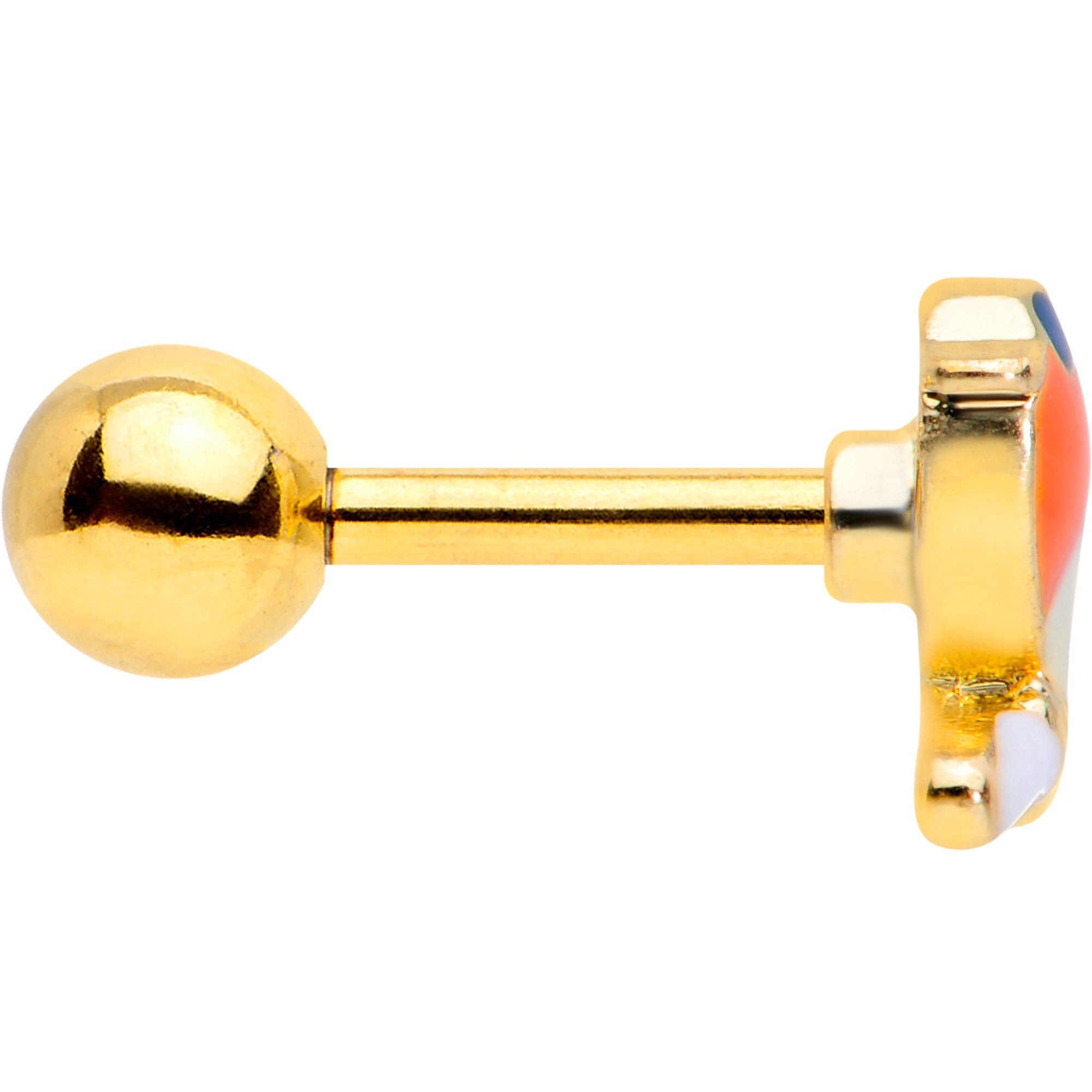 Let this beautiful bird pull up a perch in your cartilage piercing with this 16 gauge tragus stud! It's made with a 6mm gold tone PVD over 316L surgical grade stainless steel straight barbell with a 4mm ball end. The front features a gorgeous orange and white songbird charm with a green gem eye and matching green embellishment. Best of all, this little bird can perch in multiple piercings including helix, tragus, and some conch piercings. With such stunning details, this beautiful bird cartilage jewelry will make you want to burst into song!