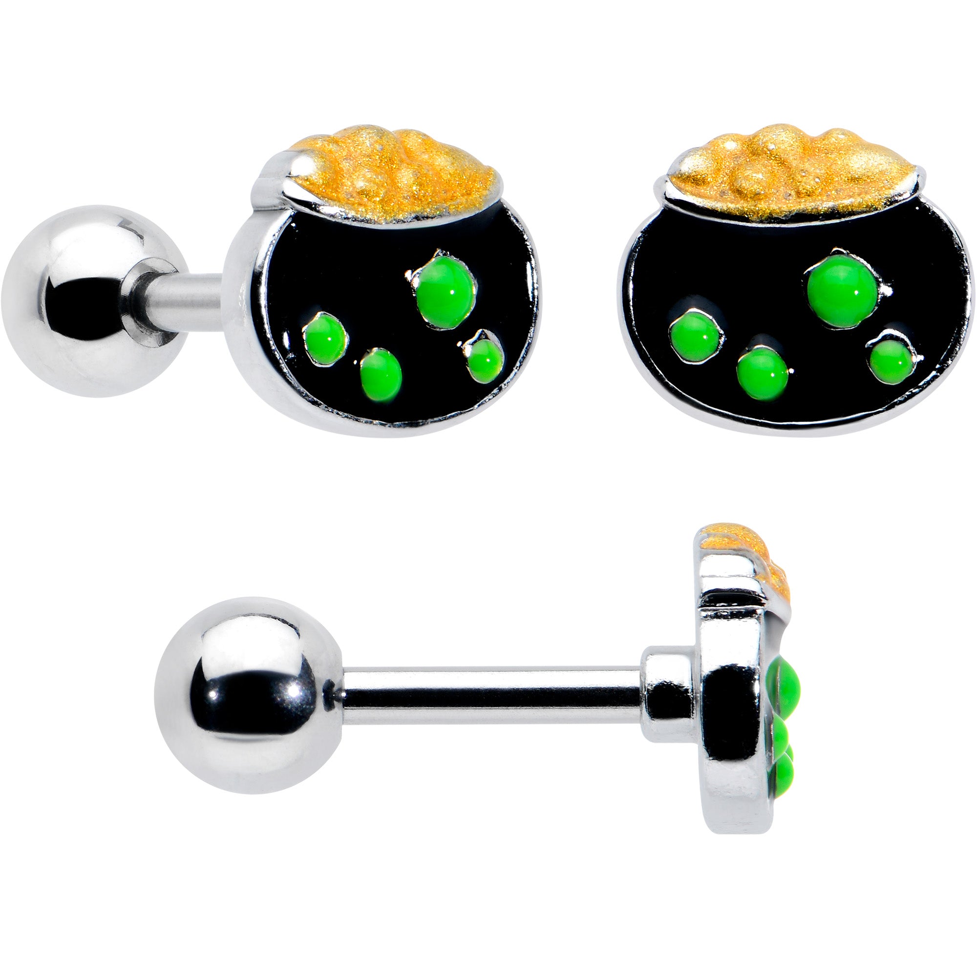 Have a look for every occasion this St Patrick's Day with this set of 16 gauge tragus studs! They're made with 6mm durable 316L surgical grade stainless steel barbells with 4mm ball ends. One features a shamrock charm, inlaid in black and set with small green gems.. The second features a black ball end for a look that goes with everything. The third one features a pot of gold charm, with matching black inlay, a yellow top, and green shamrock embellishment. You can even rock them in multiple piercings including tragus, helix, and some conch piercings! You'll be looking good, feeling lucky, and ready for anything with these St Patrick's Day themed cartilage piercing rings! Sold as a set of three.