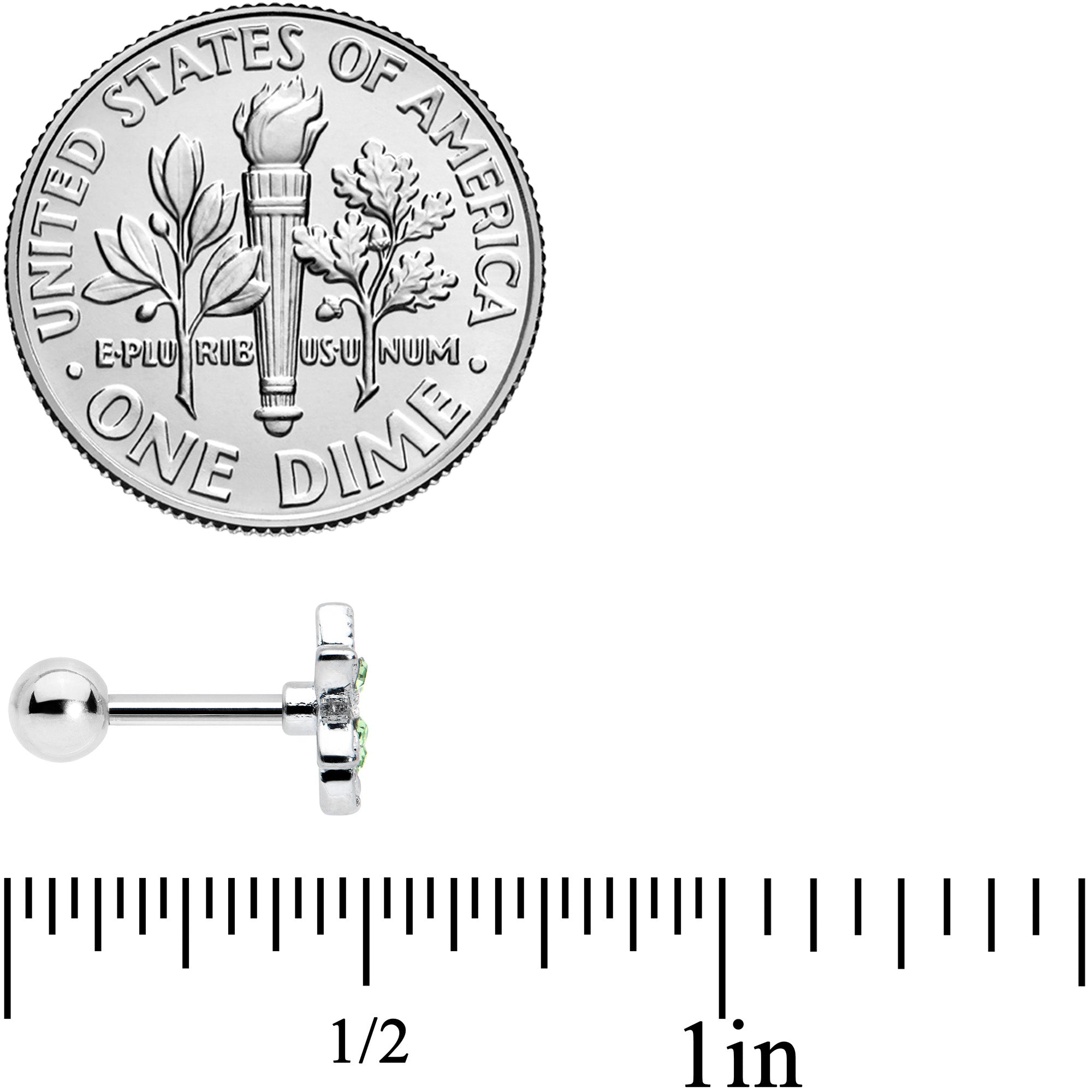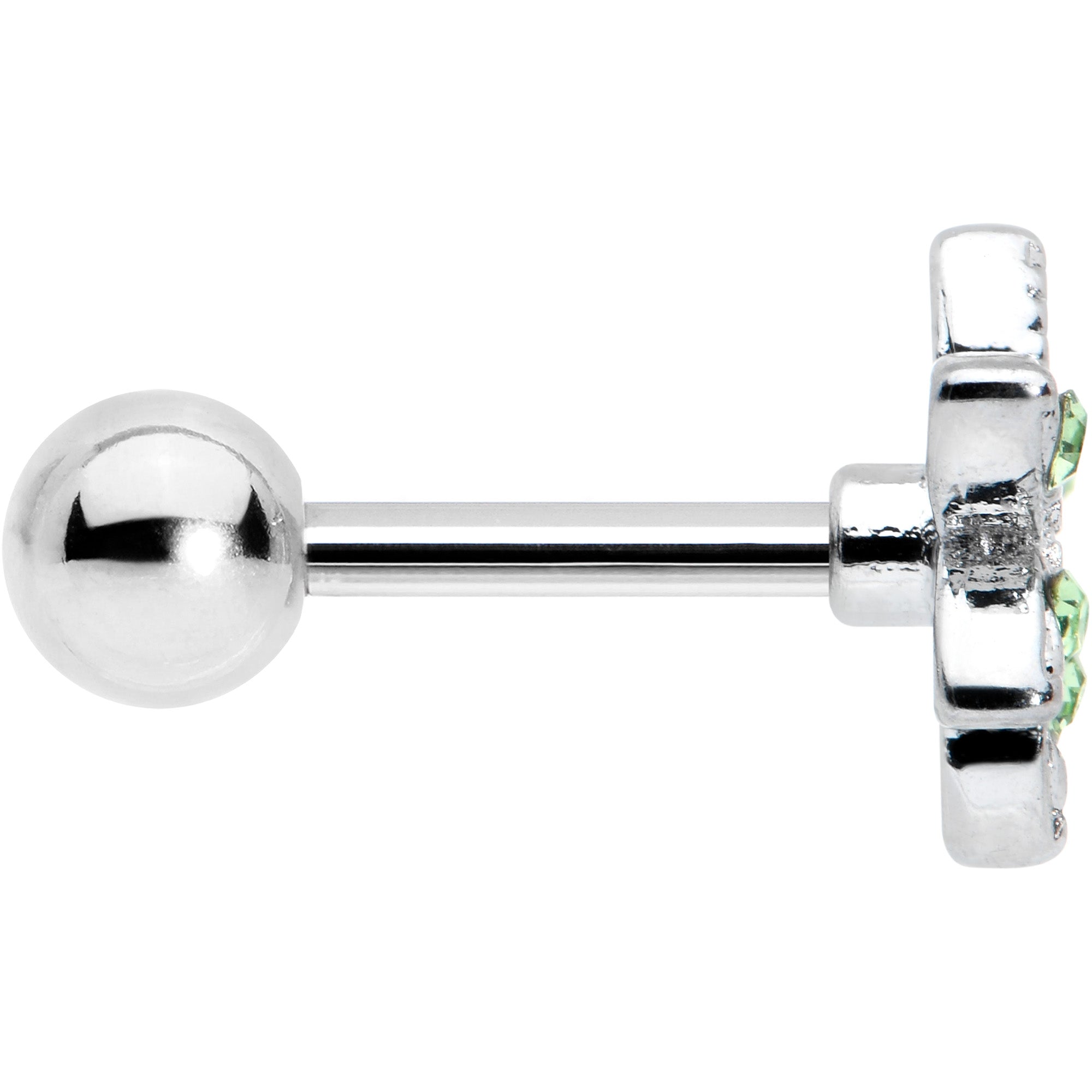 The pot leaf on this 16 gauge tragus stud packs a powerful punch....of style! It's made with a 6mm durable 316L surgical grade stainless steel straight barbell with a 4mm ball end. It features a pot leaf charm, with five leaves composed of single green gems. The topmost leaf is an open loop with textured detailing for an eye-catching appearance. You can even rock this cartilage jewelry in multiple piercings including tragus, helix, and some conch piercings! You'll be stoned on style when you're rocking this gorgeous, ganja-themed cartilage stud!