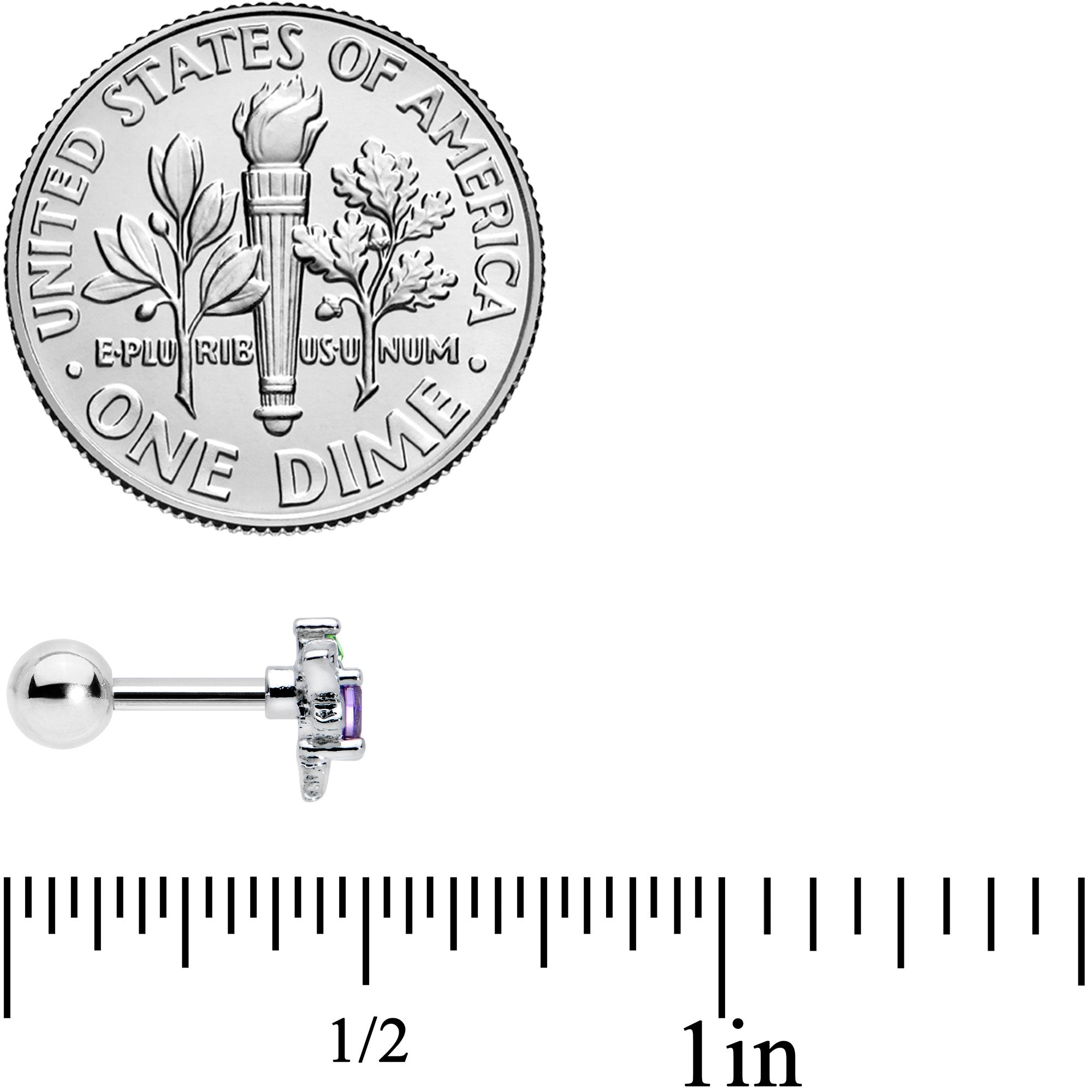The delightful dragonfly on this 16 gauge cartilage stud is so lovely it's almost magical! It's made with a 6mm durable 316L surgical grade stainless steel straight barbell with a 4mm ball end. It features a dragonfly charm, with openwork wings and cohesive detailing that won't overwhelm. It also features a purple gem body and green gem head for a striking touch of color that'll cast a spell on you! You can wear it in multiple piercings including helix, tragus, and some conch piercings! Give your cartilage piercings a touch of nature with this delicious dragonfly tragus stud.