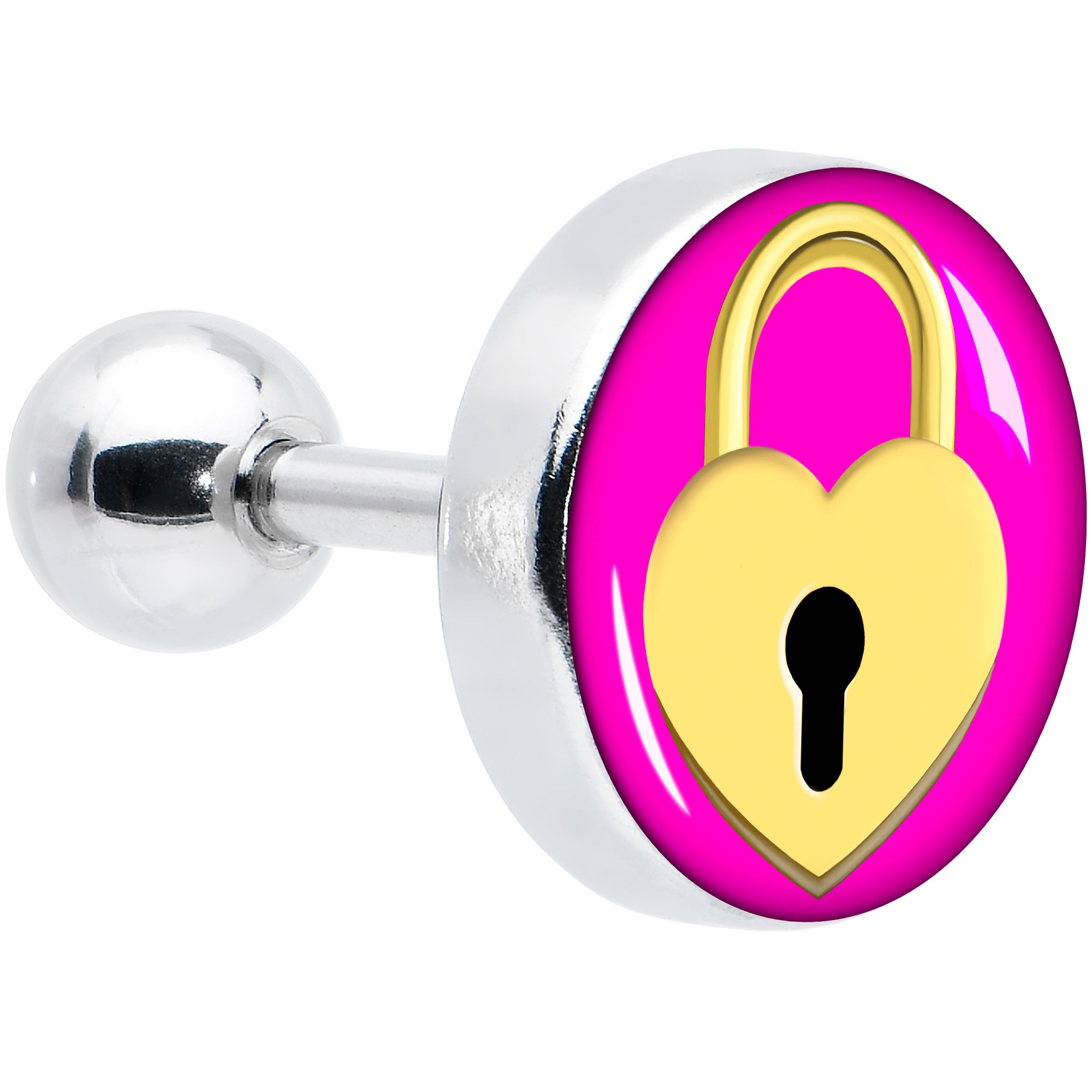 You will have a lock on style with this 16 gauge tragus stud. It is made with a 6mm durable 316L surgical grade stainless steel straight barbell with a 4mm ball end. It features a pink disc with a padlock on it. The padlock features a heart shape and a deep golden yellow color and you can rock it in multiple piercings including tragus, helix, and some conch piercings. Show the world that you keep your feelings locked up tight with this heart padlock cartilage piercing jewelry.