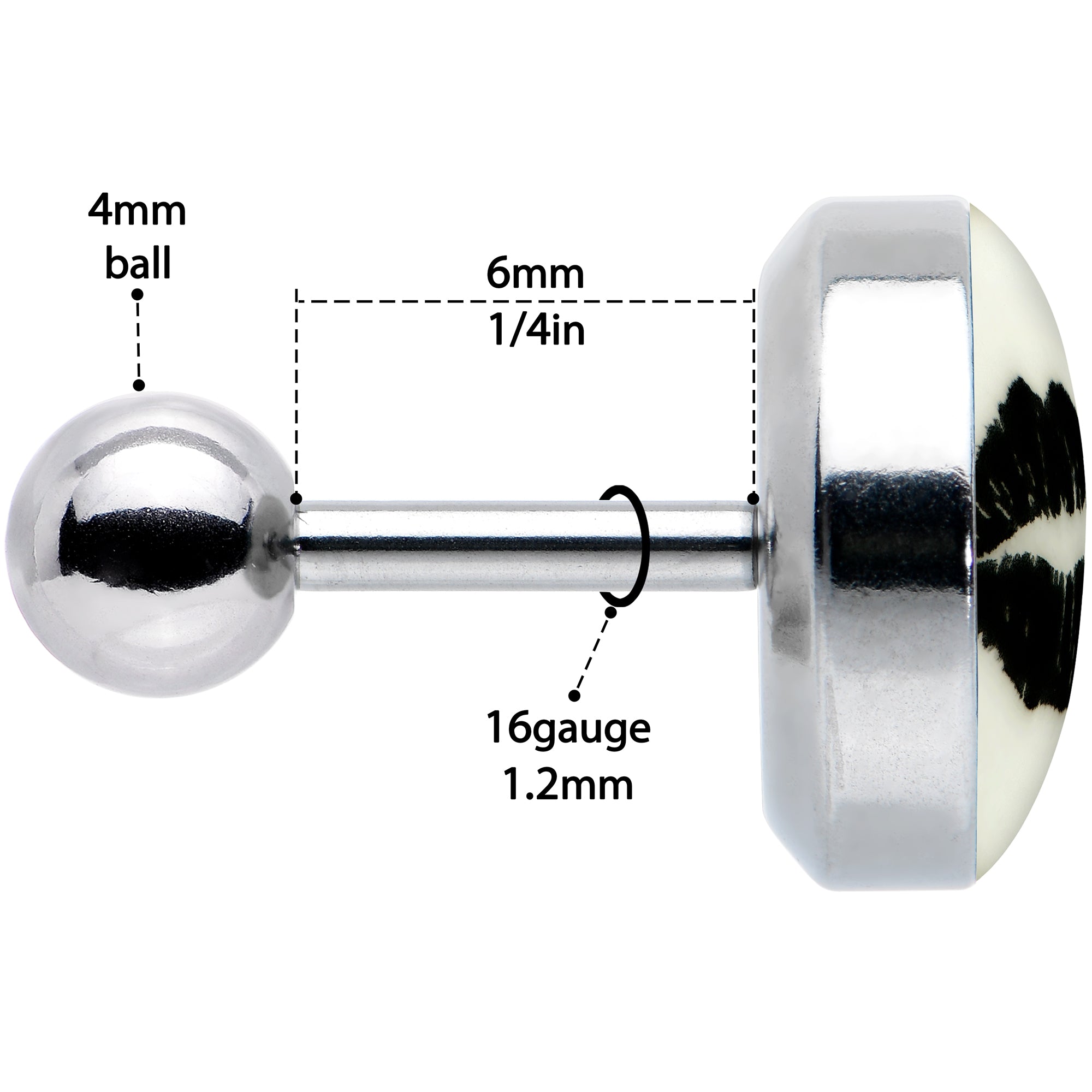 Give your look a great big kiss of style with this 16 gauge tragus stud. It is made with a 6mm durable 316L stainless steel straight barbell with a 4mm ball end. It features a black kiss mark on a glow in the dark charm and features fine detailing on the lips for a realistic appearance. You can even rock it in multiple piercings including tragus, helix, and some conch piercings. Give your piercings a whole lot of love with this romantic and eye catching cartilage piercing earring.