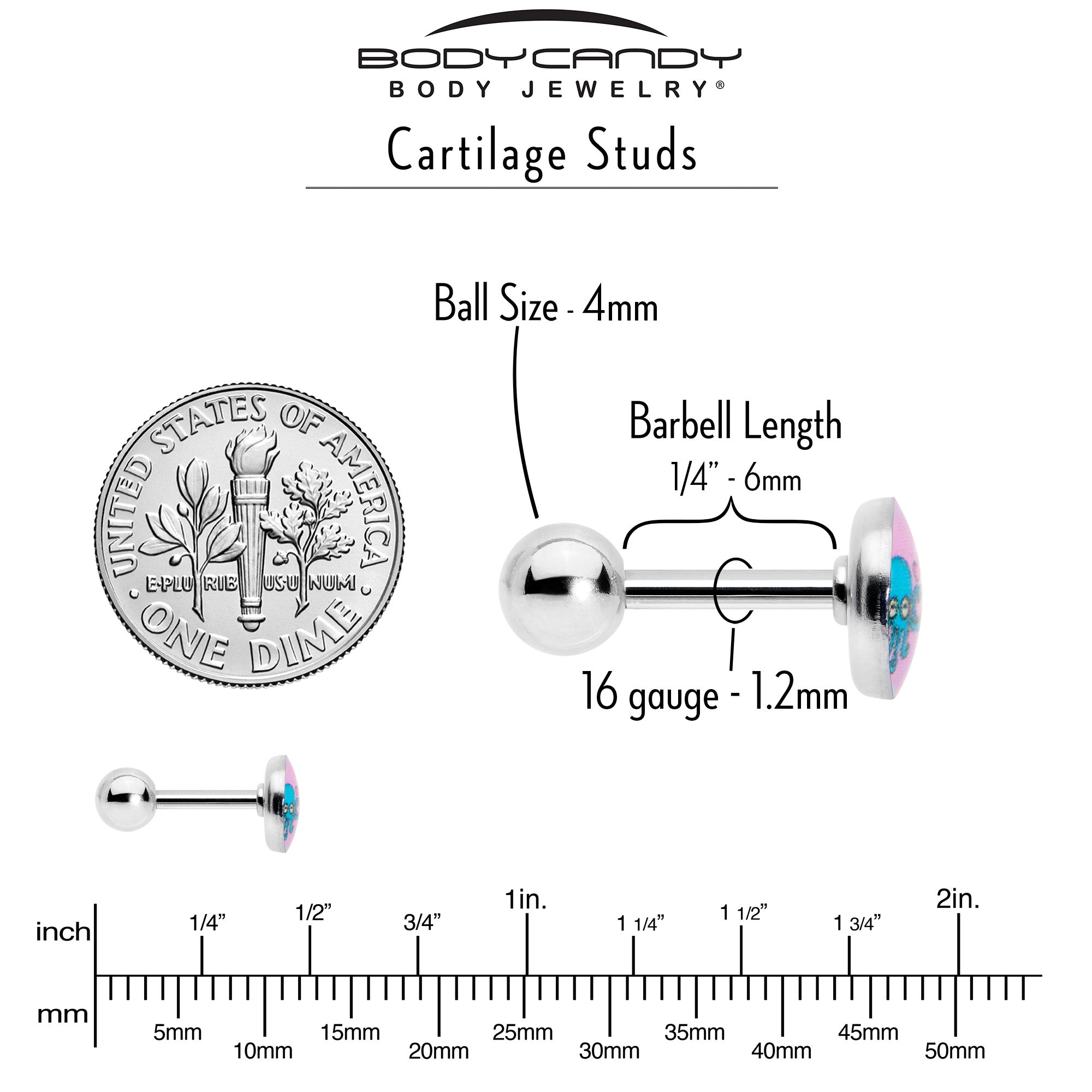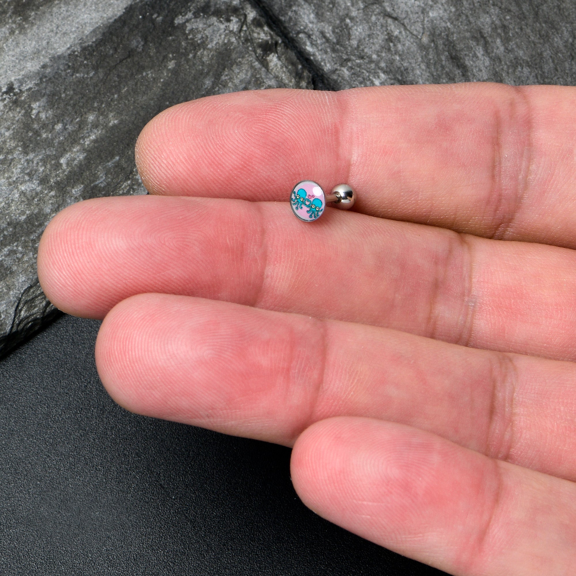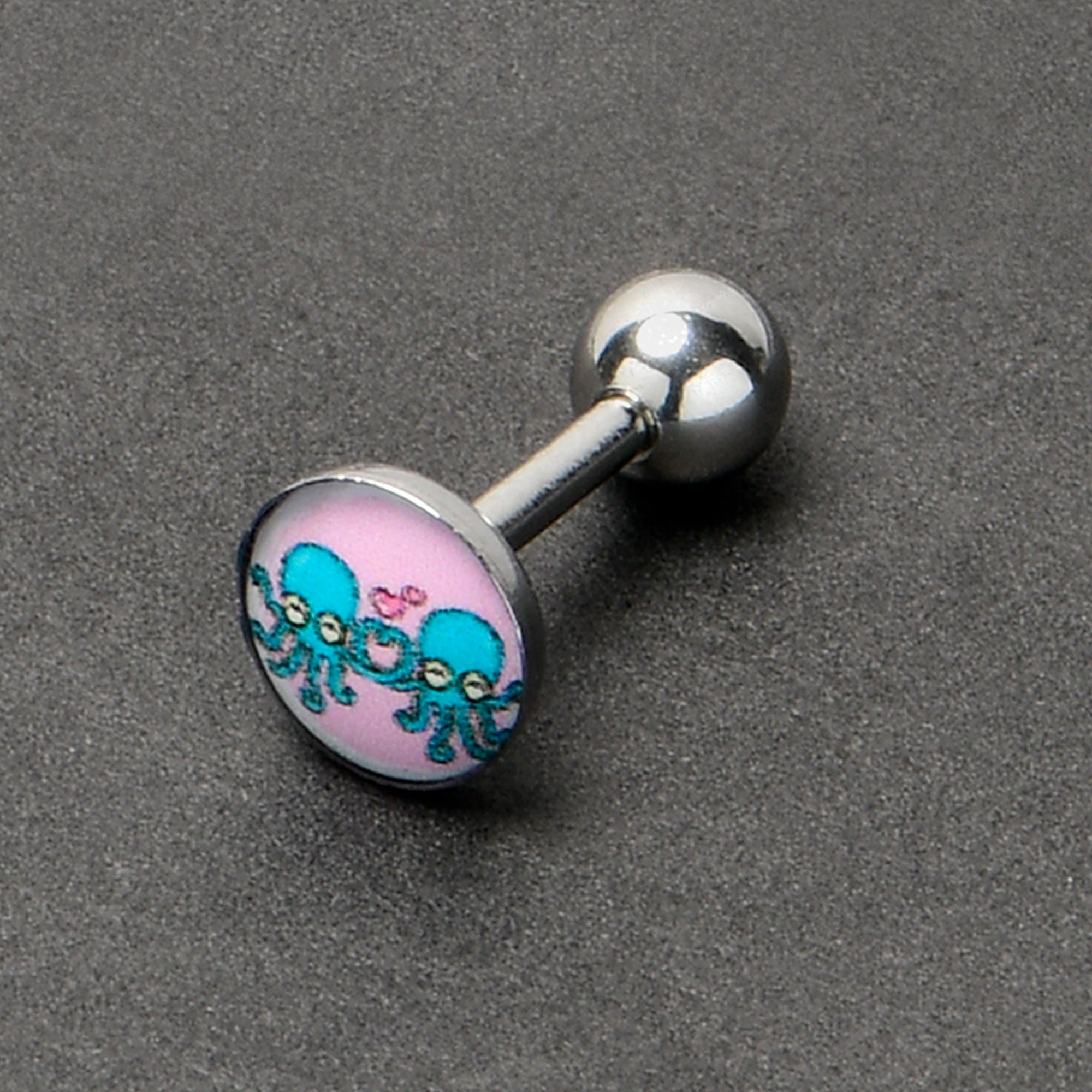 Feel the love with your heart, or with all eight legs when you are rocking this 16 gauge tragus stud. It is made with a 6mm durable 316L surgical grade stainless steel straight barbell with a 4mm ball end. The front end features a pink disc charm that show a pair of blue octopi, embellished with a deep pink heart above them. You can sport these cephalopods in multiple piercings including tragus, helix, and some conch piercings. Let love take you in its tentacles with this awesome octopus cartilage piercing jewelry.