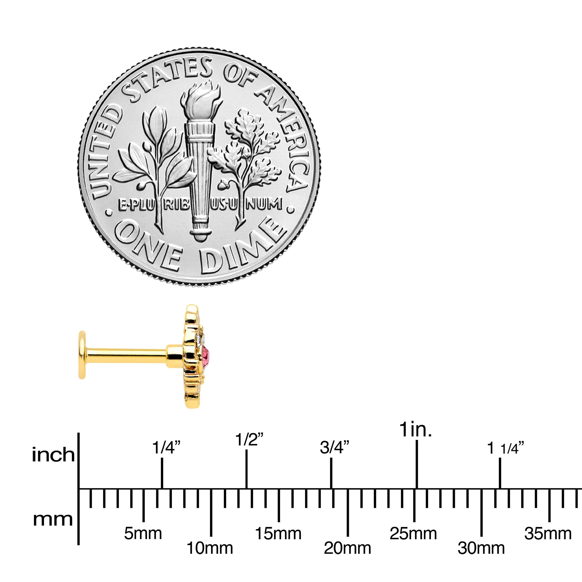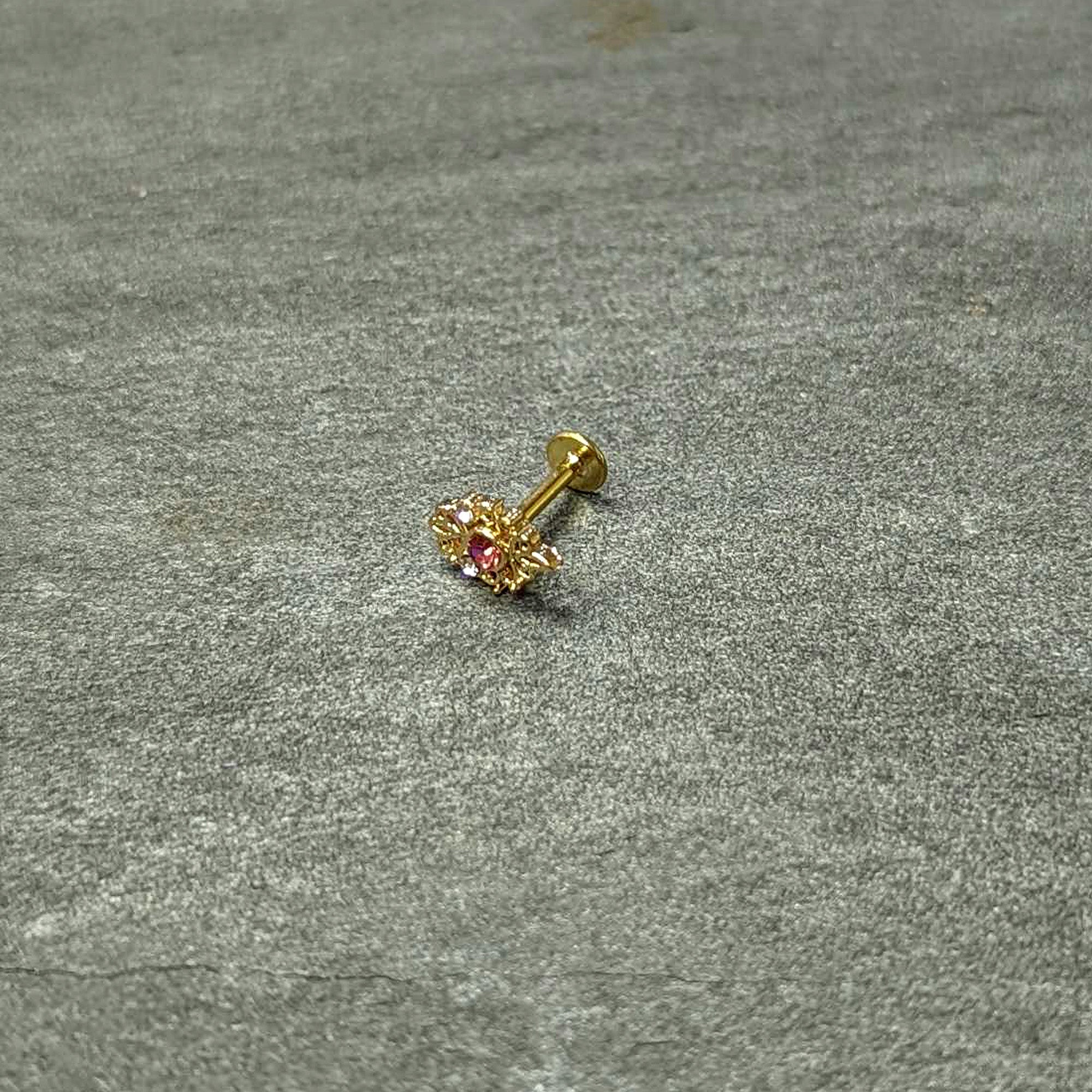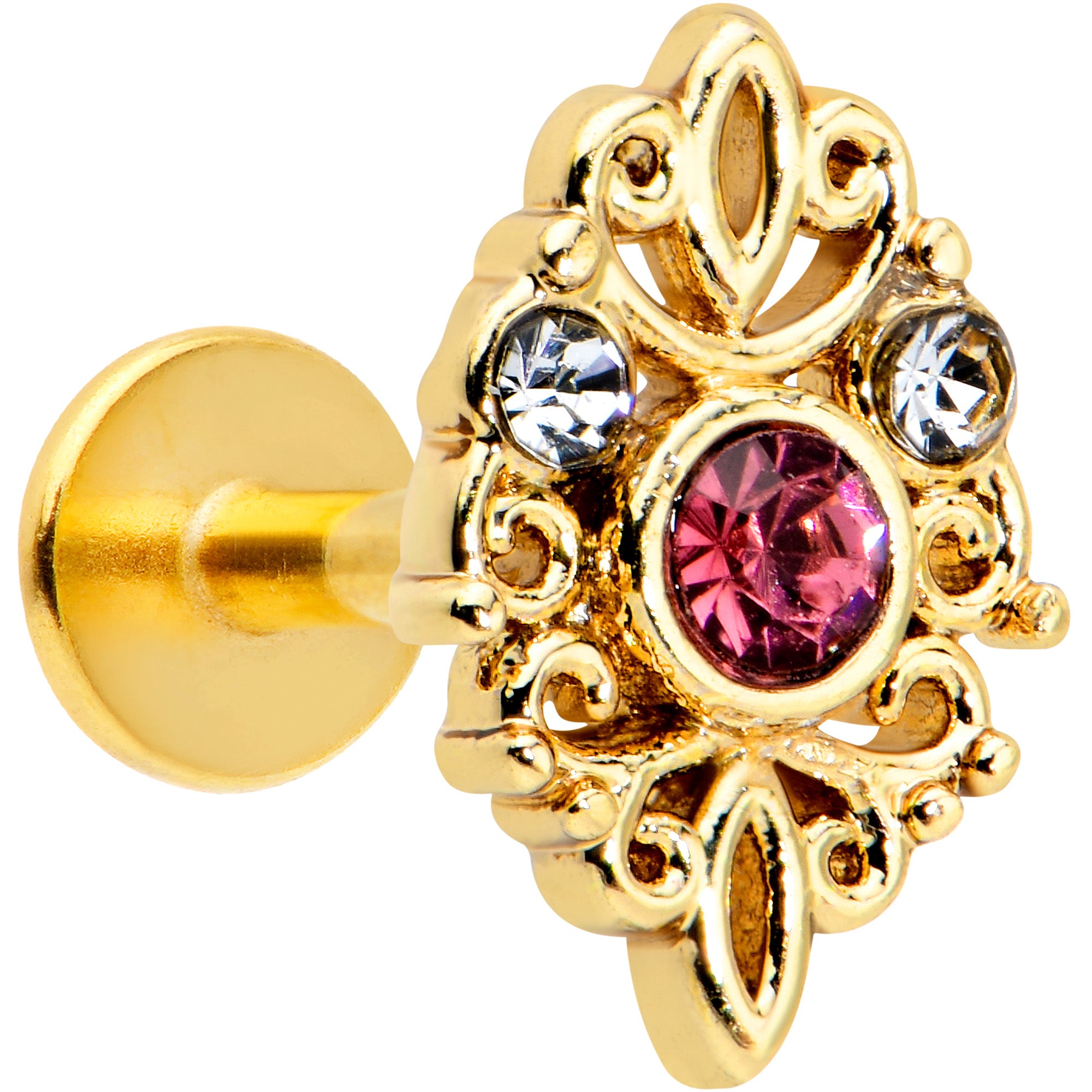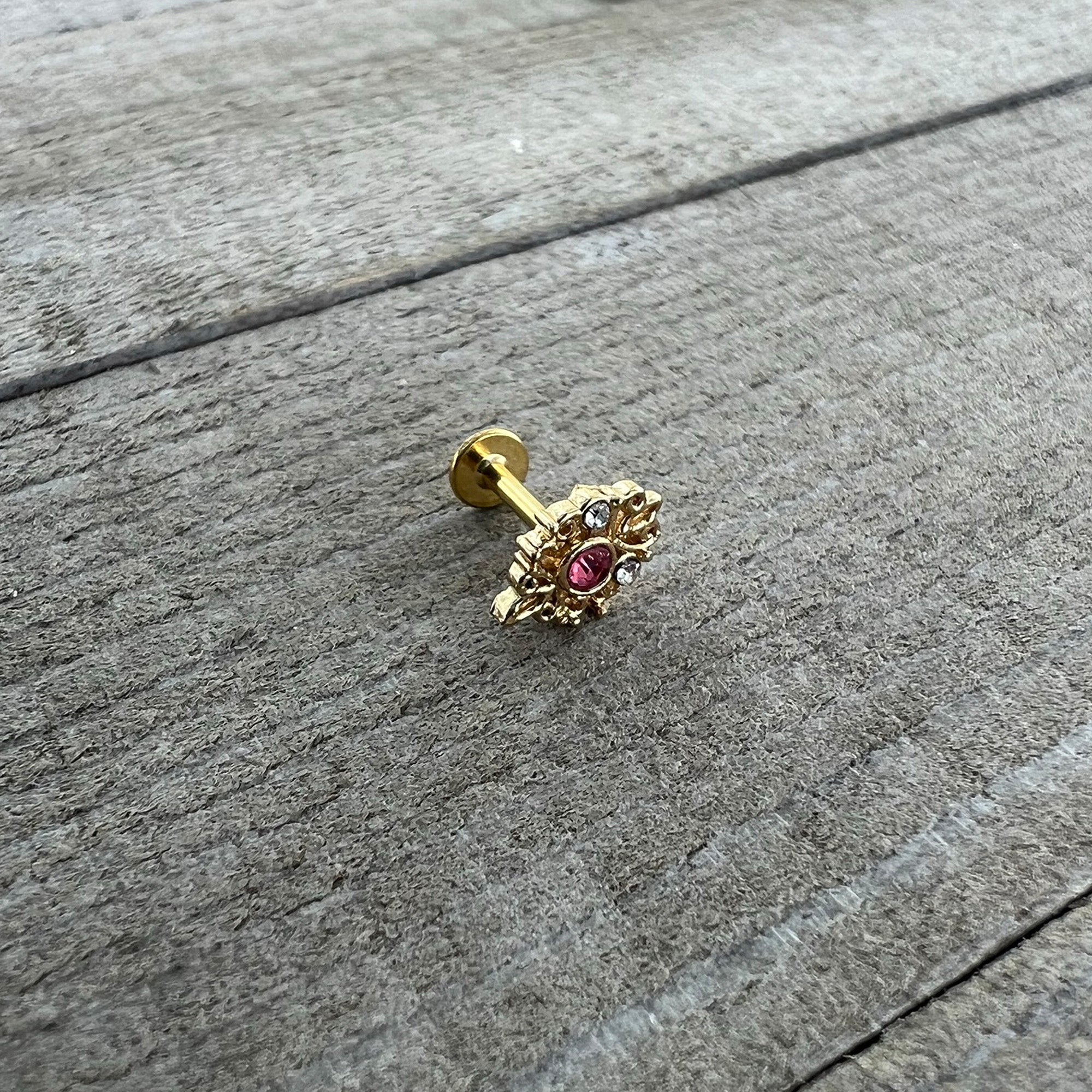 This 16 gauge cartilage jewelry is sure to make you love its lacy look! It's made with a 6mm gold tone PVD over 316L surgical grade stainless steel straight barbell with a flat disc end. It features a lacy, openwork charm with looping details. It's set at the center with a large pink gem and is further embellished with a pair of small clear gems. You can even rock this cartilage ring in multiple piercings including tragus, helix, and some conch piercings. This cartilage earring is sure to turn you into a lace lover!