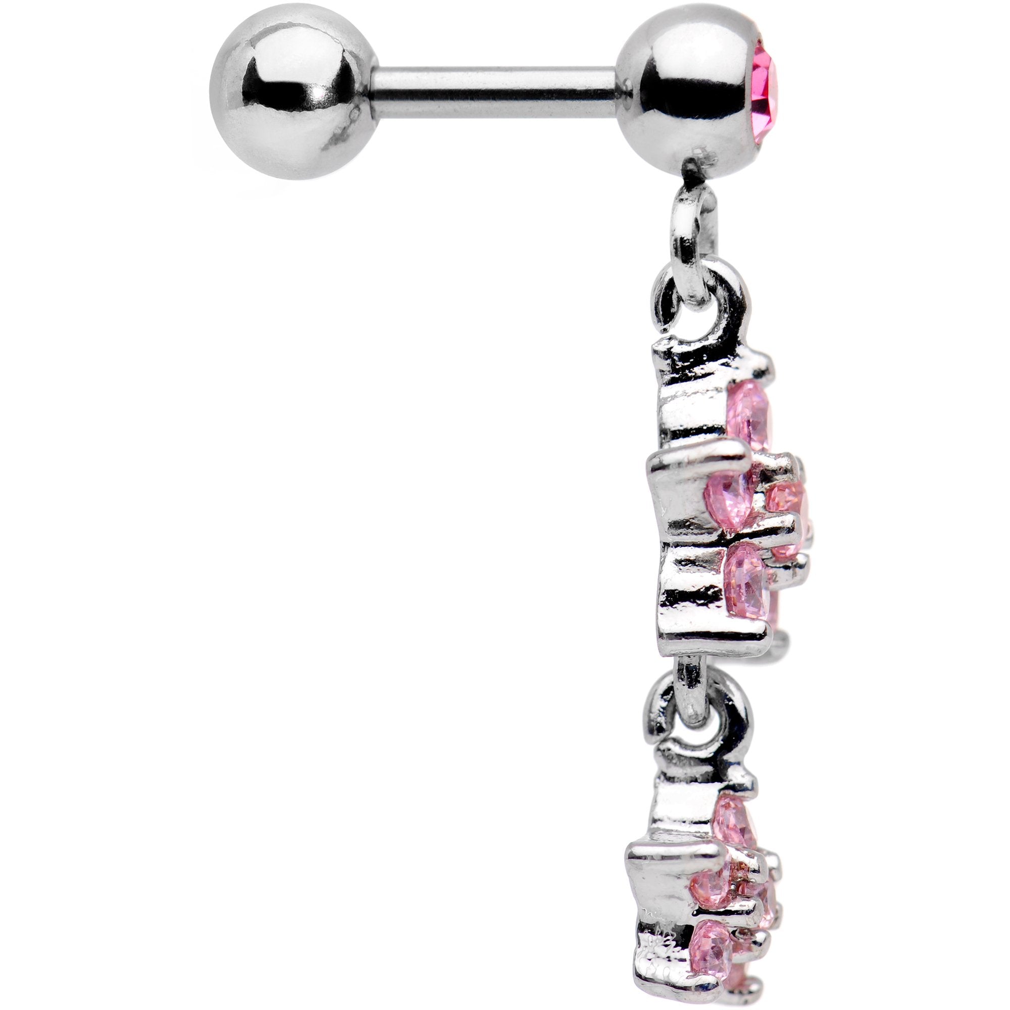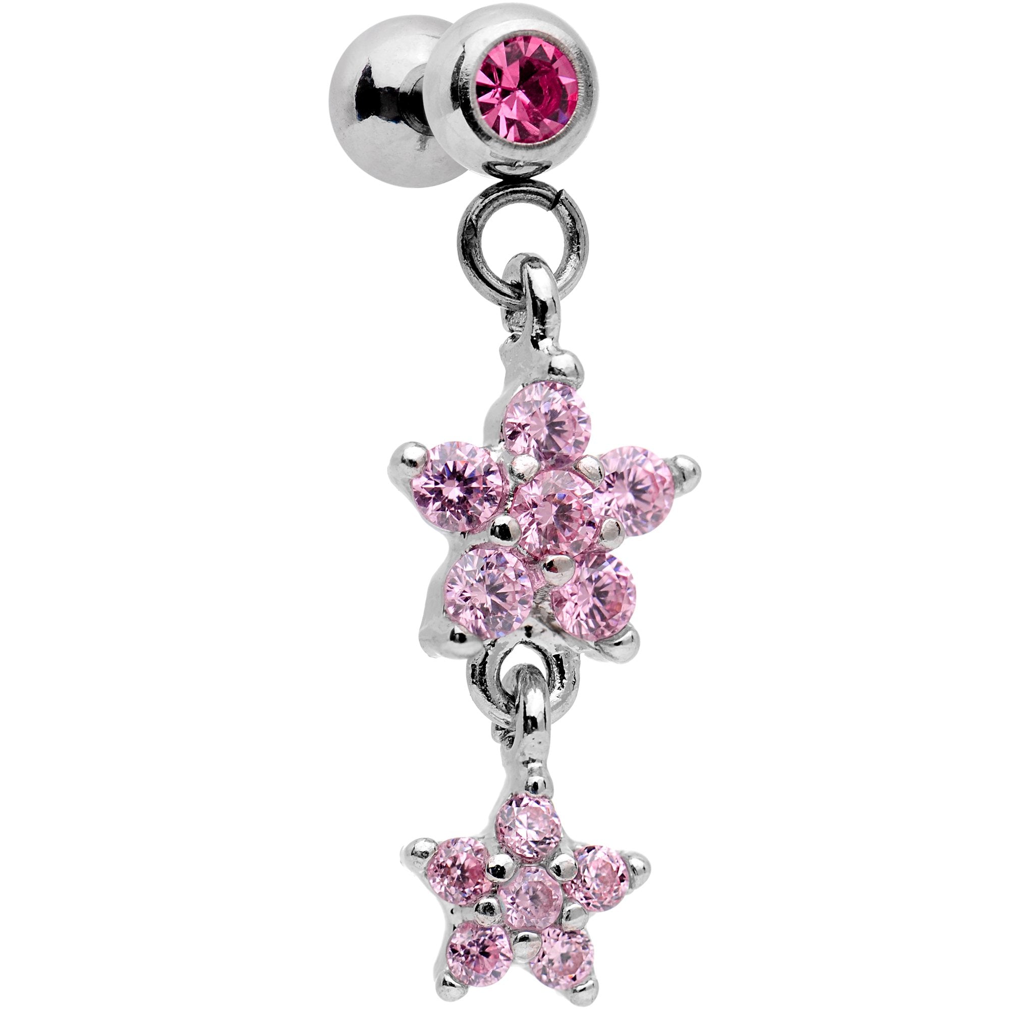 This awesome cartilage jewelry features not one star, but two! Two beautiful pink gem star gems dangle from this fun 16 gauge cartilage tragus piercing. The star charms are mounted on a 6mm straight barbell made with durable 316L surgical grade stainless steel and capped with an extra pink gem.