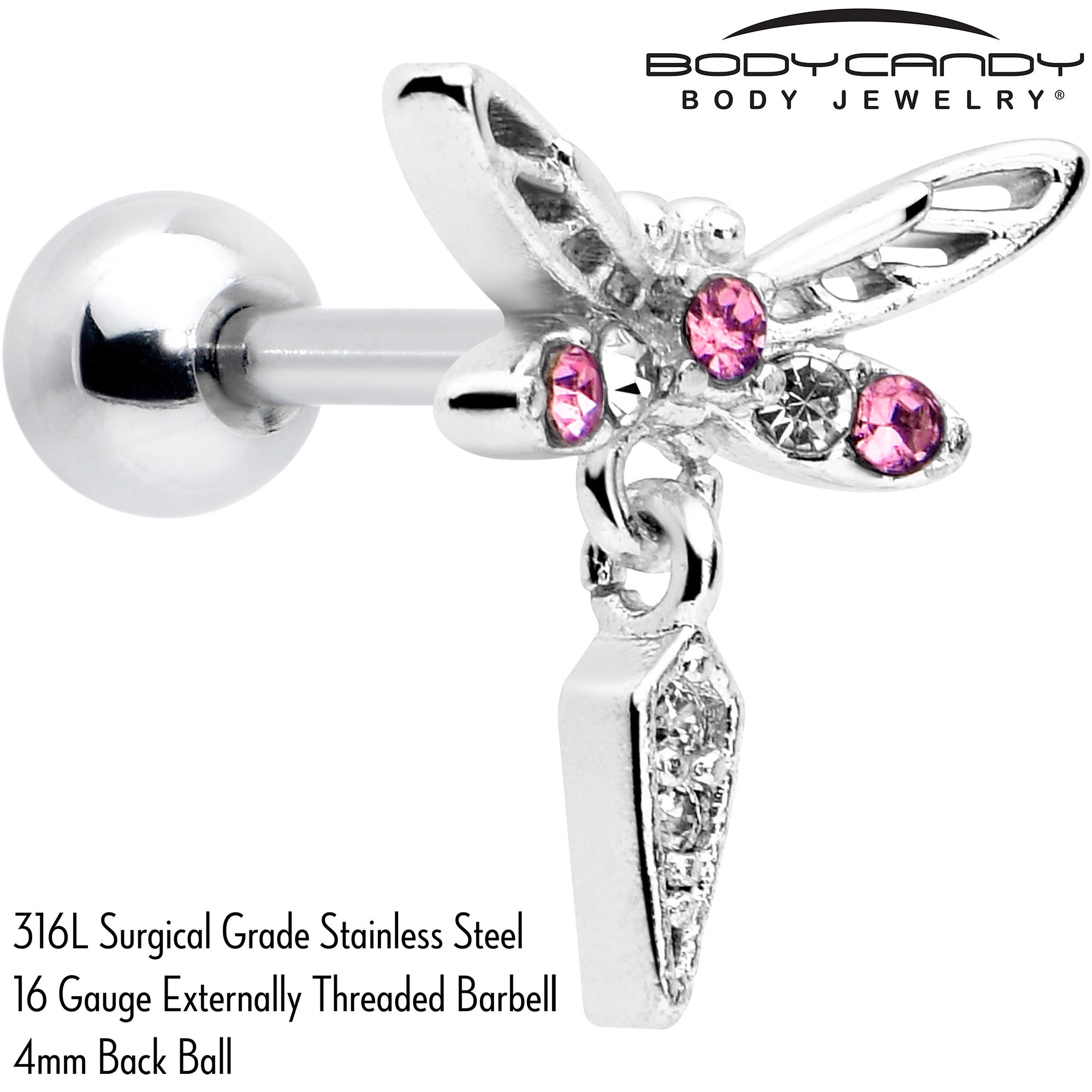 16G 1/4 Pink Gem Swank Dragonfly Dangle Cartilage Earring