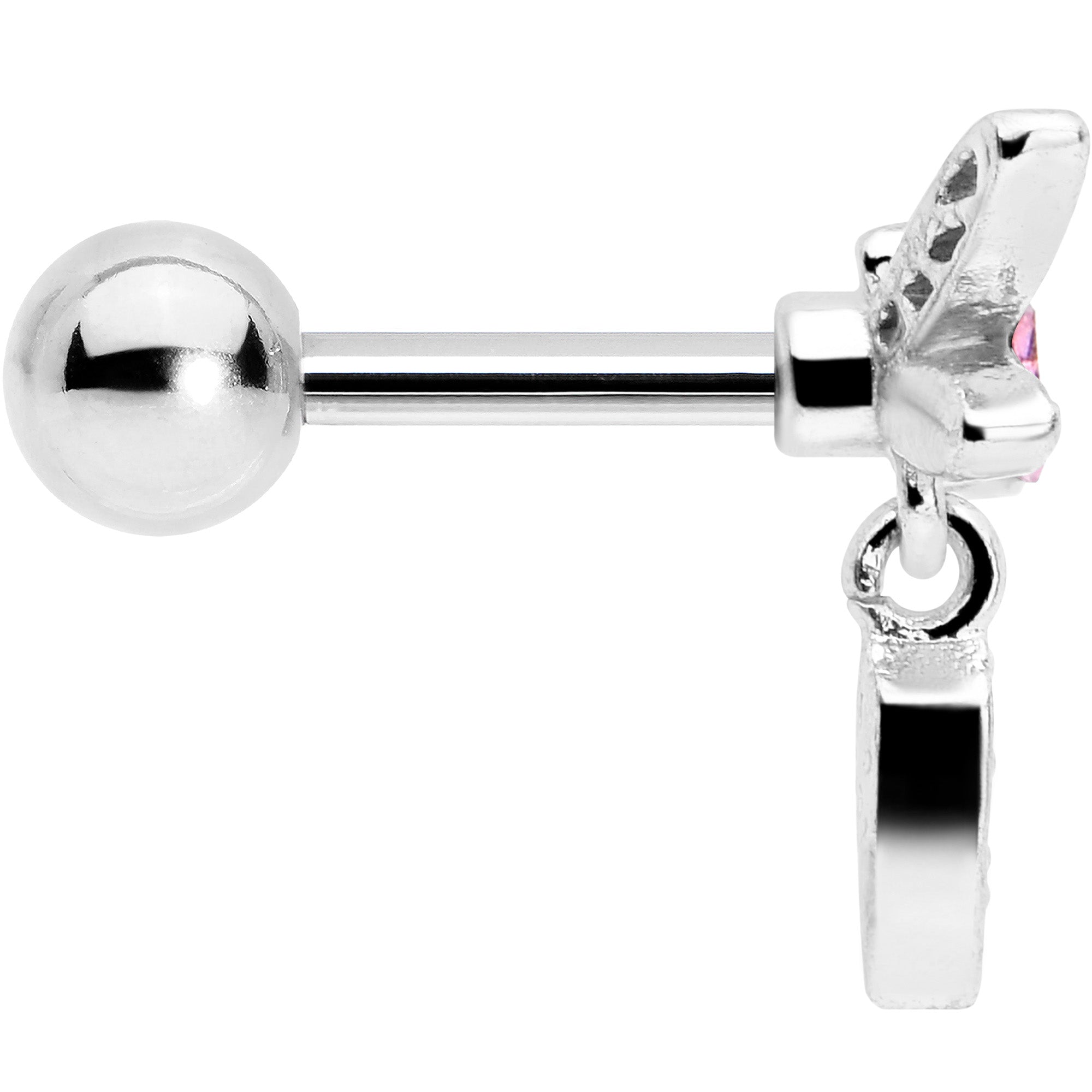 The delightful dragonfly on this 16 gauge tragus stud is so lovely it is almost magical. It is made with a 6mm durable 316L surgical grade stainless steel straight barbell with a 4mm ball end. It features a dragonfly charm, set with a pink gem body and matching pink and clear gems on the lower wings for lovely touches of color. It also features a triangular dangle tail set with clear gems for added motion and style. You can even rock it in multiple piercings including tragus, helix, and some conch piercings. Give your look a touch of nature with this delicious dragonfly cartilage piercing jewelry.