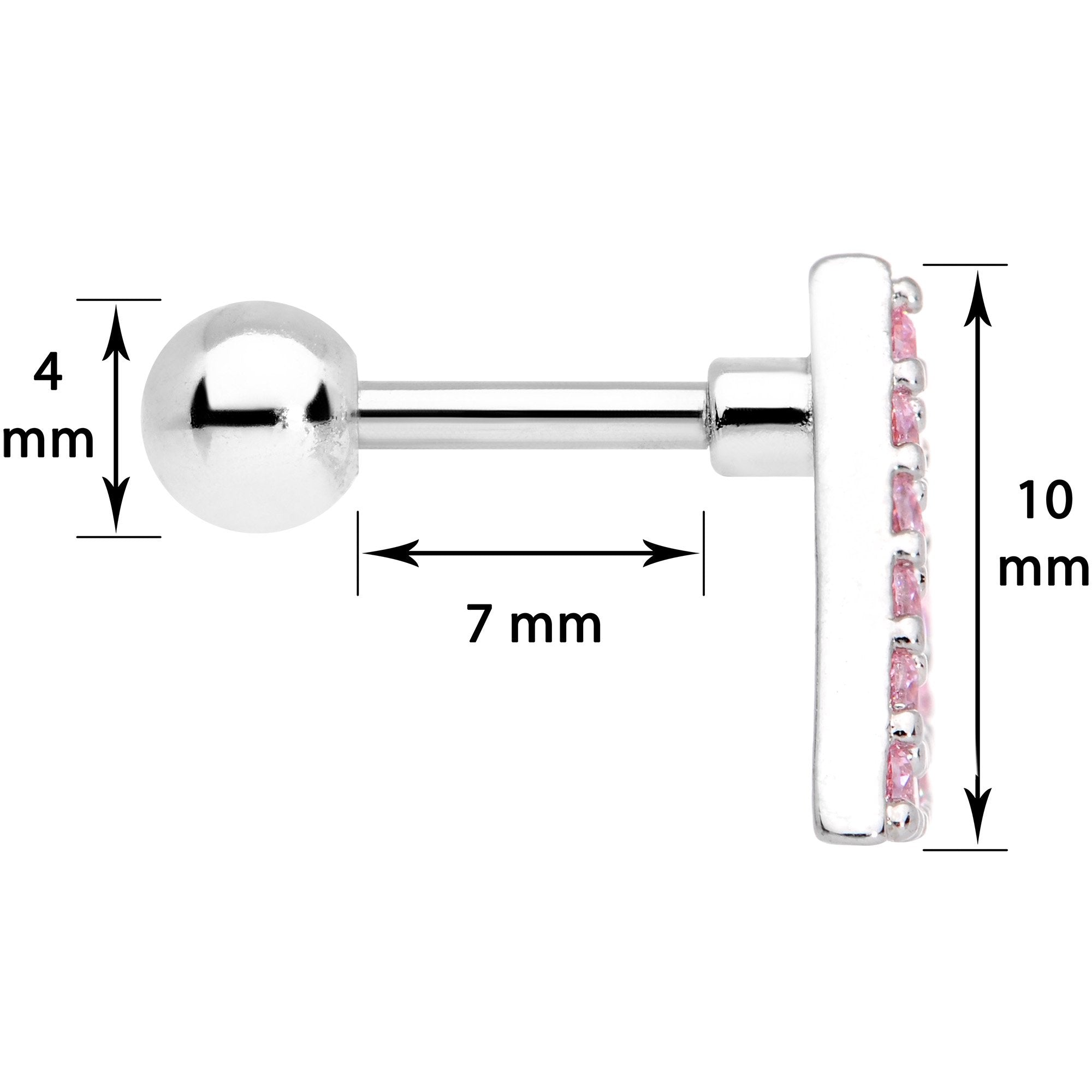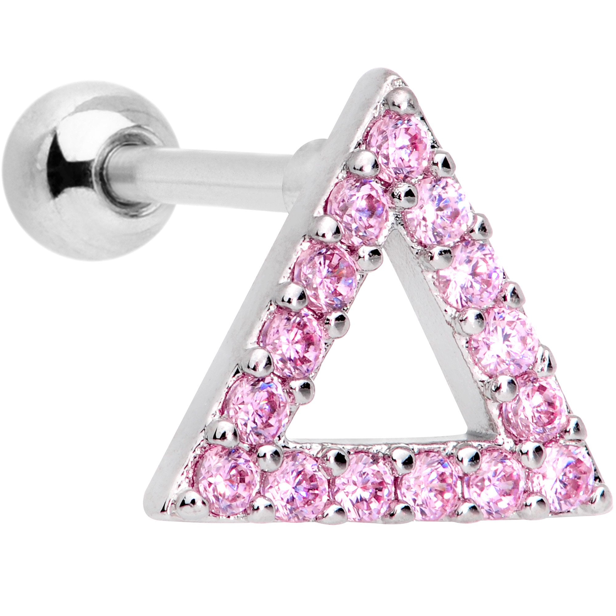 Whether you are curating the perfect pierced cartilage look or just love something unique this 16 gauge cartilage piercing is a perfect choice for you. Made with 6mm durable 316L surgical grade stainless steel straight barbells, this tragus jewelry features a cutout triangle charm framed with pink gems.