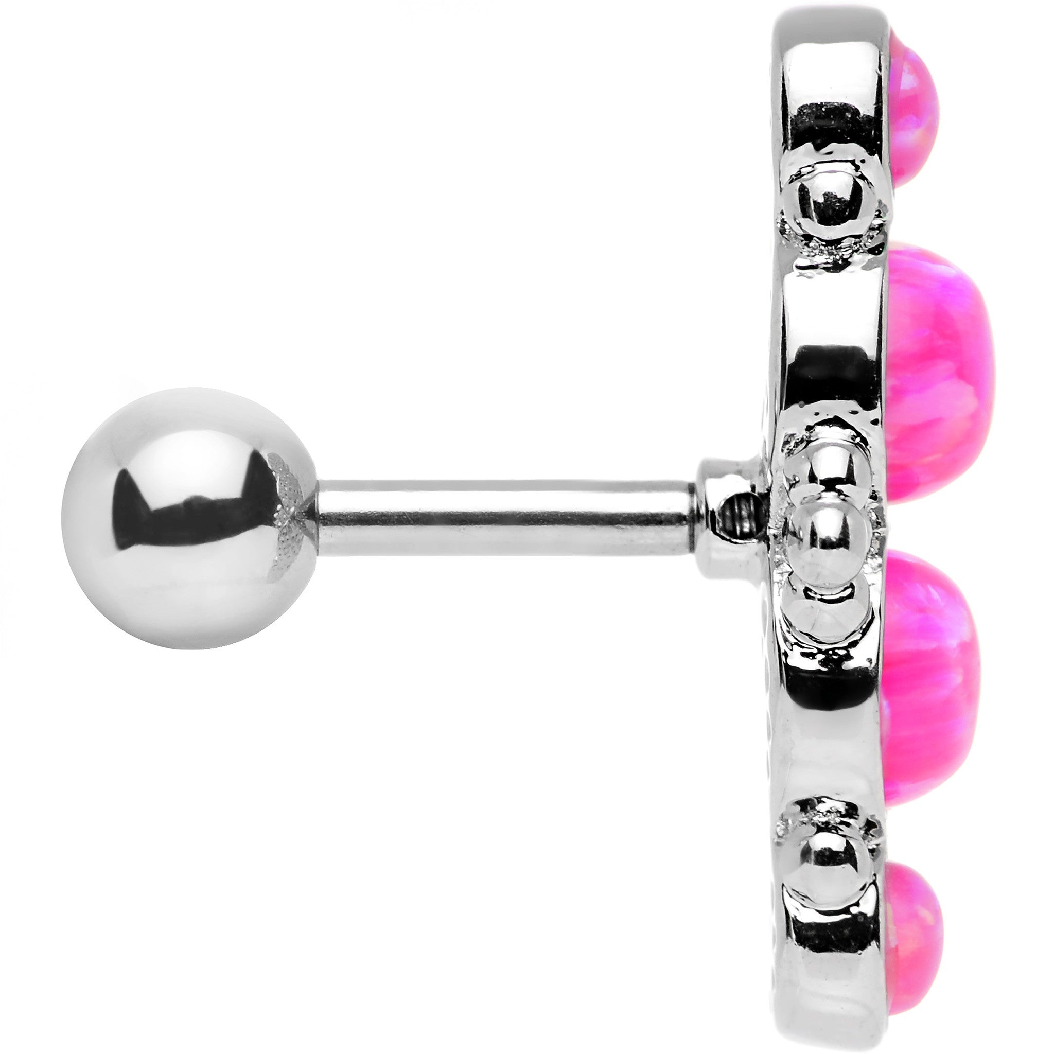 You'll never find yourself lacking mystical sparkle when you are wearing this cartilage earring. This 16 gauge barbell earring features a line of four pink synthetic opals captured within an interesting and ornate setting. The 1/4" straight barbell of this jewelry is made from 316L surgical grade stainless steel for a secure fit.